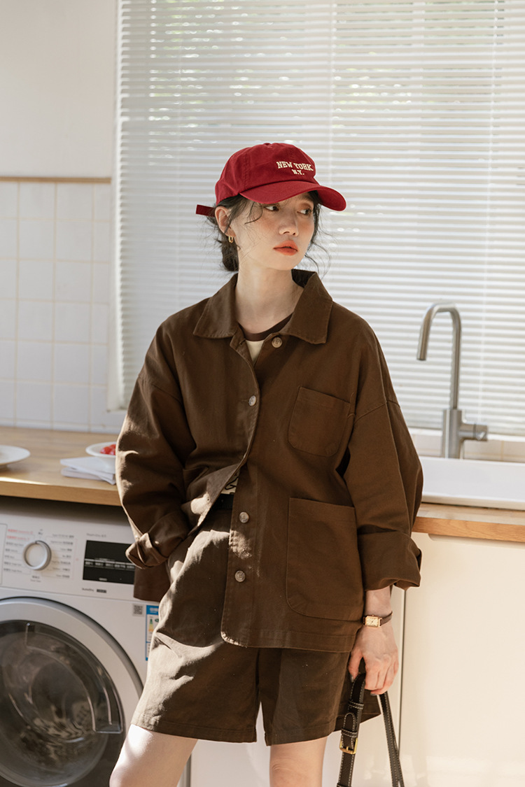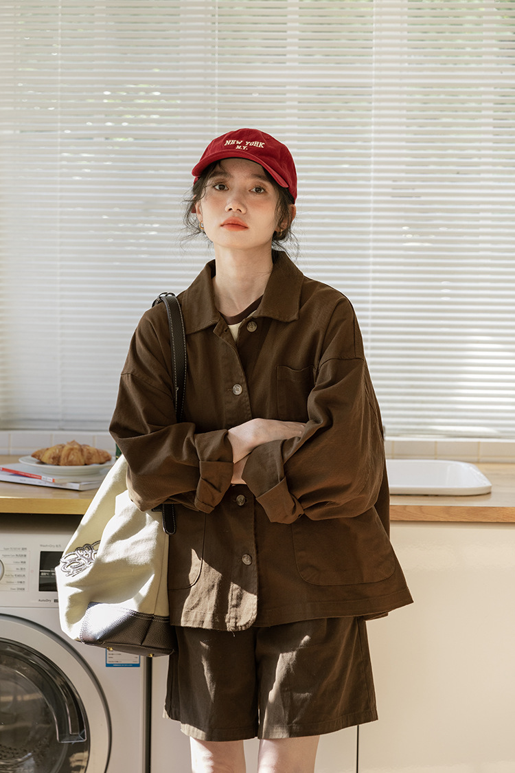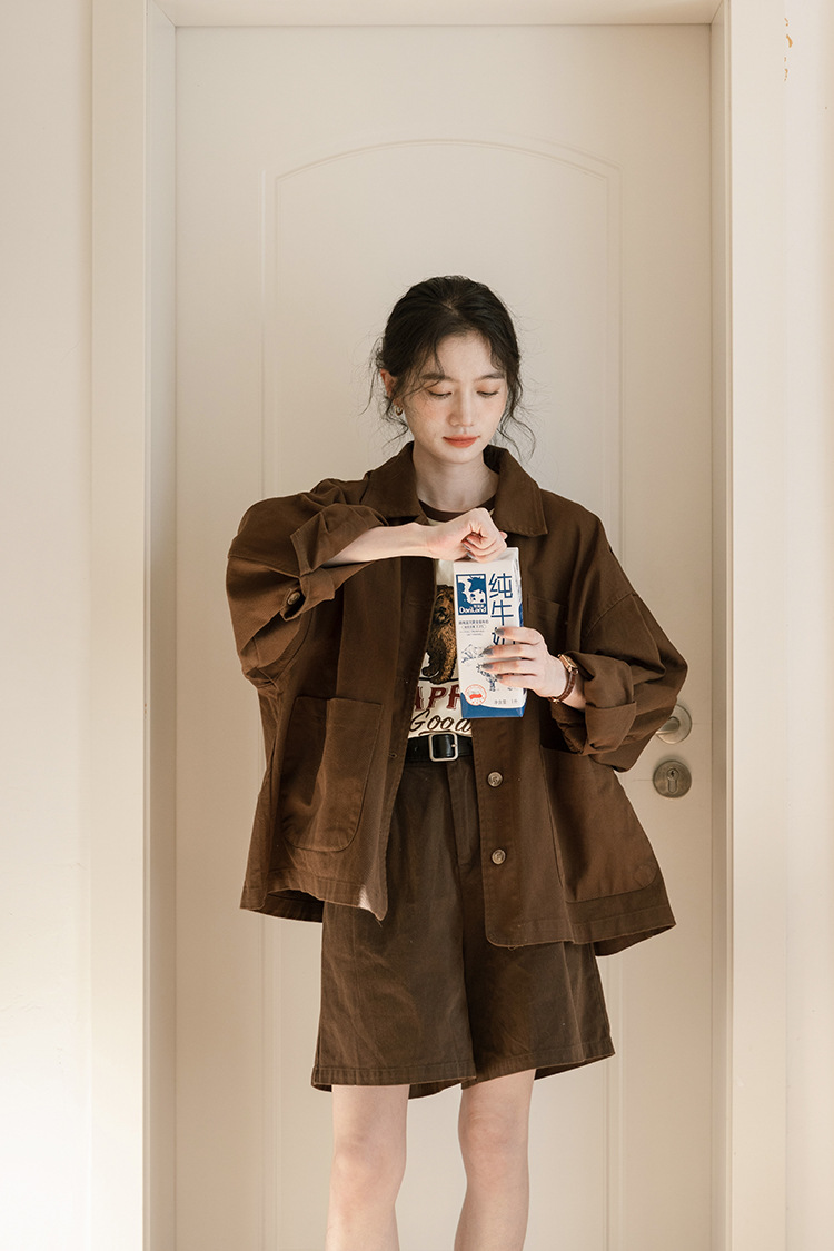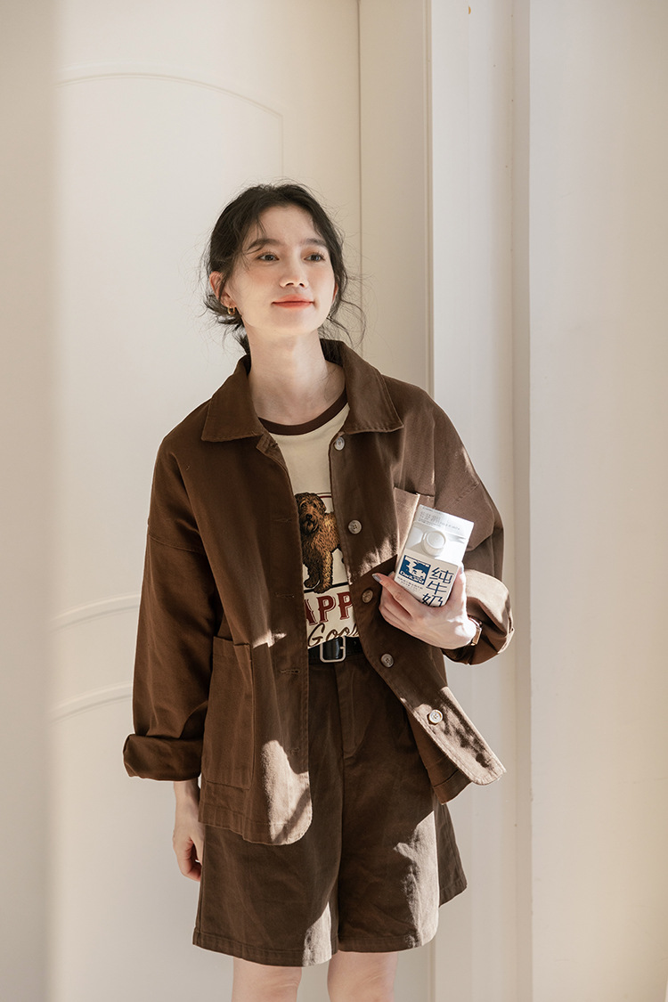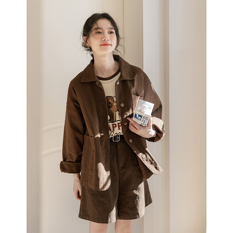 가을 2024 새로운 스타일 일본 스타일 캐주얼 인 루즈 레트로 한국 스타일 세척 코튼 커피 스타일 작업복 코트 여성 유행스토어 가기