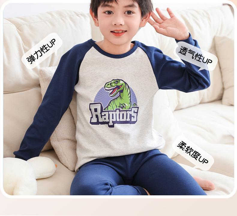 • BE 면 가을 옷 세트, 전체에 프린트된 진한 파란색 공룡