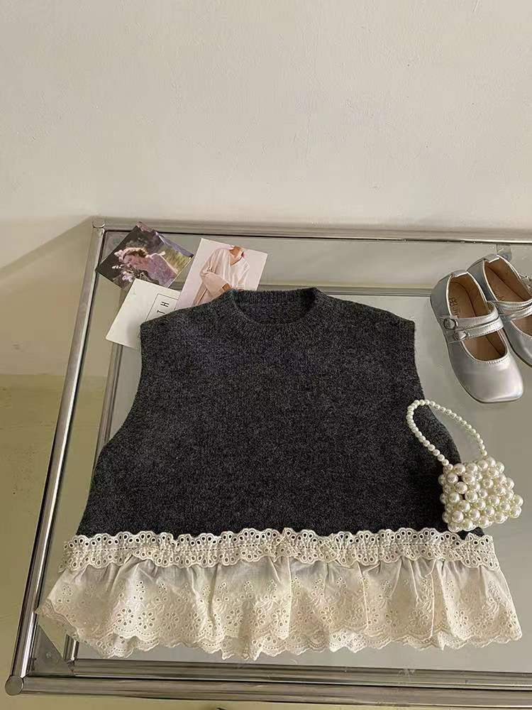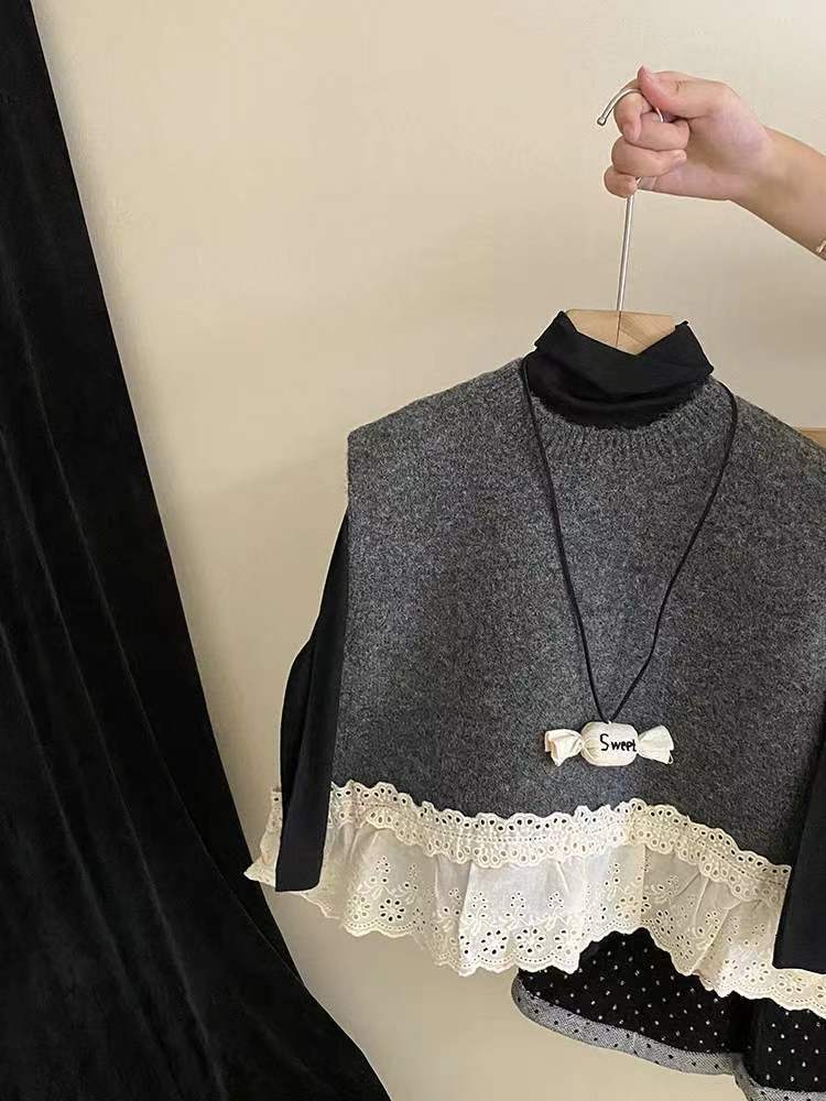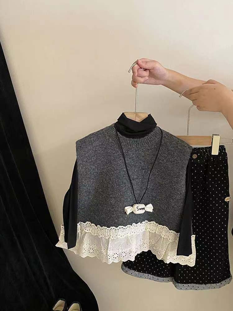 소녀 세트 2024 가을 의류 아기 소녀의 레이스 조끼 베이스 셔츠 웨이브 포인트 넓은 다리 바지 3 조각 세트