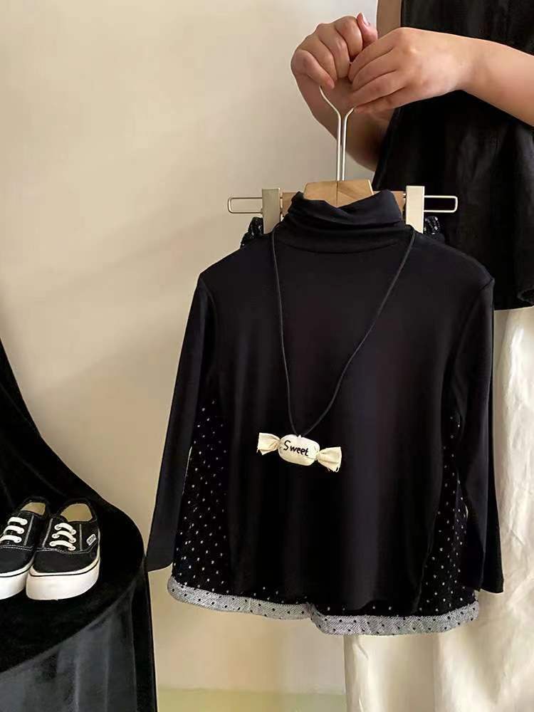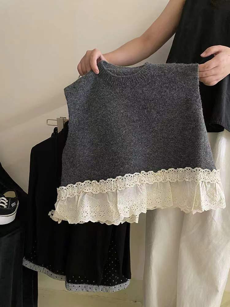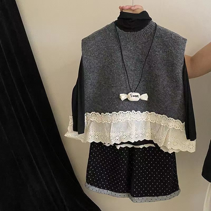 소녀 세트 2024 가을 의류 아기 소녀의 레이스 조끼 베이스 셔츠 웨이브 포인트 넓은 다리 바지 3 조각 세트스토어 가기
