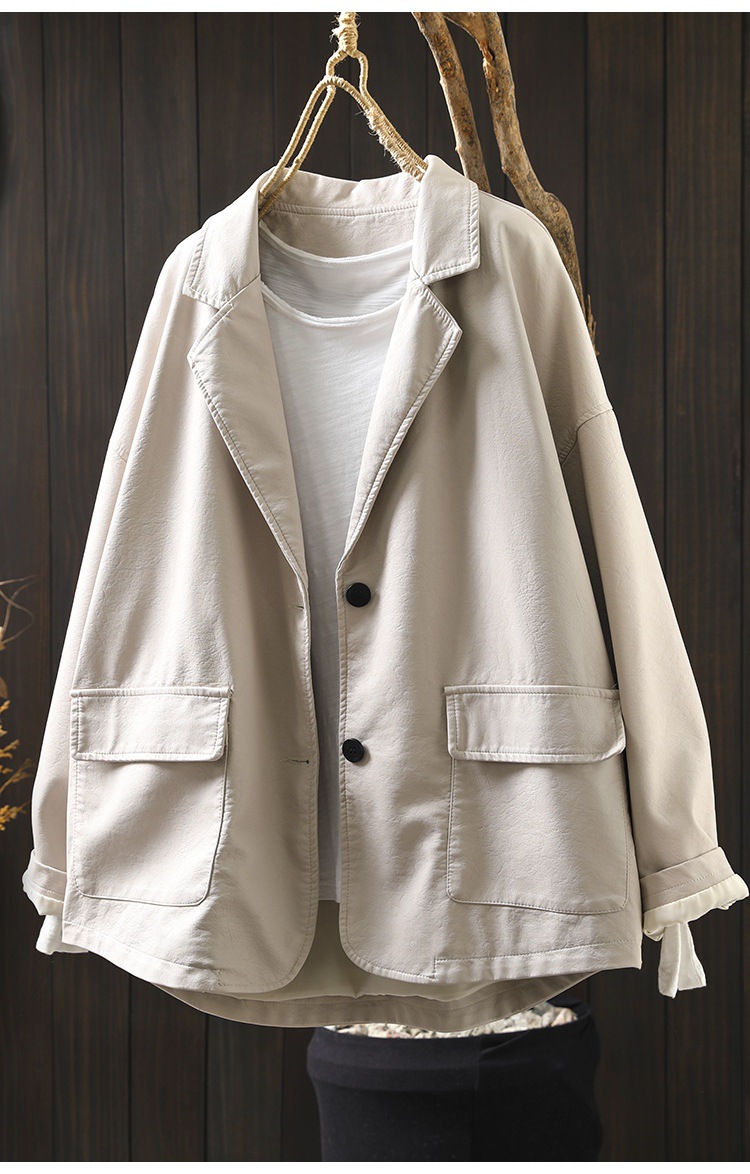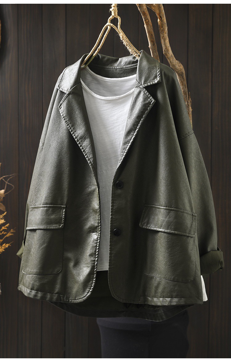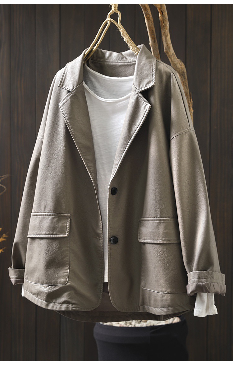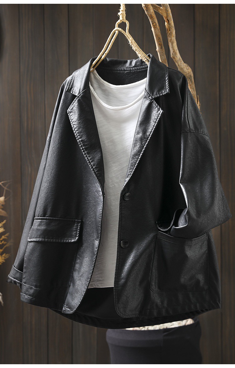 西装领软皮pu皮衣外套女宽松大码春秋新休闲百搭双口袋夹克高级感