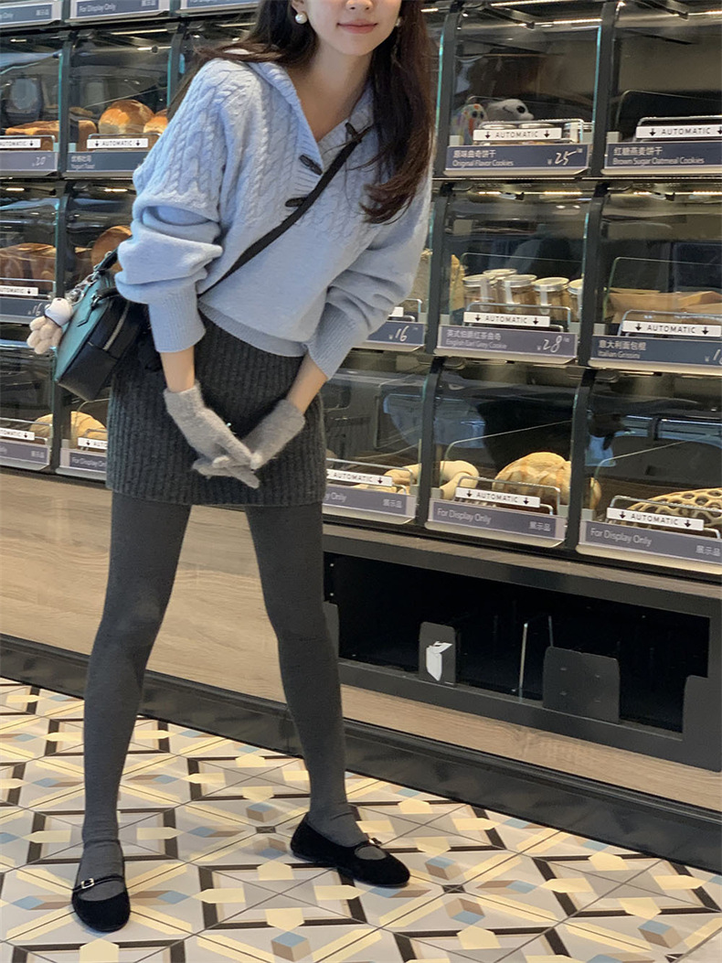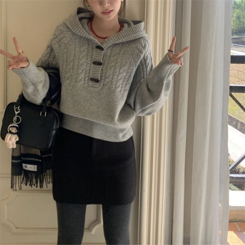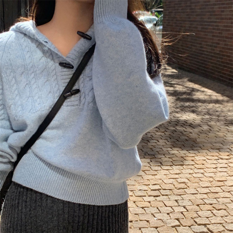 뿔 단추 후드 트위스트 니트 여성용 2025 가을 겨울 신상 한국 스타일 레트로 분위기의 여유로운 니트 상의스토어 가기