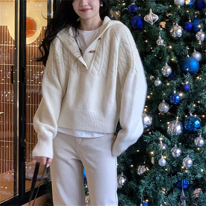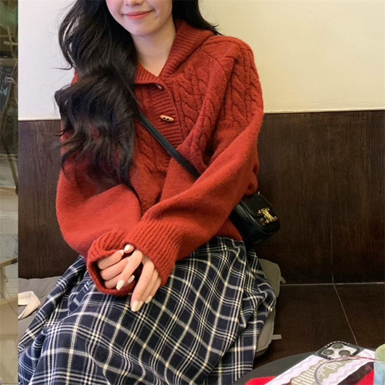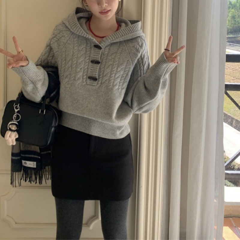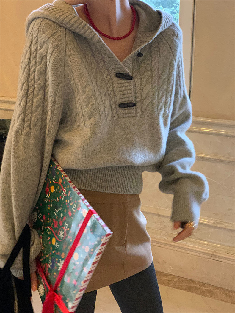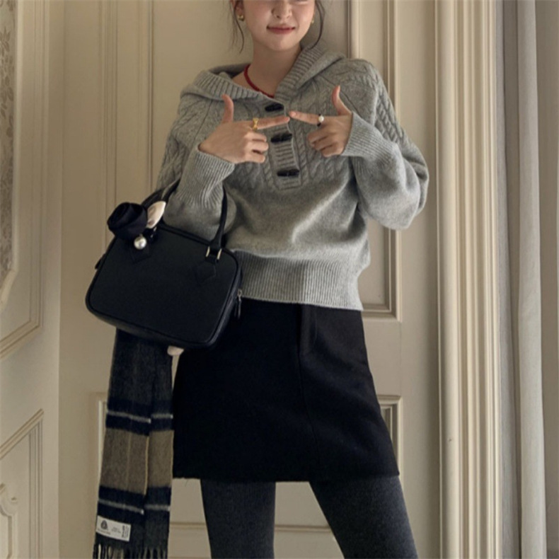 뿔 단추 후드 트위스트 니트 여성용 2025 가을 겨울 신상 한국 스타일 레트로 분위기의 여유로운 니트 상의