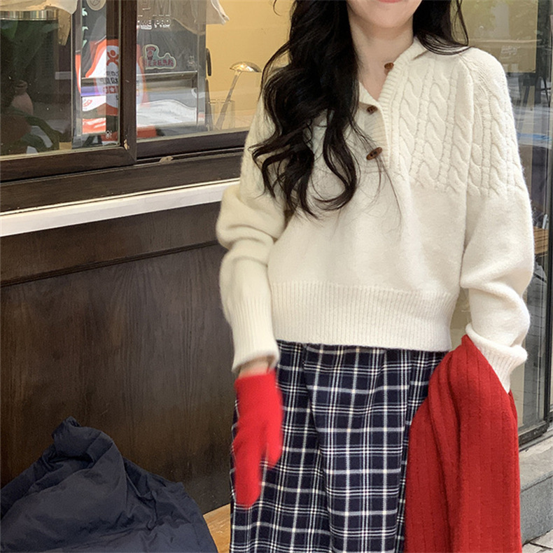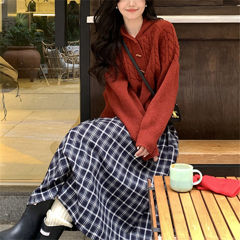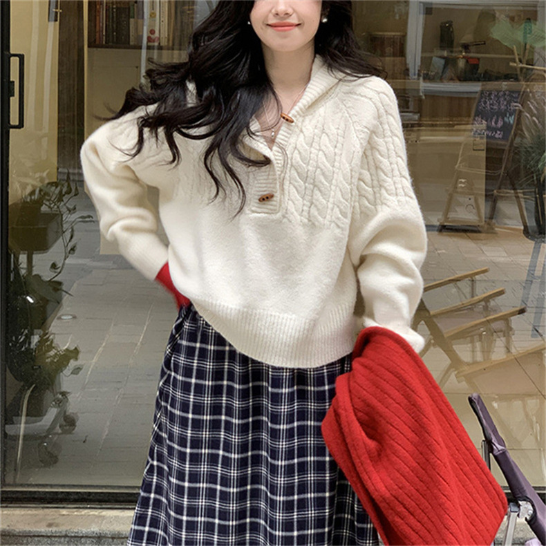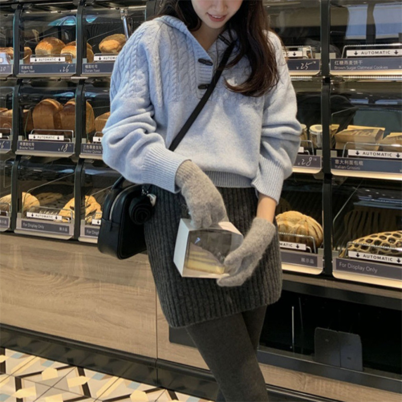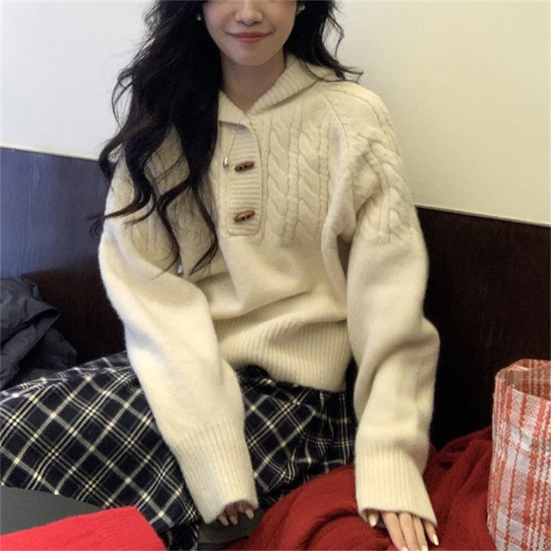 뿔 단추 후드 트위스트 니트 여성용 2025 가을 겨울 신상 한국 스타일 레트로 분위기의 여유로운 니트 상의