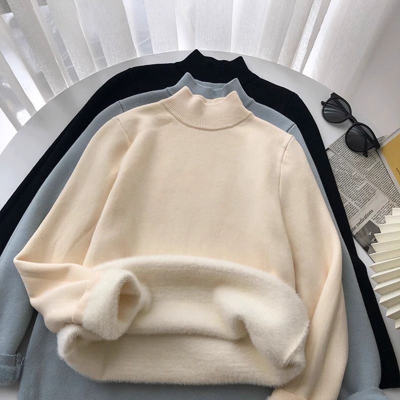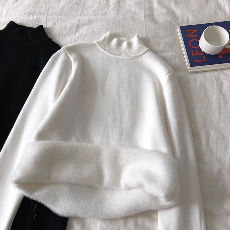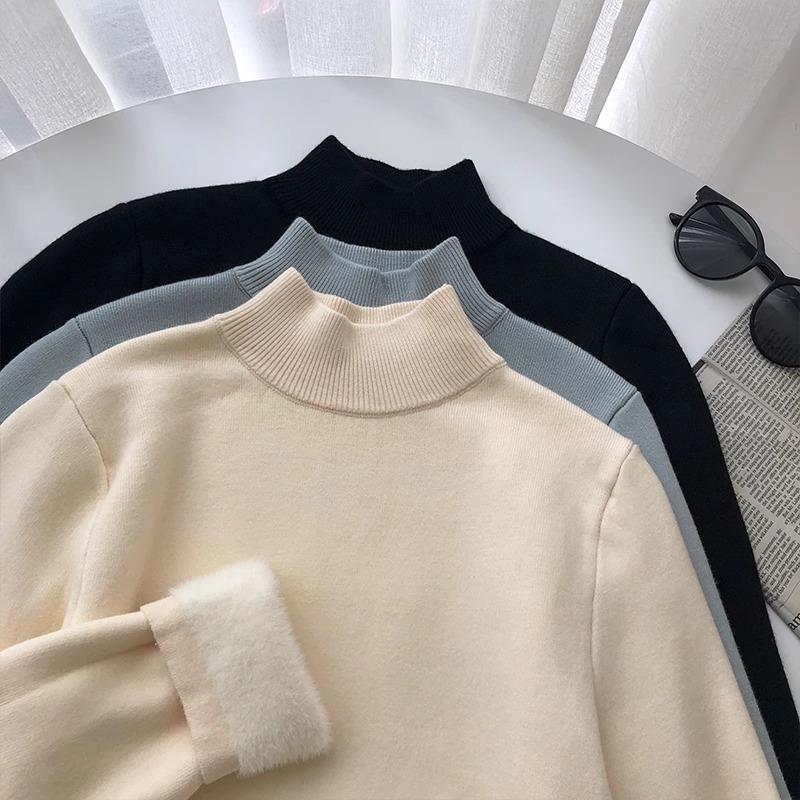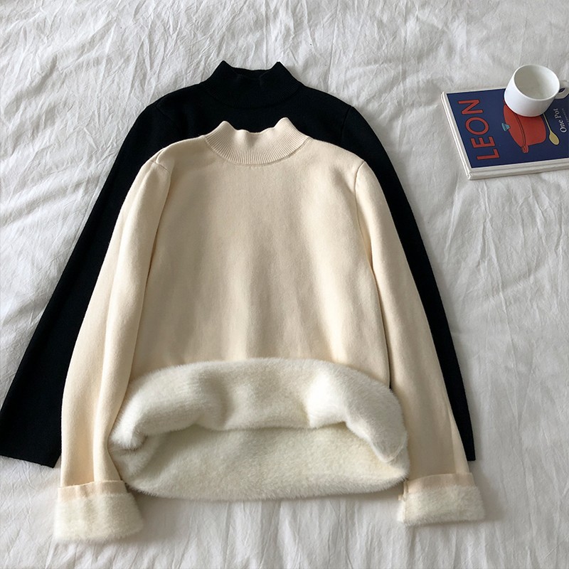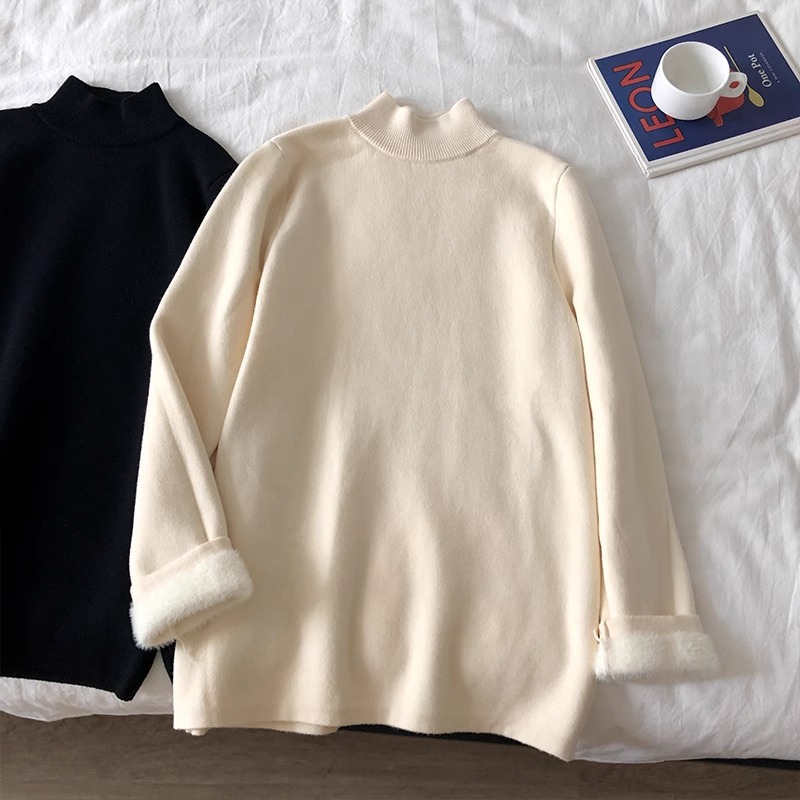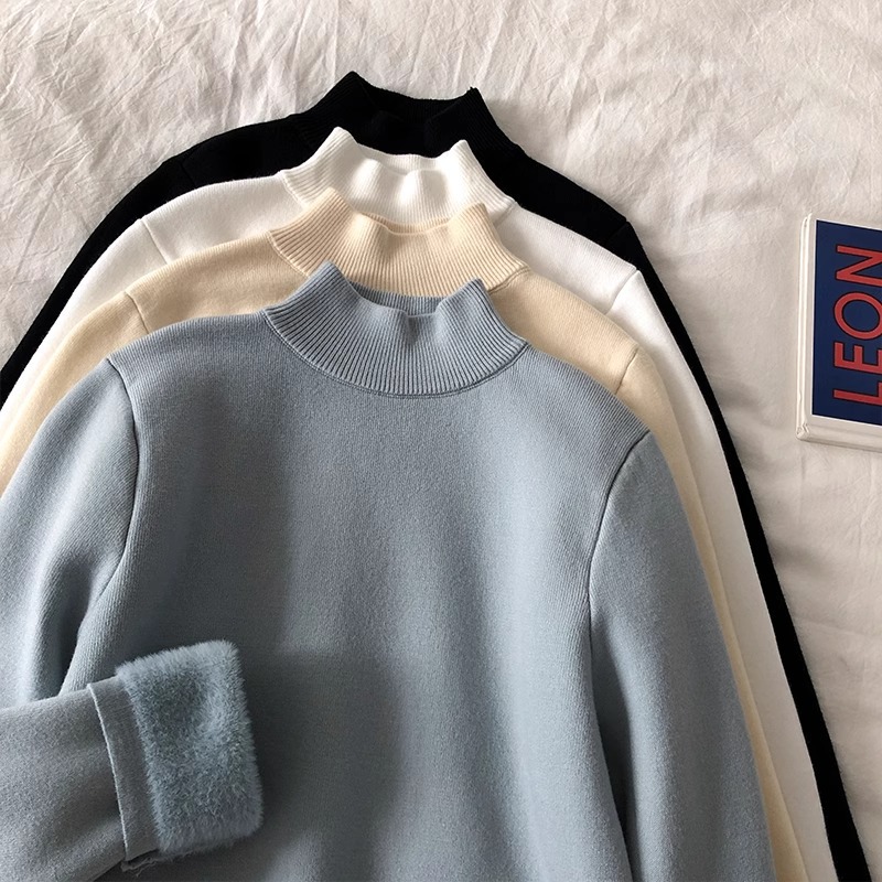 하프 하이 칼라 원피스 벨벳 기모 두꺼운 스웨터 탑 여성의 겨울 새로운 긴 소매 스웨터 풀오버 따뜻한 내부
