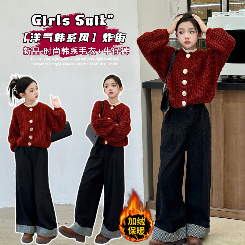 여아용 스웨터 재킷 가을 겨울 2025 신상 한국 스타일 패셔너블 가디건 중대형 아동용 플리스 안감 와이드 레그 스트레이트 데님 팬츠