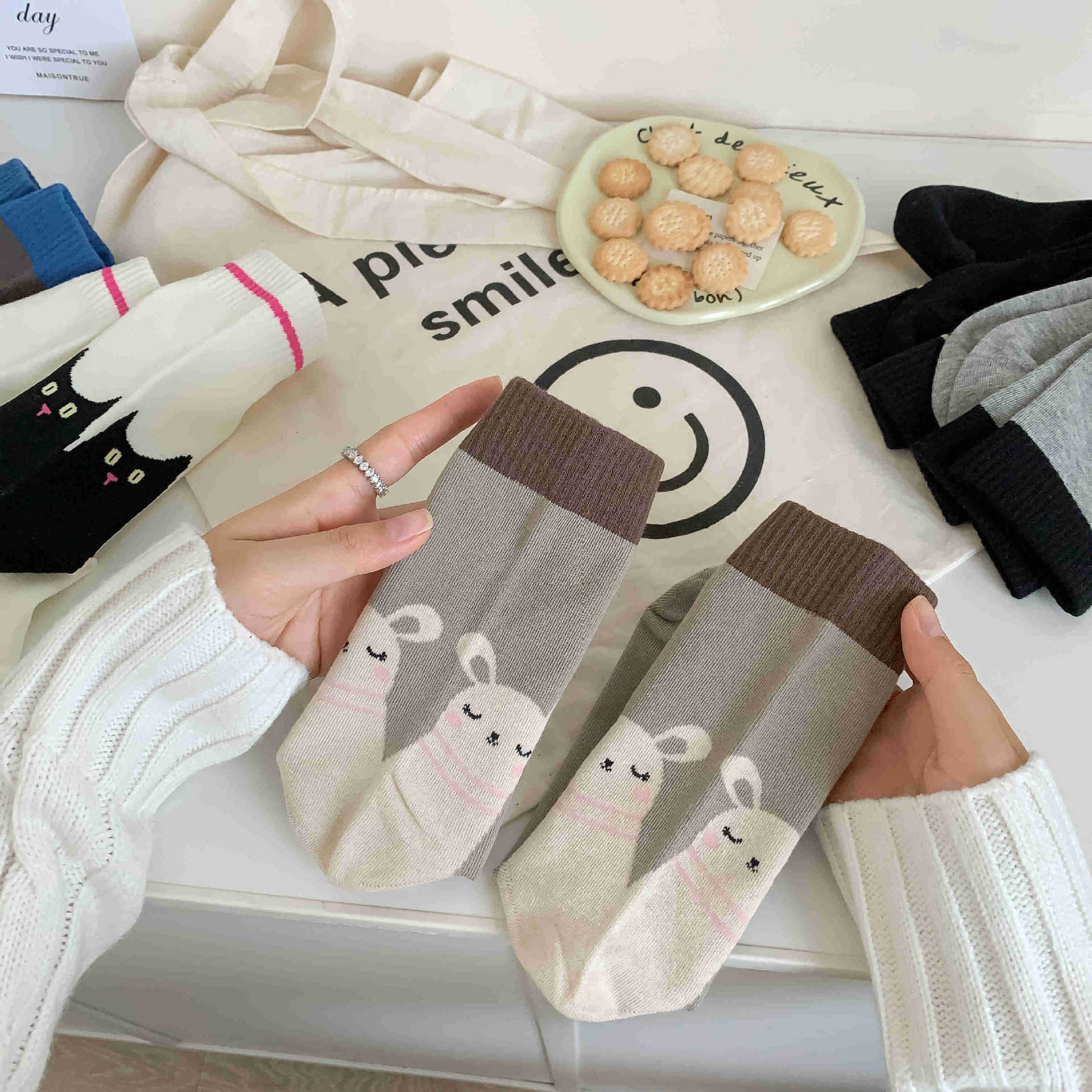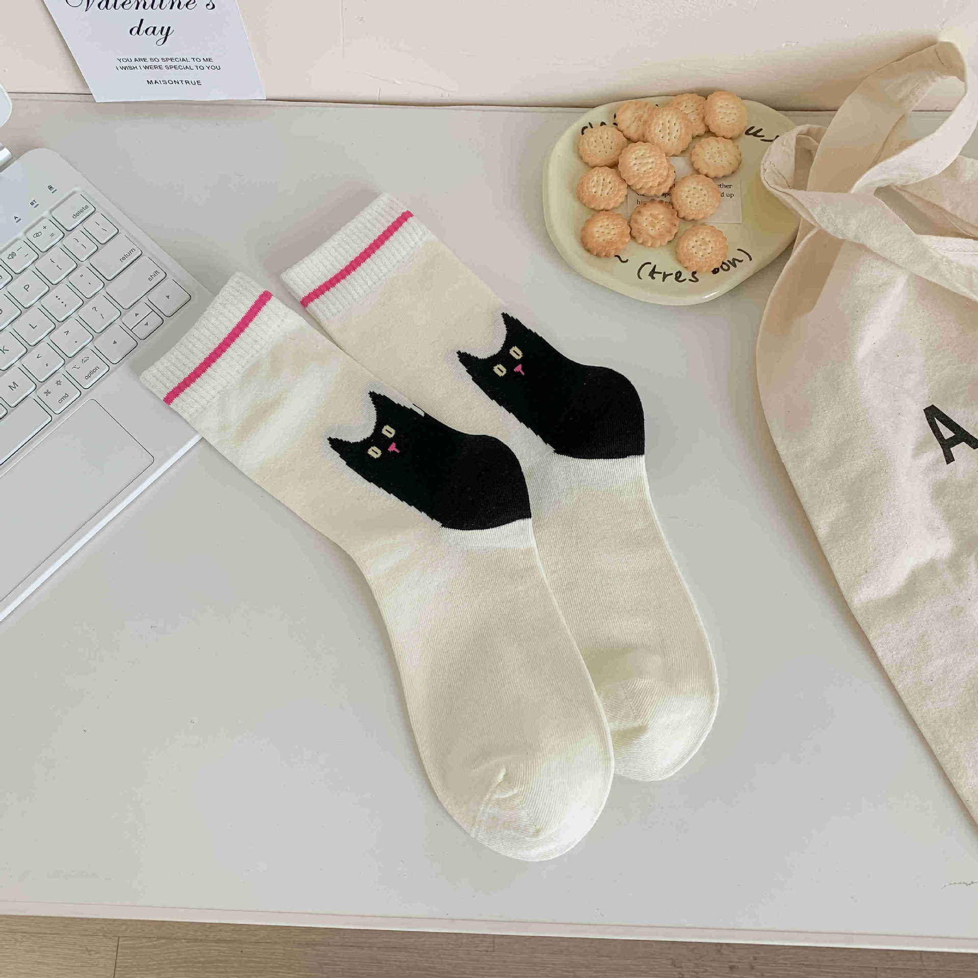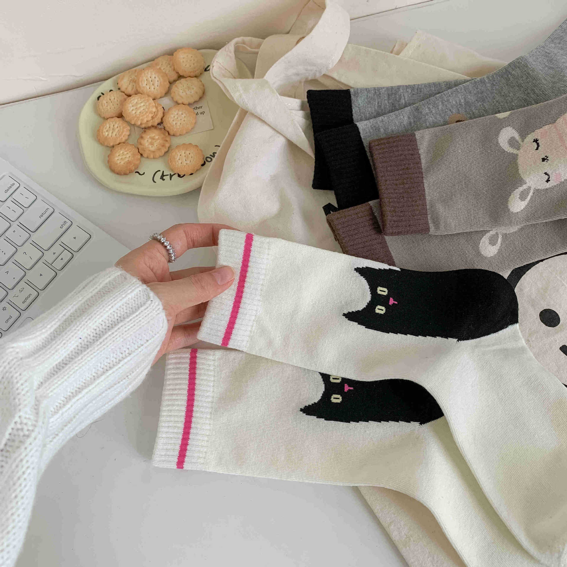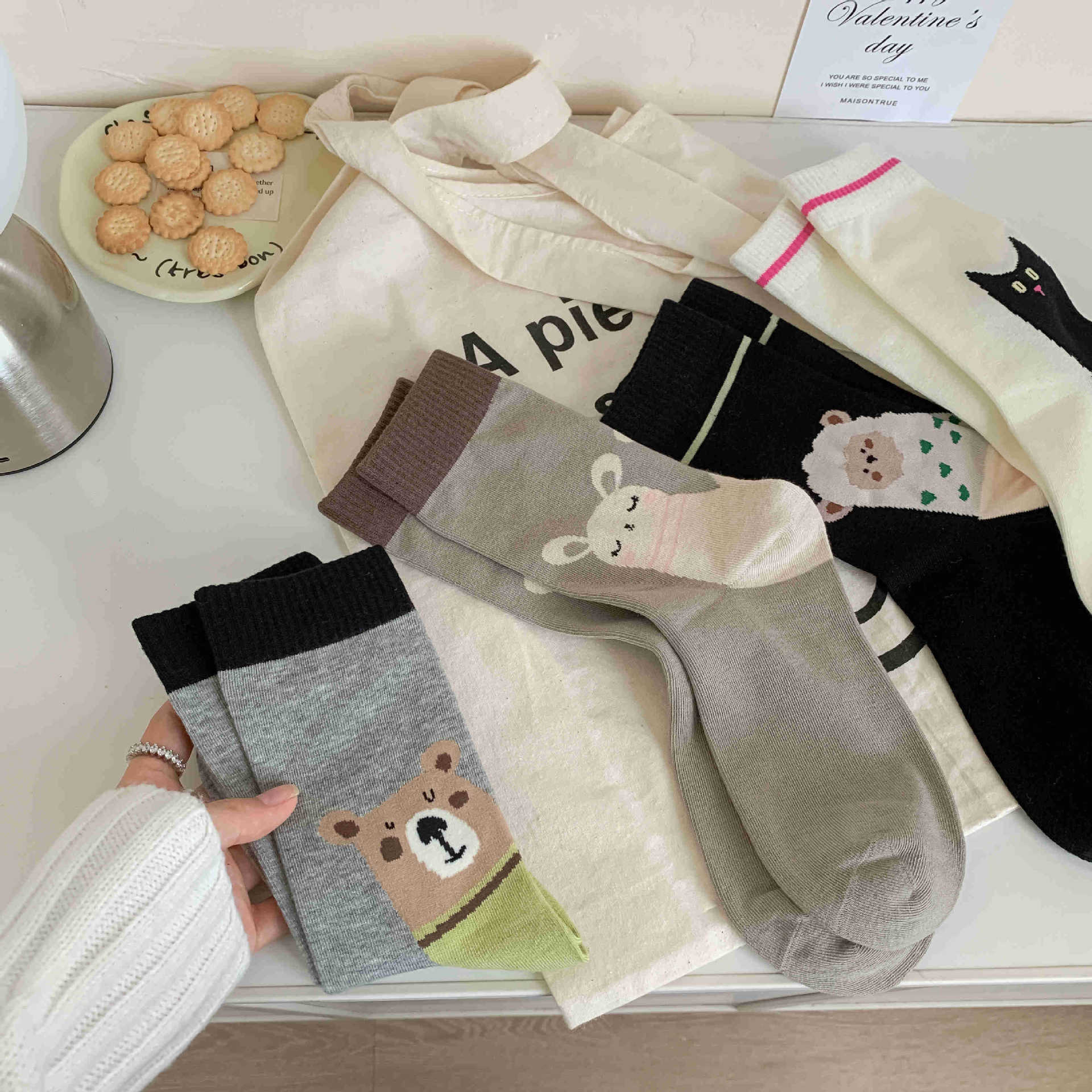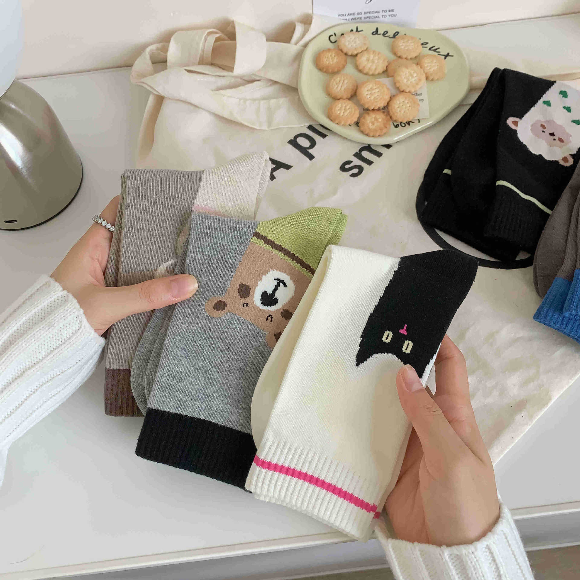화이트 양말 여성의 재미 일러스트 미드 양말 Ins 트렌디 한 일본 스타일 귀여운 만화 키티 베어 성격스토어 가기