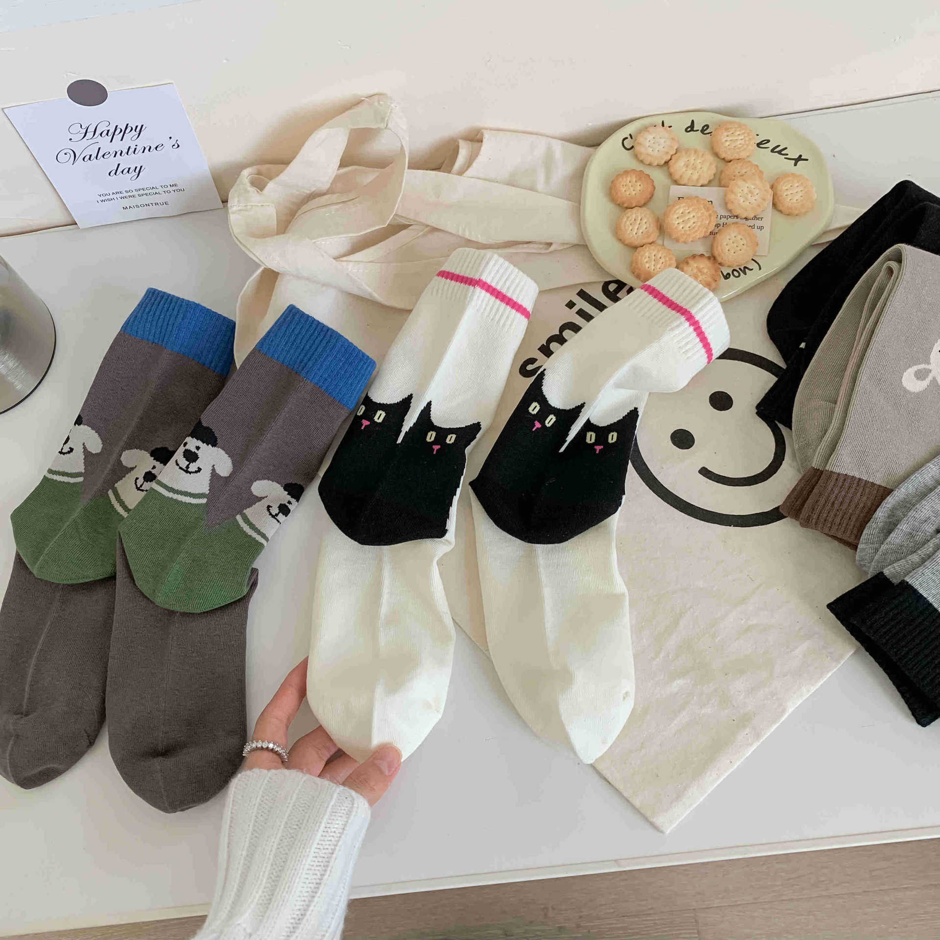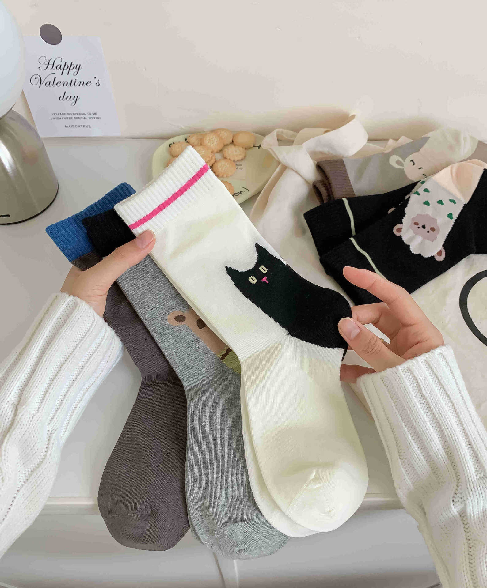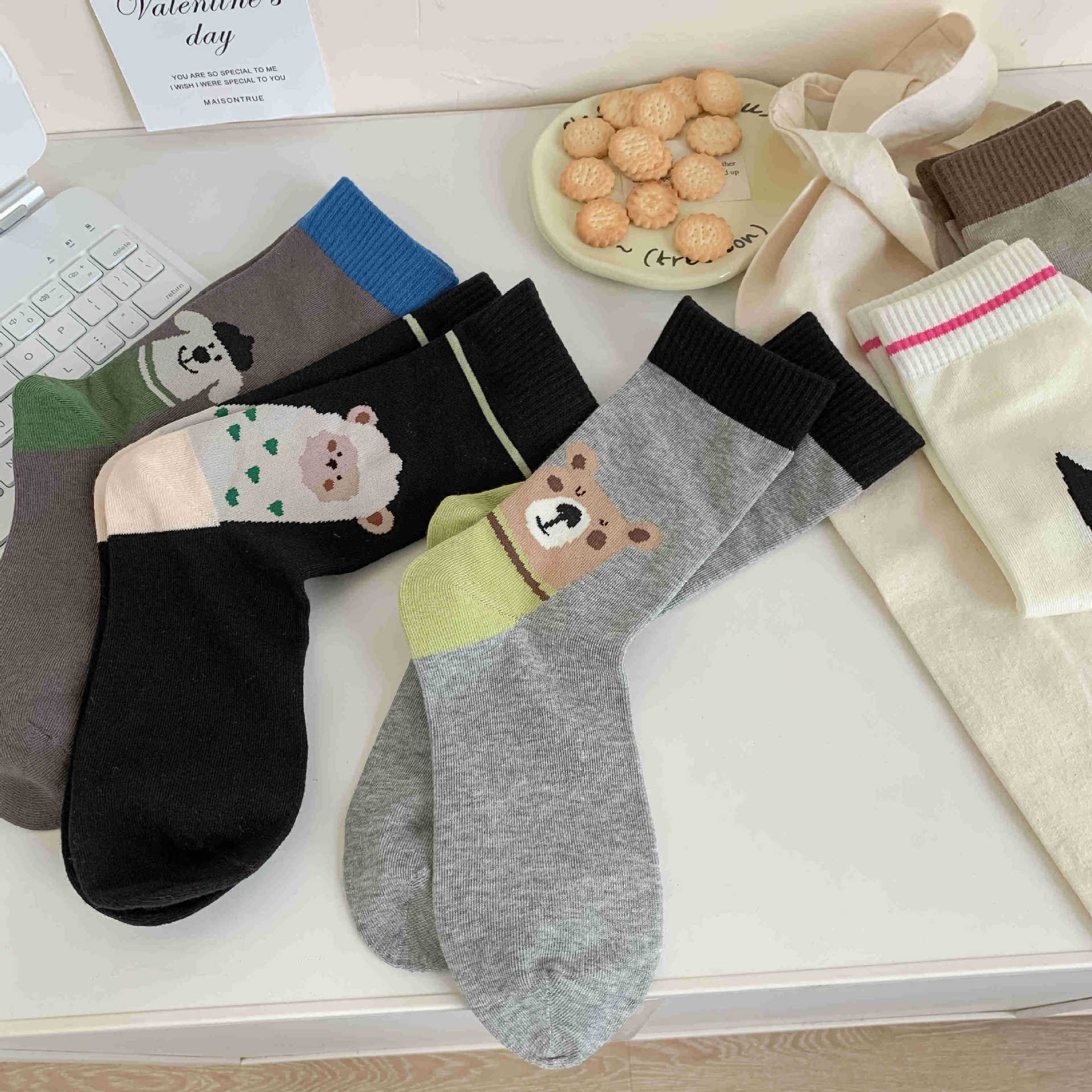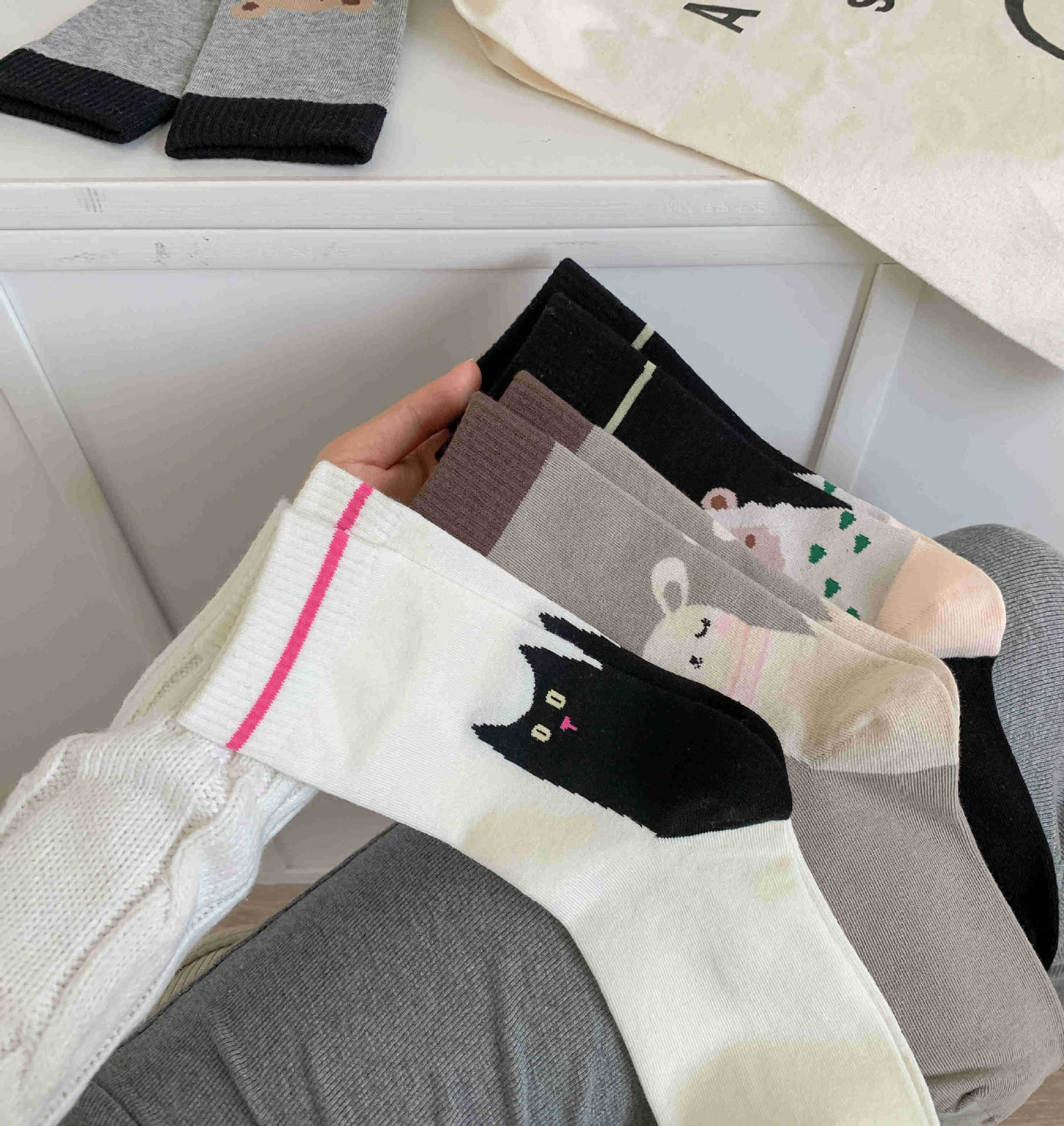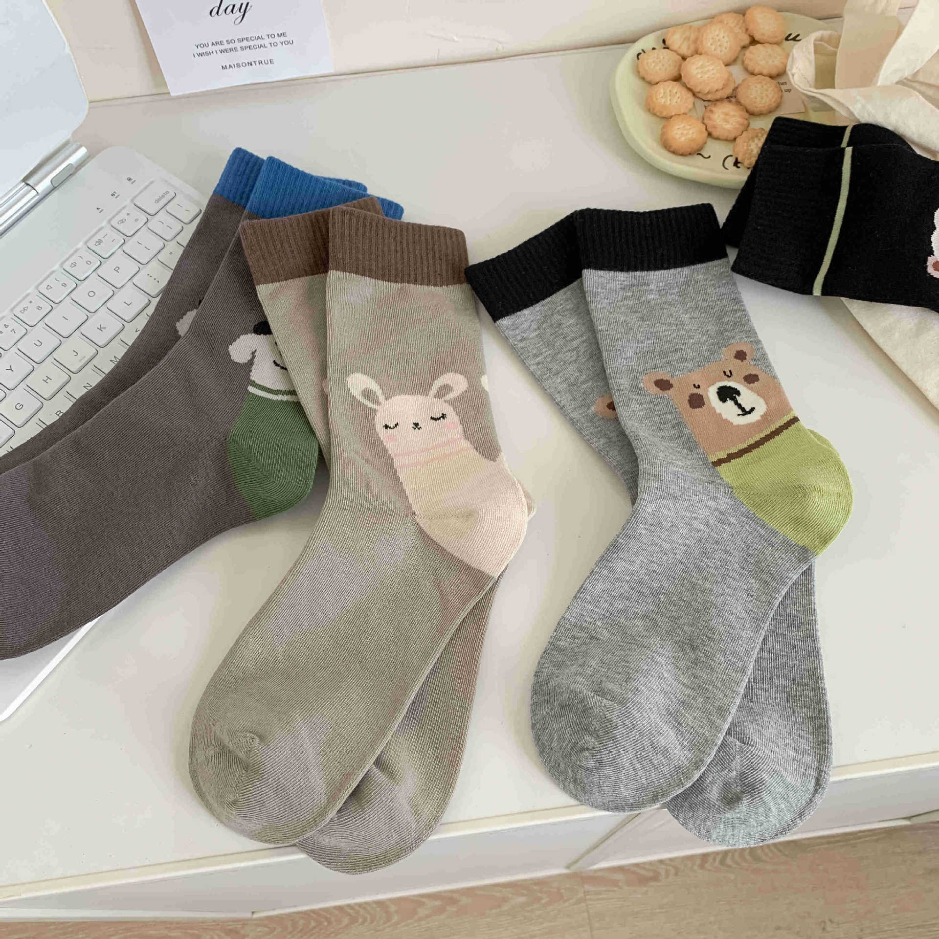 화이트 양말 여성의 재미 일러스트 미드 양말 Ins 트렌디 한 일본 스타일 귀여운 만화 키티 베어 성격스토어 가기