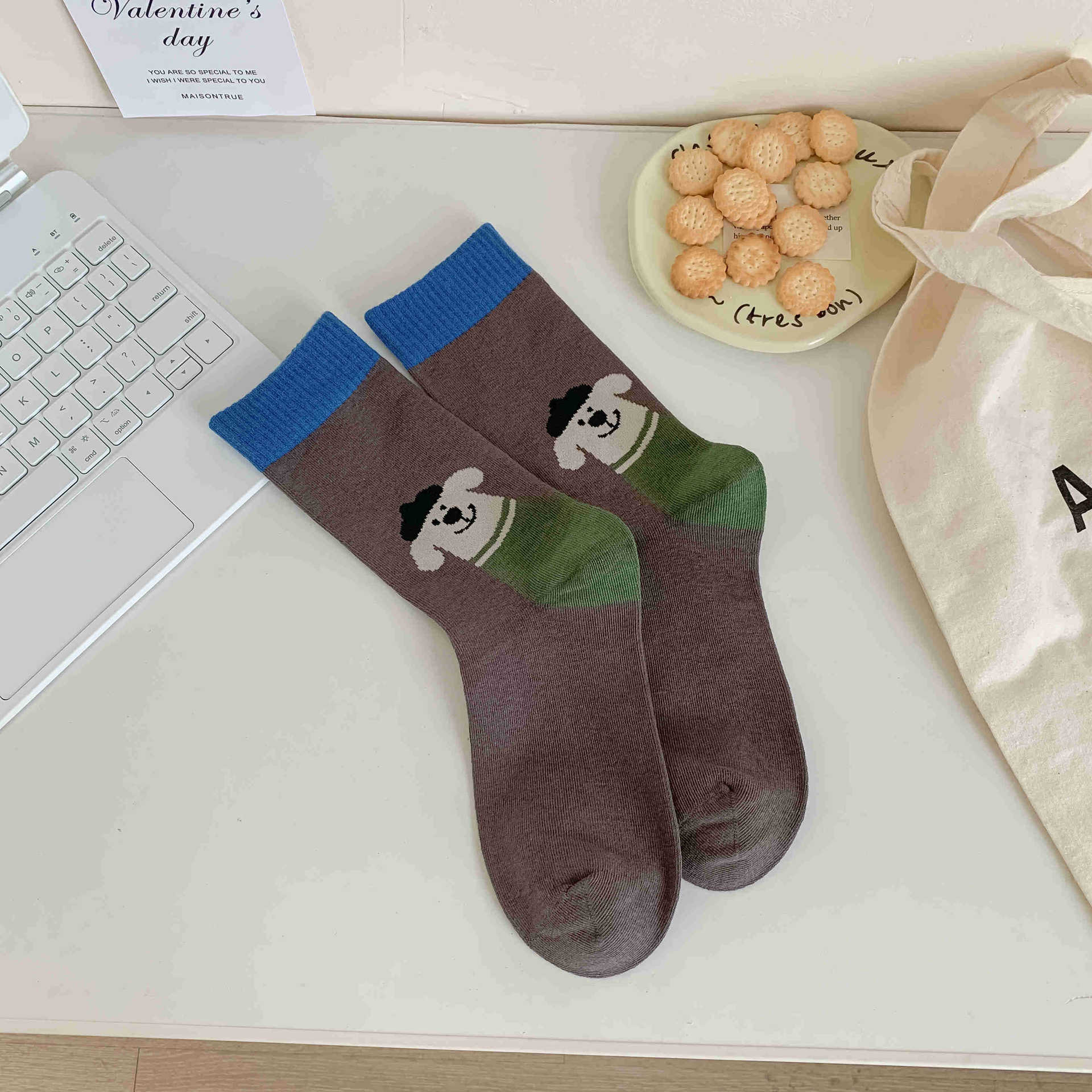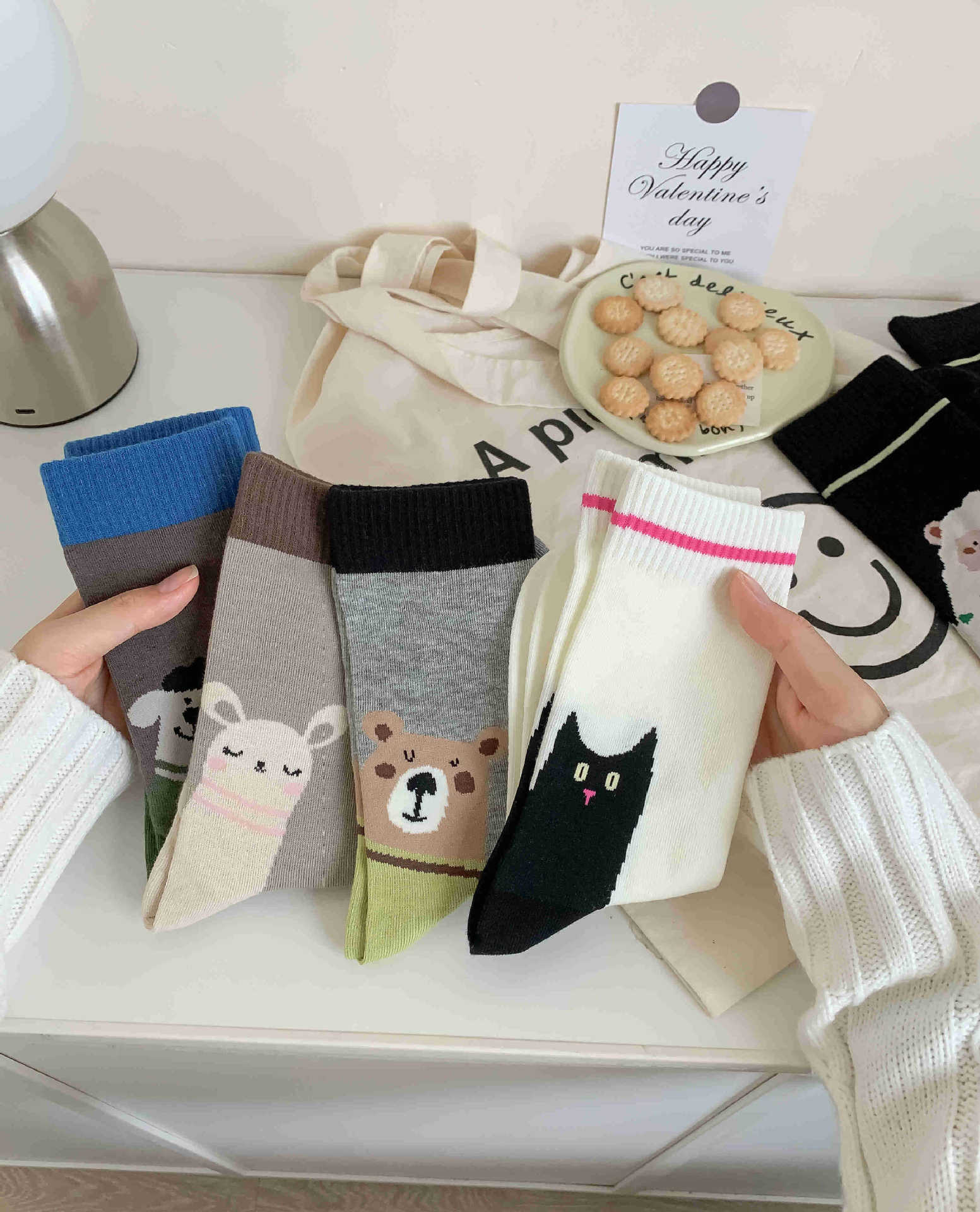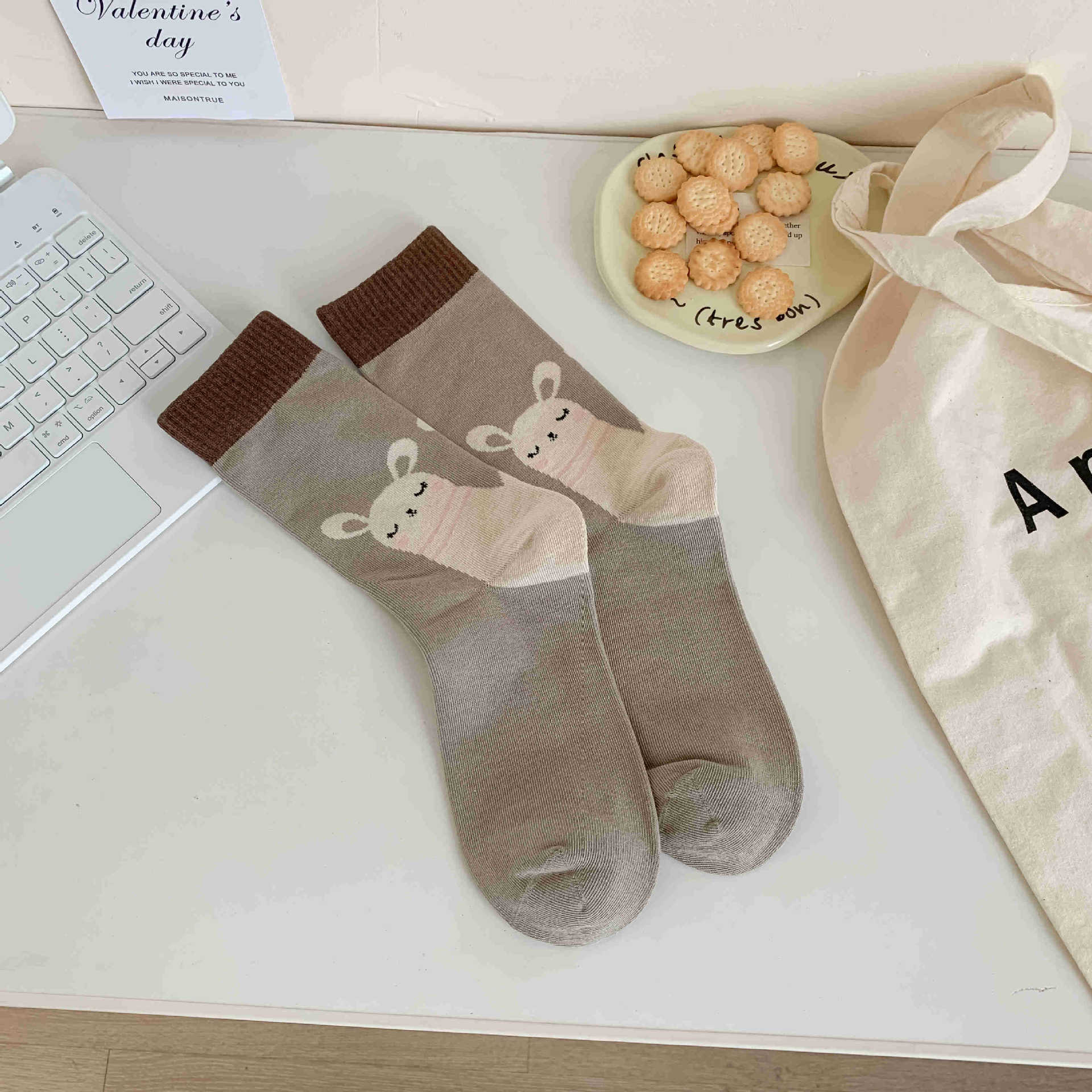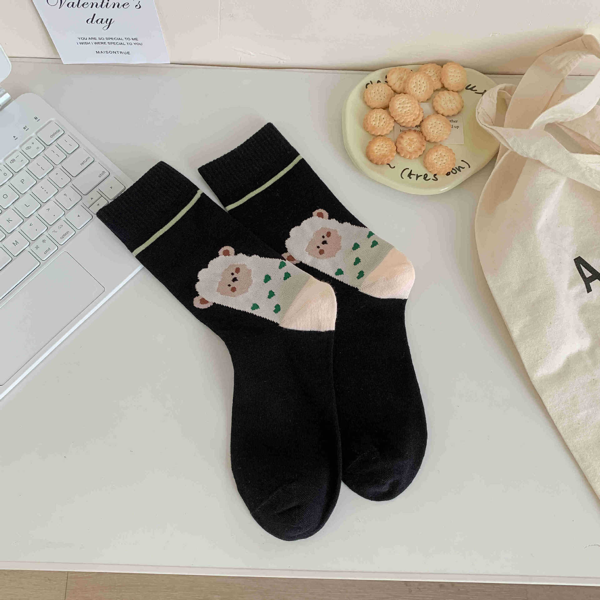 화이트 양말 여성의 재미 일러스트 미드 양말 Ins 트렌디 한 일본 스타일 귀여운 만화 키티 베어 성격
