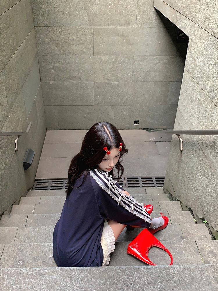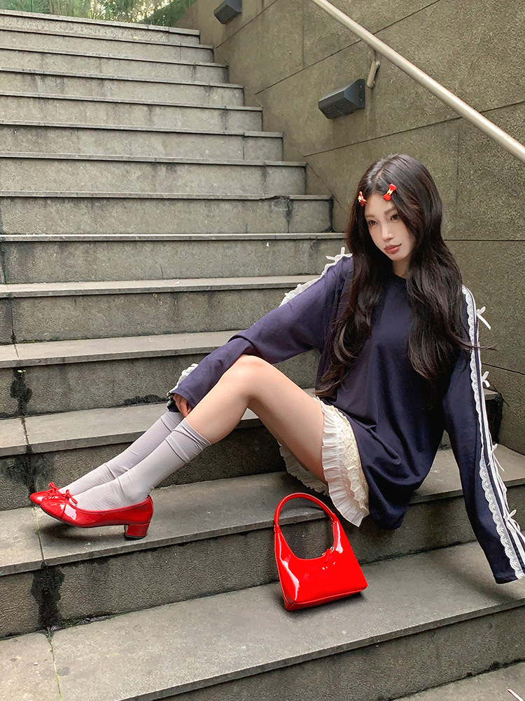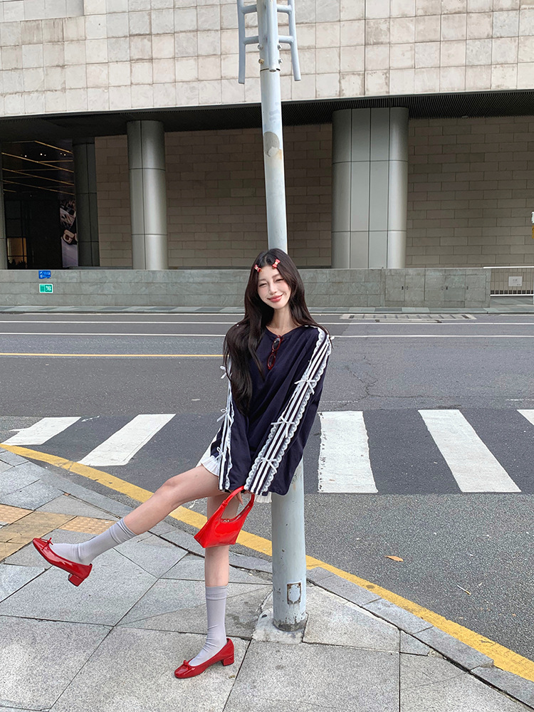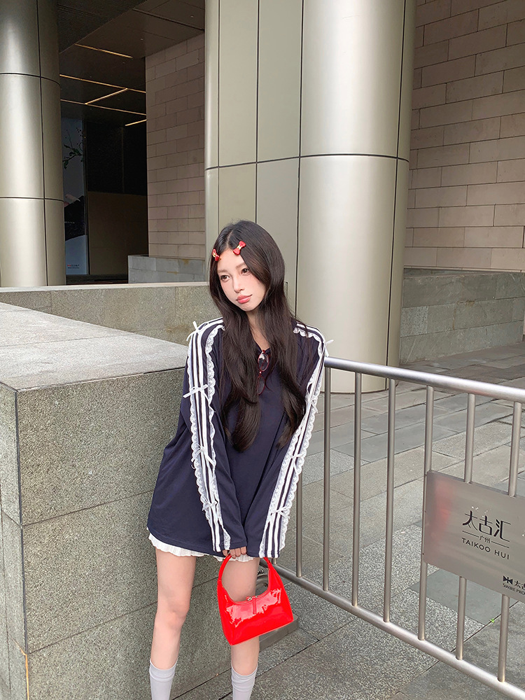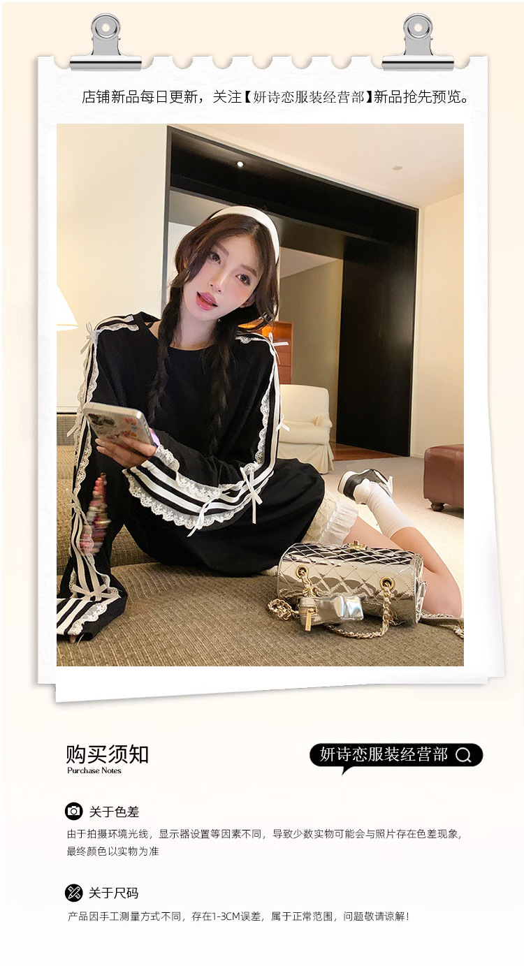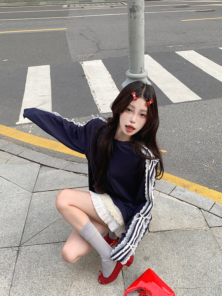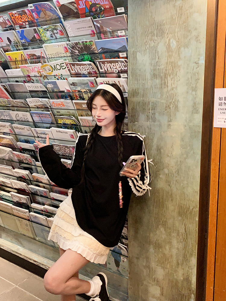 보우 블랙 긴팔 느슨한 티셔츠 여자 가을 레이스 바느질 한국식 중장 라운드 넥 올 매치 탑스토어 가기