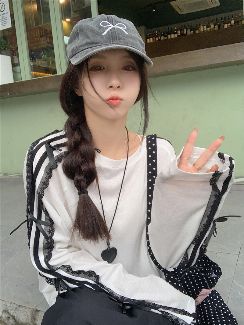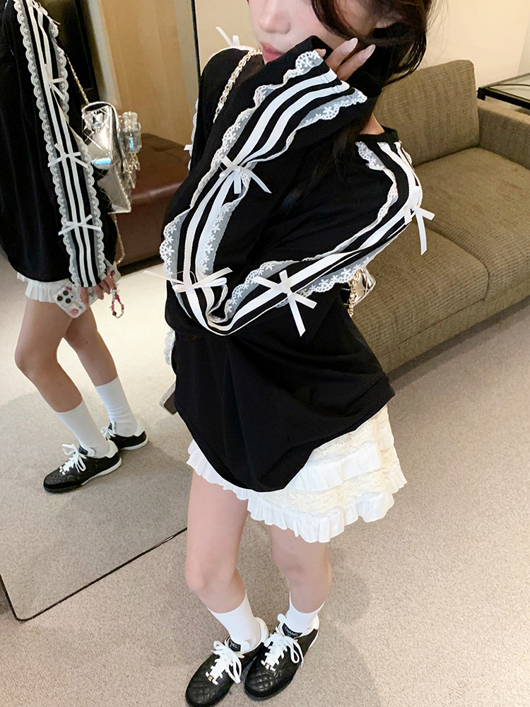 보우 블랙 긴팔 느슨한 티셔츠 여자 가을 레이스 바느질 한국식 중장 라운드 넥 올 매치 탑