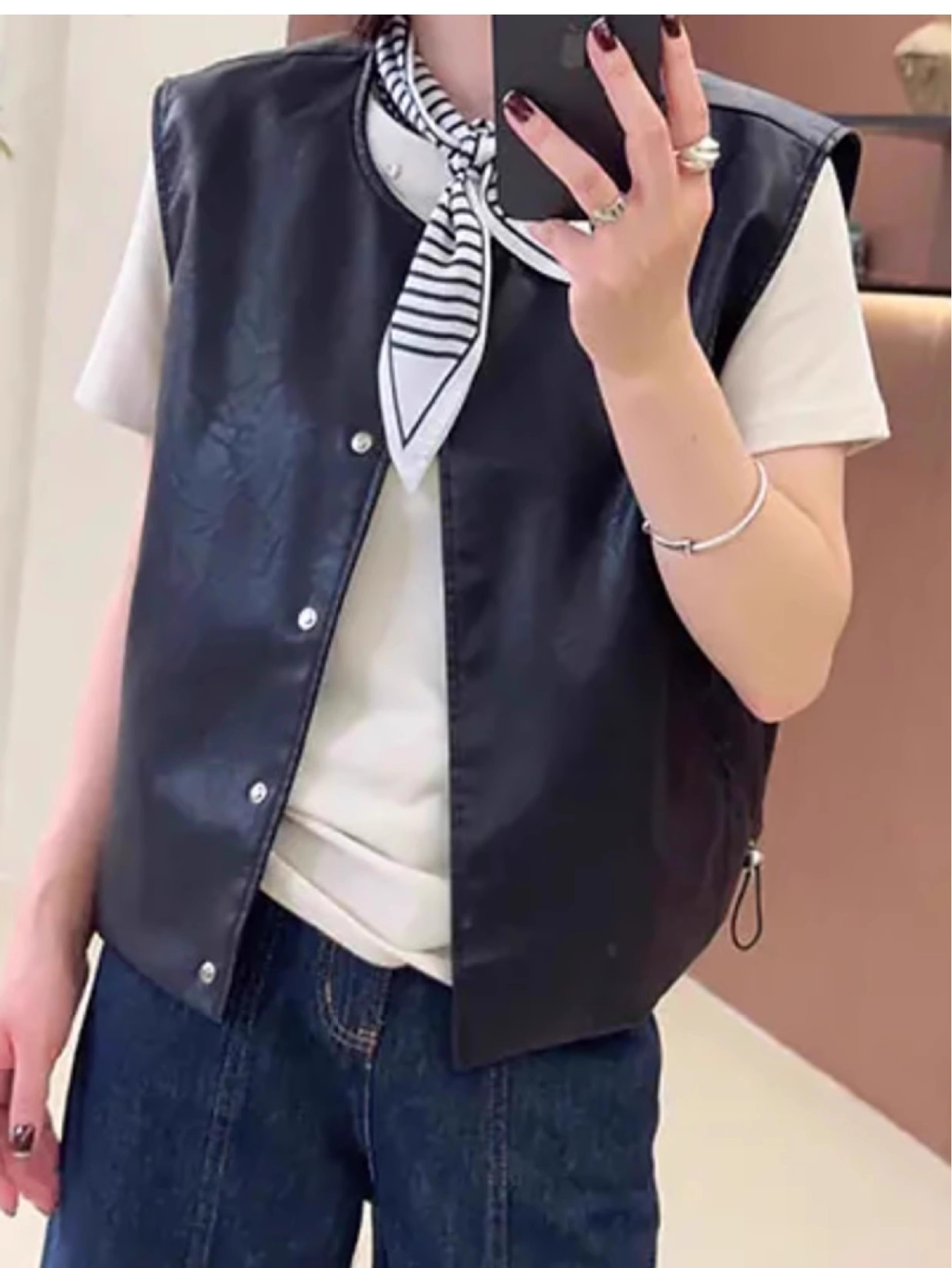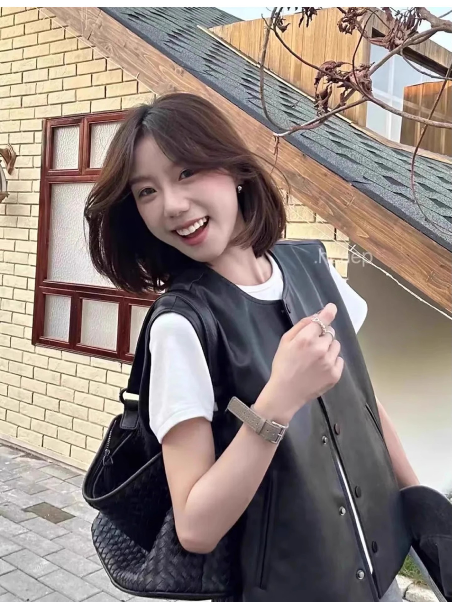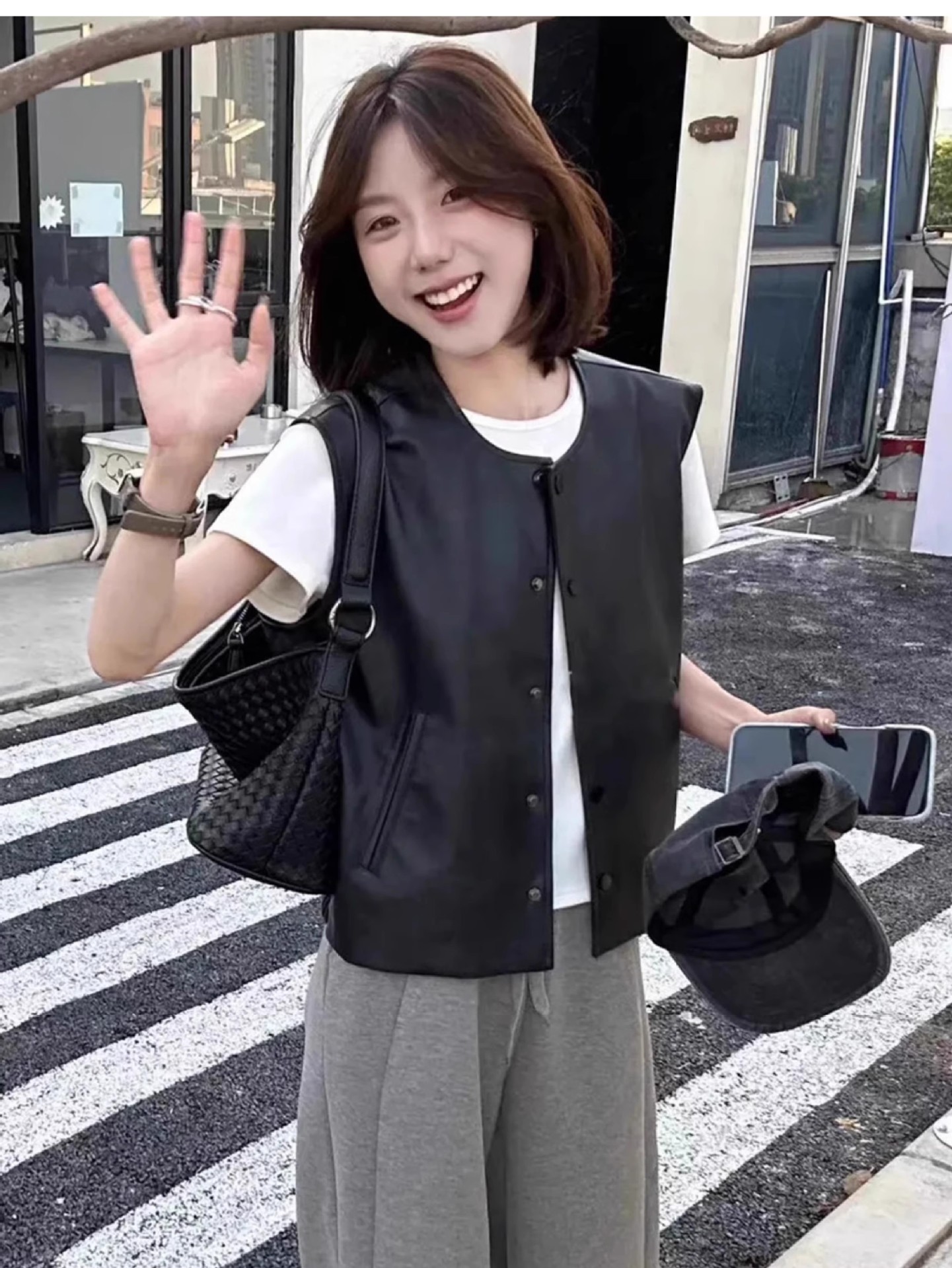 2025 봄 가을 디자인 PU 가죽 조끼 여성용 레트로 캐주얼 루즈핏 다용도 스타일리시 민소매 조끼 재킷스토어 가기