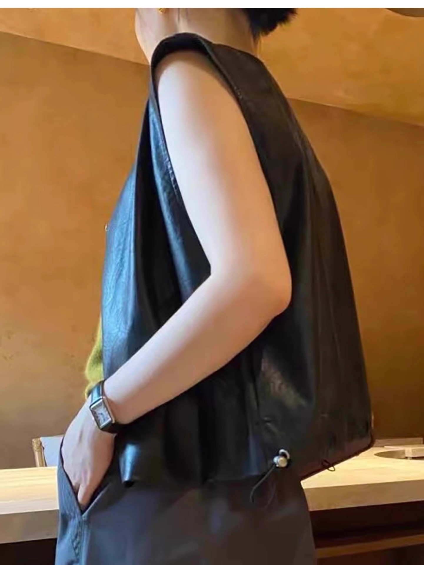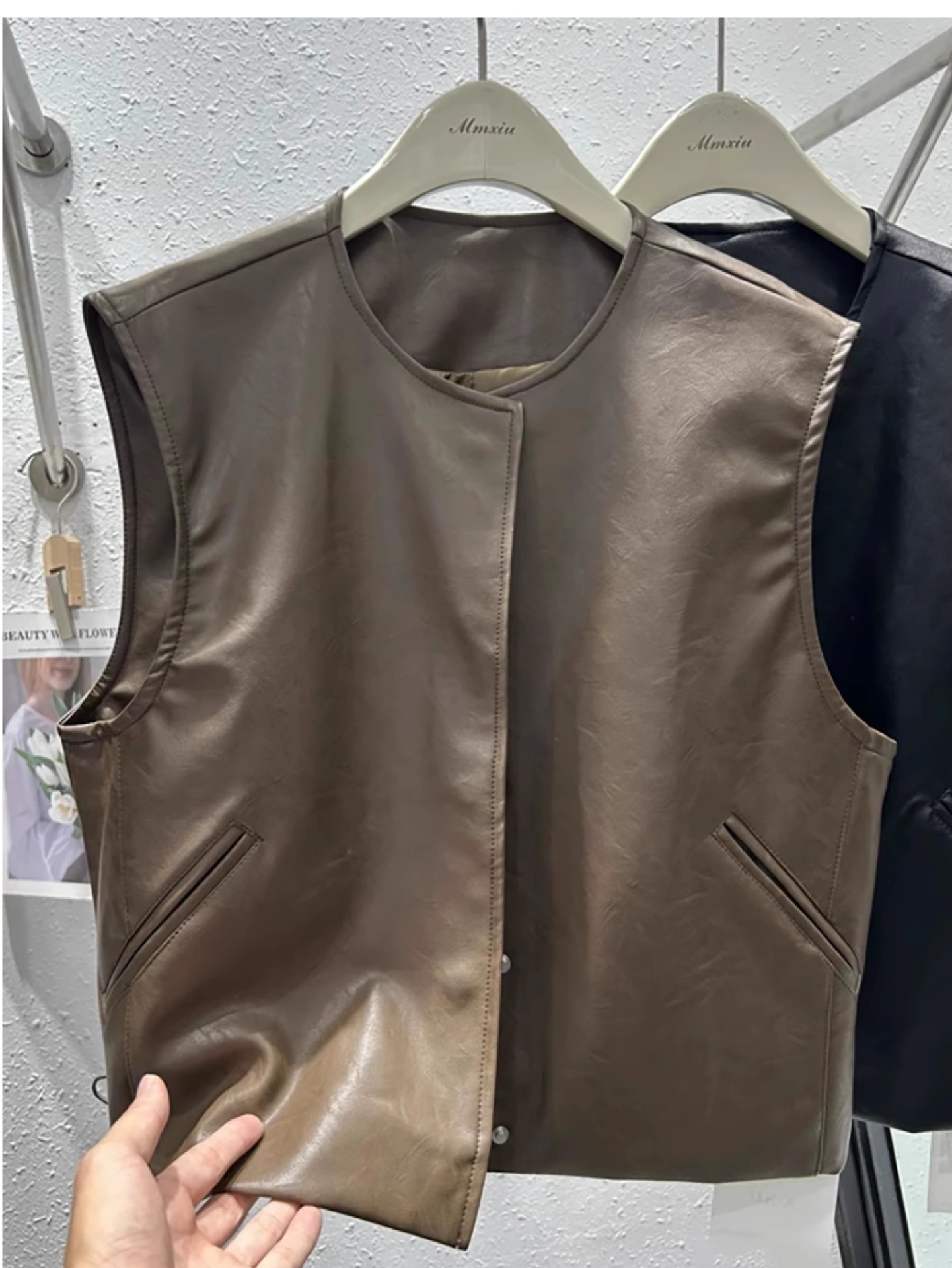 2025 봄 가을 디자인 PU 가죽 조끼 여성용 레트로 캐주얼 루즈핏 다용도 스타일리시 민소매 조끼 재킷