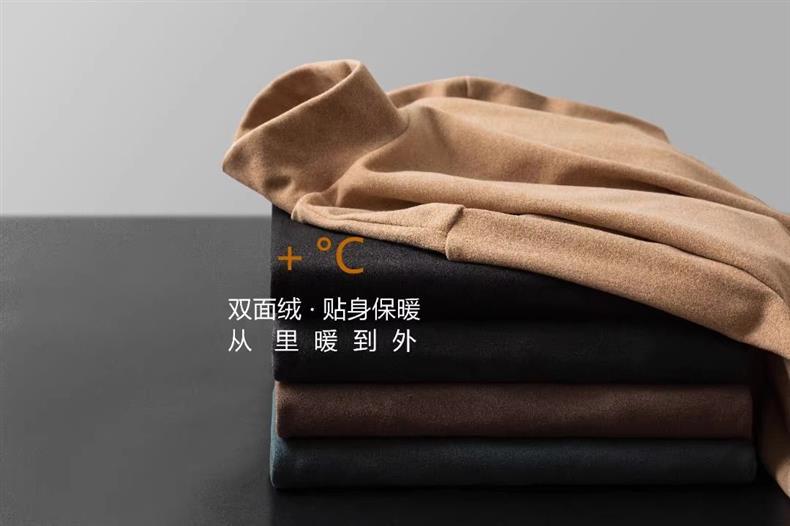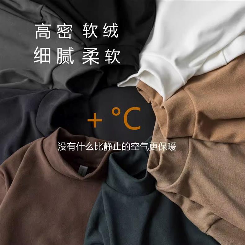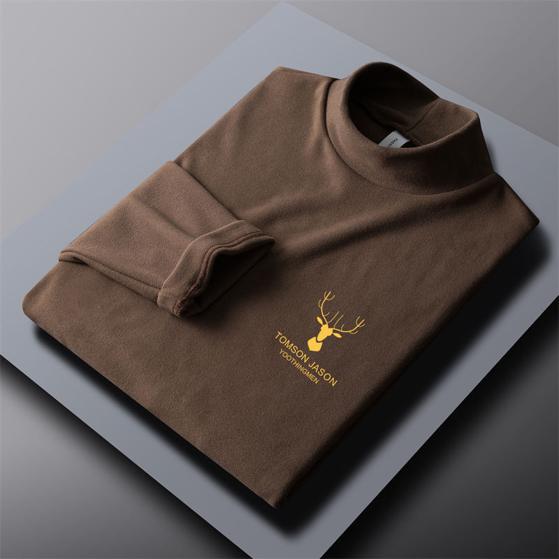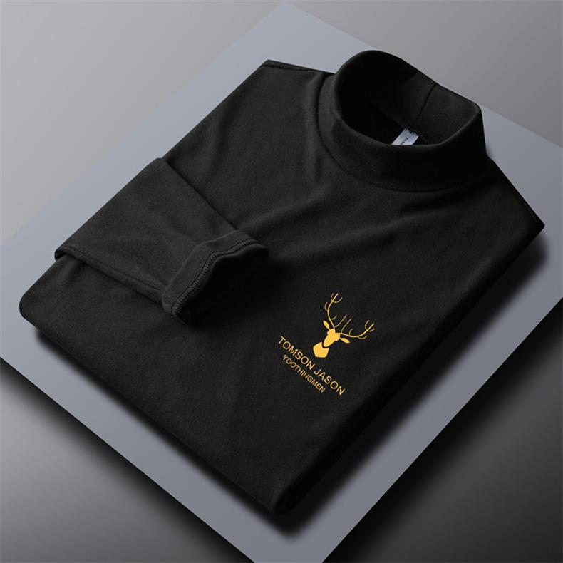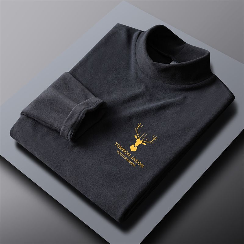 가을과 겨울 남성 양면 벨벳 세미 하이 칼라 프린트 긴팔 티셔츠, 기모 따뜻한베이스 셔츠 탑