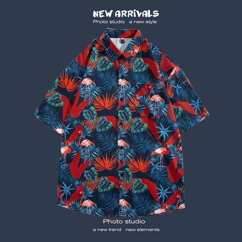 홍콩 스타일 짧은 소매 셔츠 남성과 여성 커플 여름 느슨한 얇은 하와이 비치 꽃 반 소매 꽃 셔츠