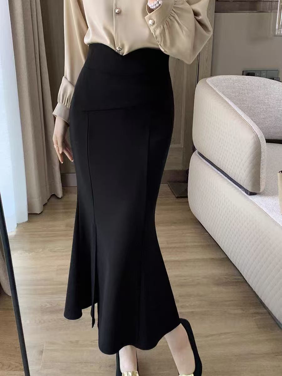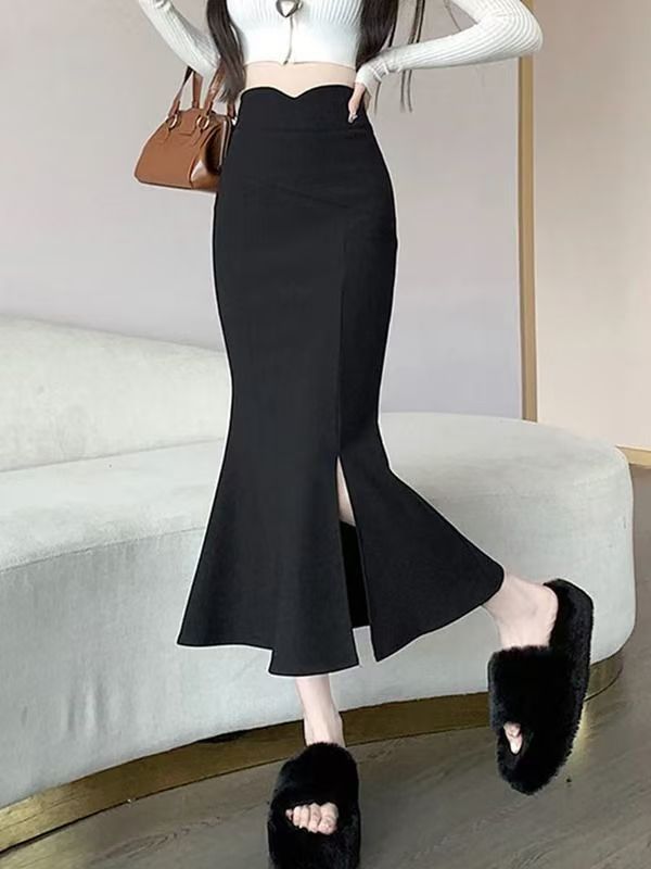 2024 년 봄, 여름 및 가을 새로운 높은 허리 살포 슬리밍 스트레치 블랙 피쉬 스커트 긴 중간 길이 스커트스토어 가기
