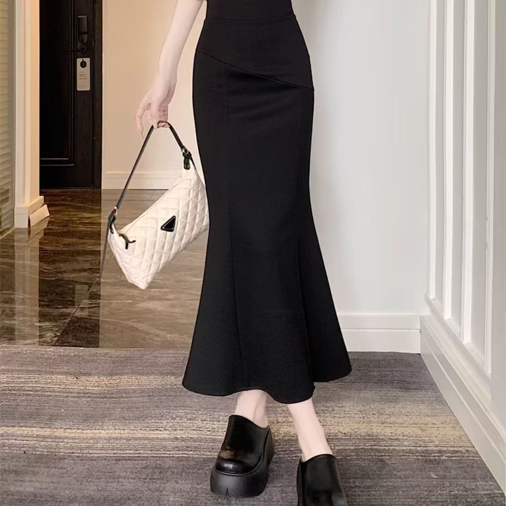 2024 년 봄, 여름 및 가을 새로운 높은 허리 살포 슬리밍 스트레치 블랙 피쉬 스커트 긴 중간 길이 스커트