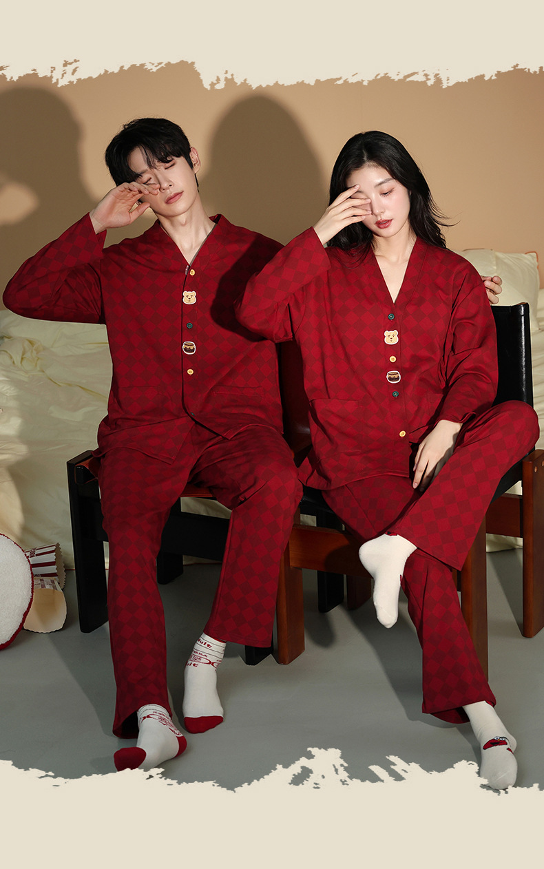 빨간 잠옷 여자 가슴 패드 결혼식 신혼 부부 세트 남자 긴 소매 만화 집 옷 봄과 가을