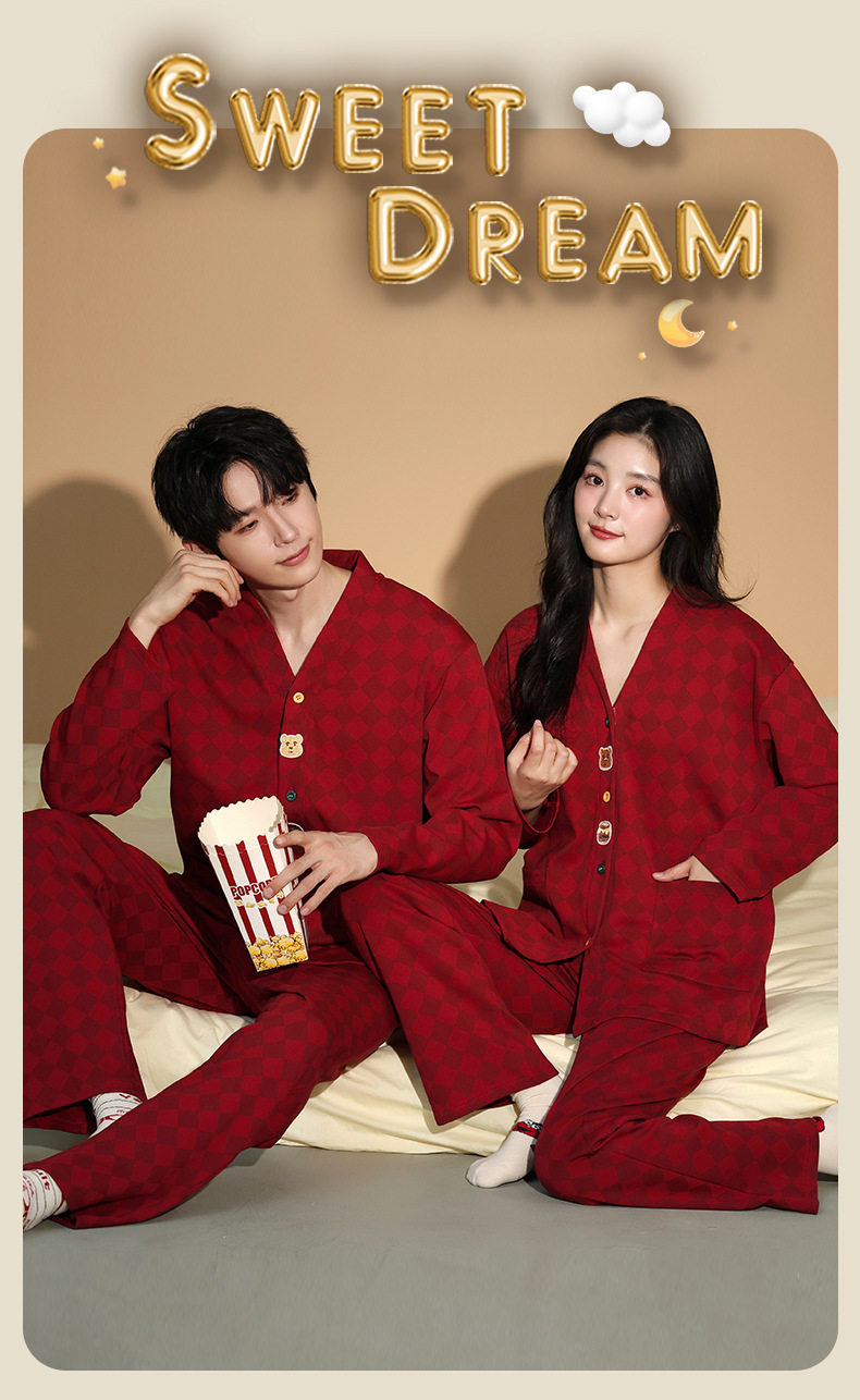 빨간 잠옷 여자 가슴 패드 결혼식 신혼 부부 세트 남자 긴 소매 만화 집 옷 봄과 가을스토어 가기