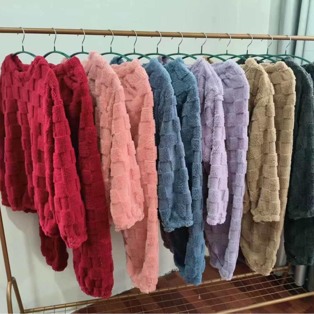 리얼 샷 가을과 겨울 스퀘어 코튼 벨벳 파자마 세트 홈 의류 여성 기모 두꺼운 코랄 벨벳 따뜻한 투피스 세트스토어 가기