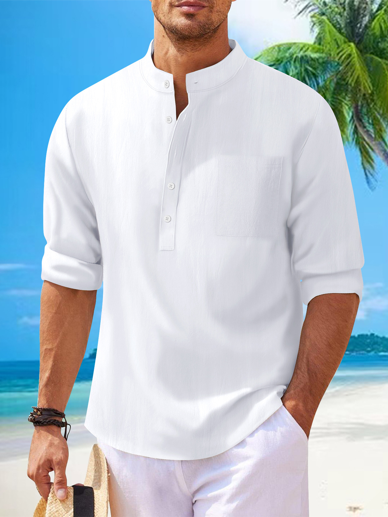 2024 유럽 및 미국 아마존 독립 사이트 가을 남성용 단색 캐주얼 면마 스탠드 칼라 긴팔 셔츠 다림질 필요 없는 레트로 스타일