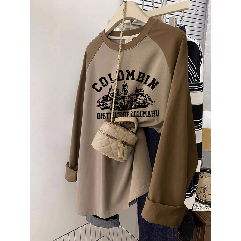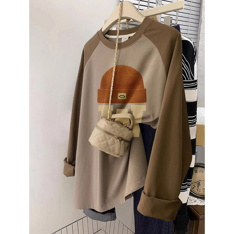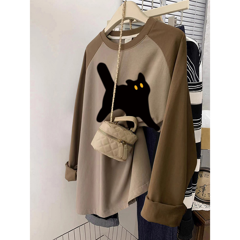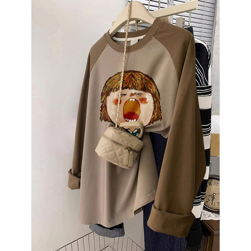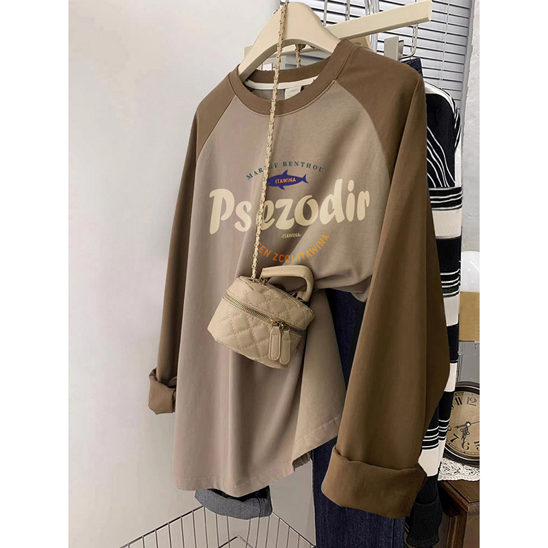 긴팔 티셔츠 라글란 소매 가을 느슨한 바닥 셔츠 2024 새로운 여성 플러스 사이즈 통통녀 배를 덮고있는 탑 숨기기 고기 조수스토어 가기