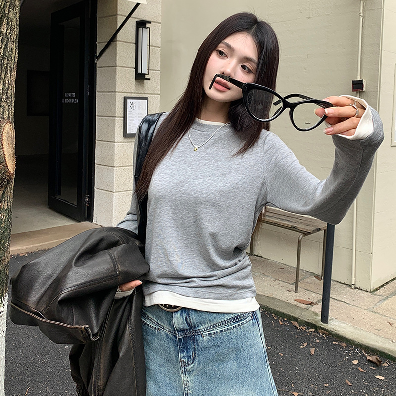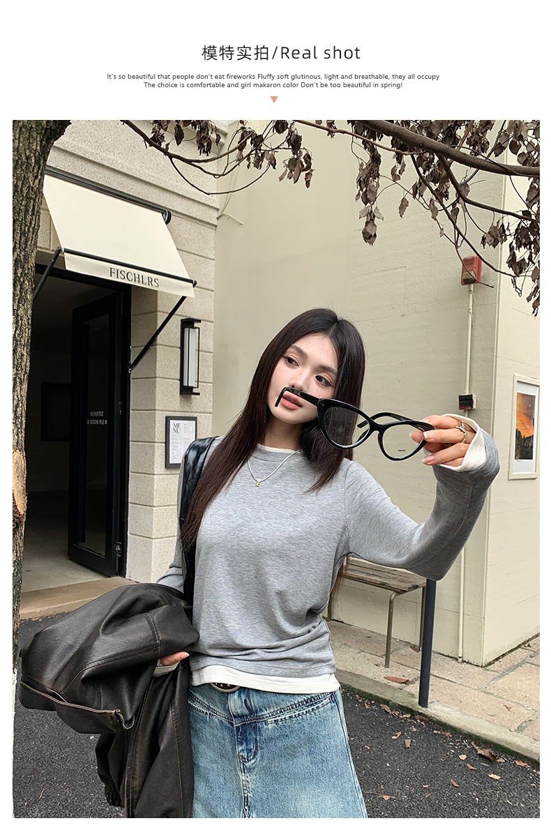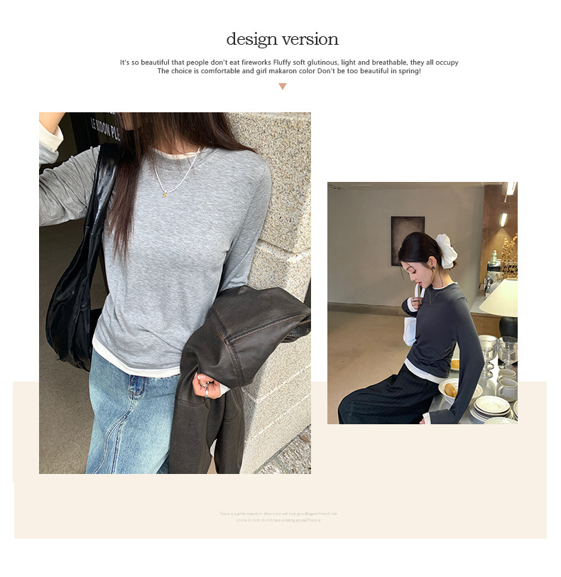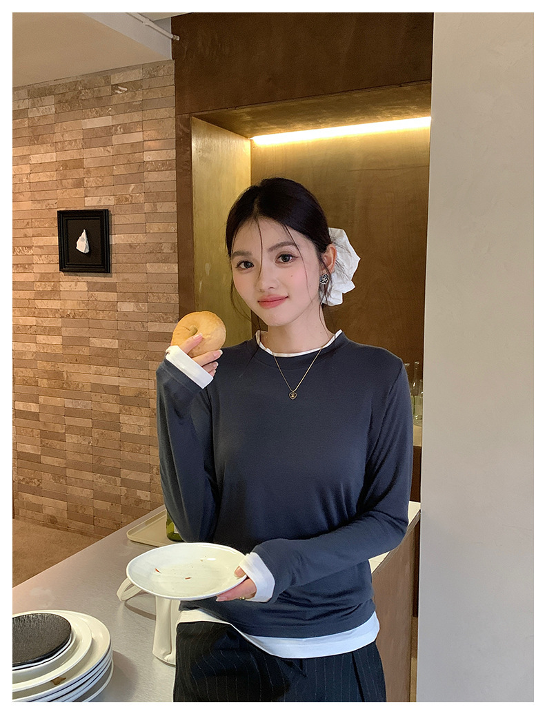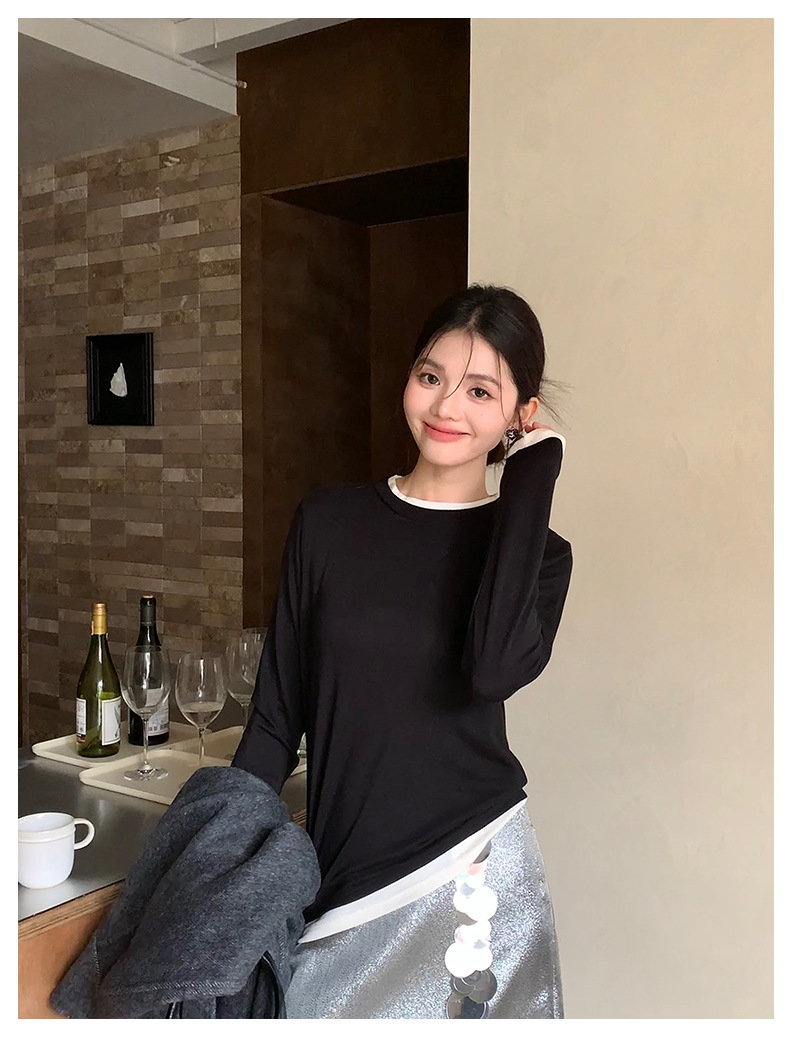 센도 가을 겨울 실크 아세테이트 이너웨어 여성용 레이어드 페이크 투피스 라운드넥 니트 심플 티셔츠 상의스토어 가기