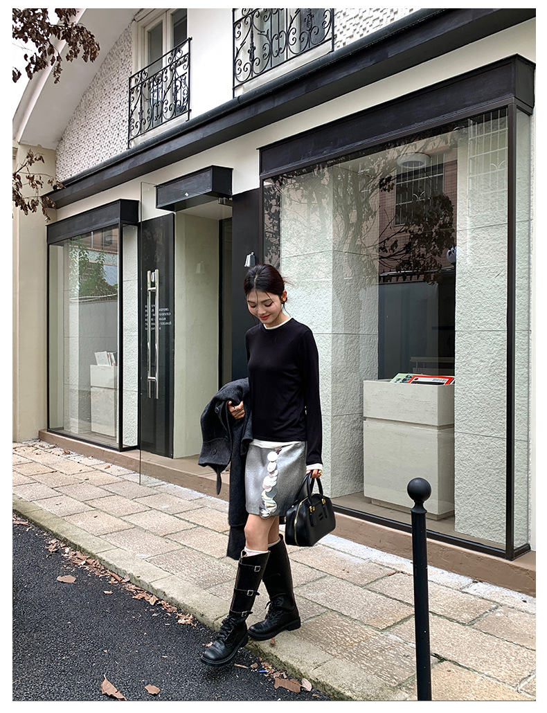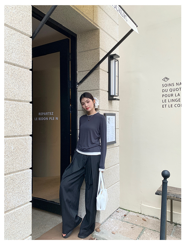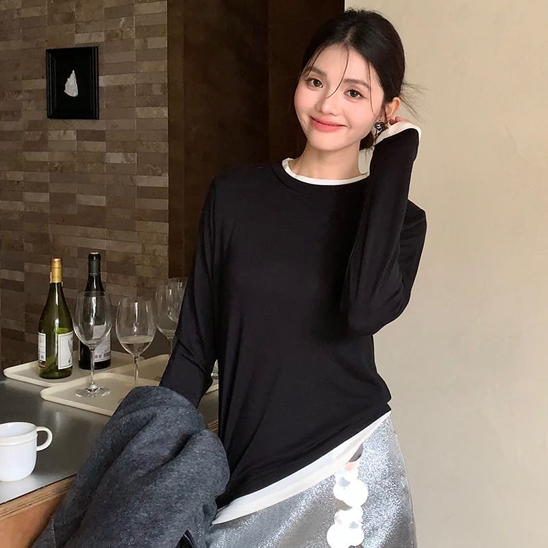 센도 가을 겨울 실크 아세테이트 이너웨어 여성용 레이어드 페이크 투피스 라운드넥 니트 심플 티셔츠 상의