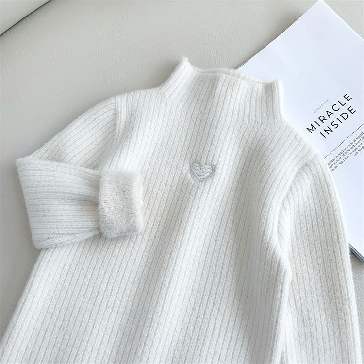 여자 기모 스웨터 겨울 2024 새로운 한국 스타일 어린 소녀 니트 스웨터 어린이 모의 높은 칼라 따뜻한 베이스 셔츠