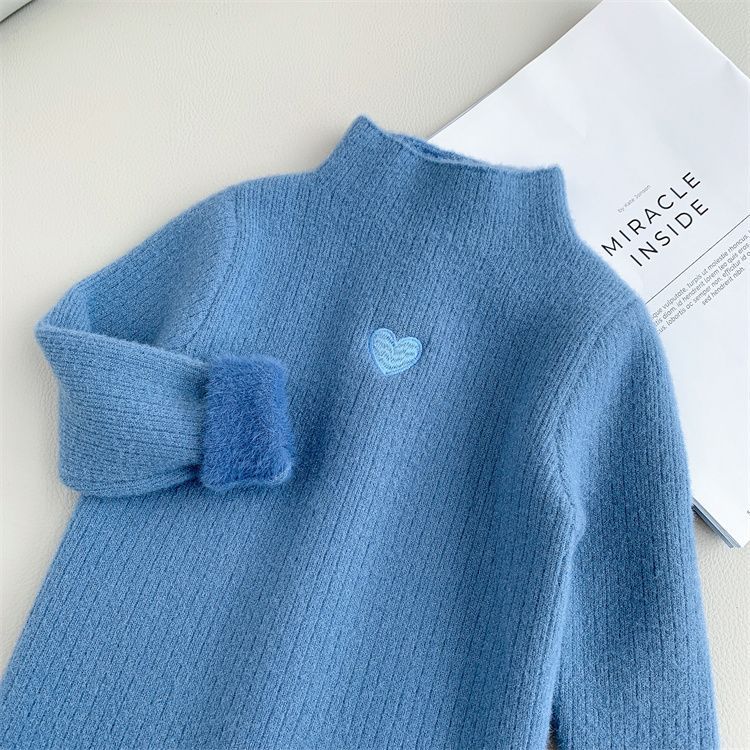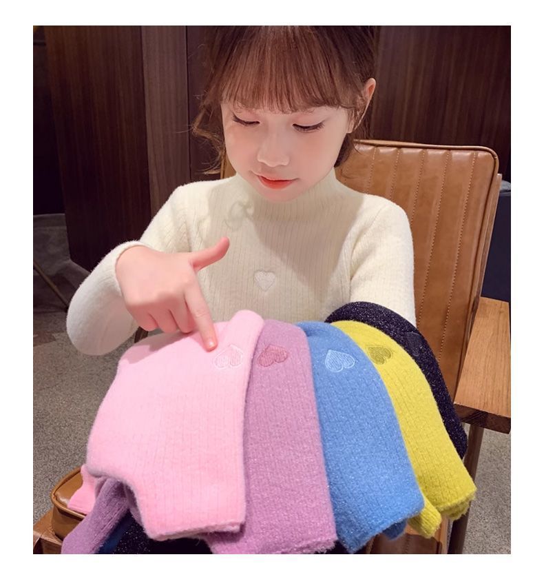 여자 기모 스웨터 겨울 2024 새로운 한국 스타일 어린 소녀 니트 스웨터 어린이 모의 높은 칼라 따뜻한 베이스 셔츠스토어 가기