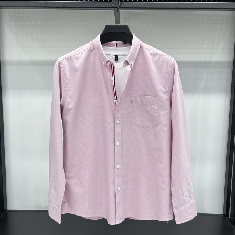 남성용 봄과 가을 컬러 스트립 바느질 긴팔 하이 엔드 퓨어 코튼 셔츠 청소년 솔리드 컬러 비즈니스 캐주얼 포켓 셔츠 트렌디