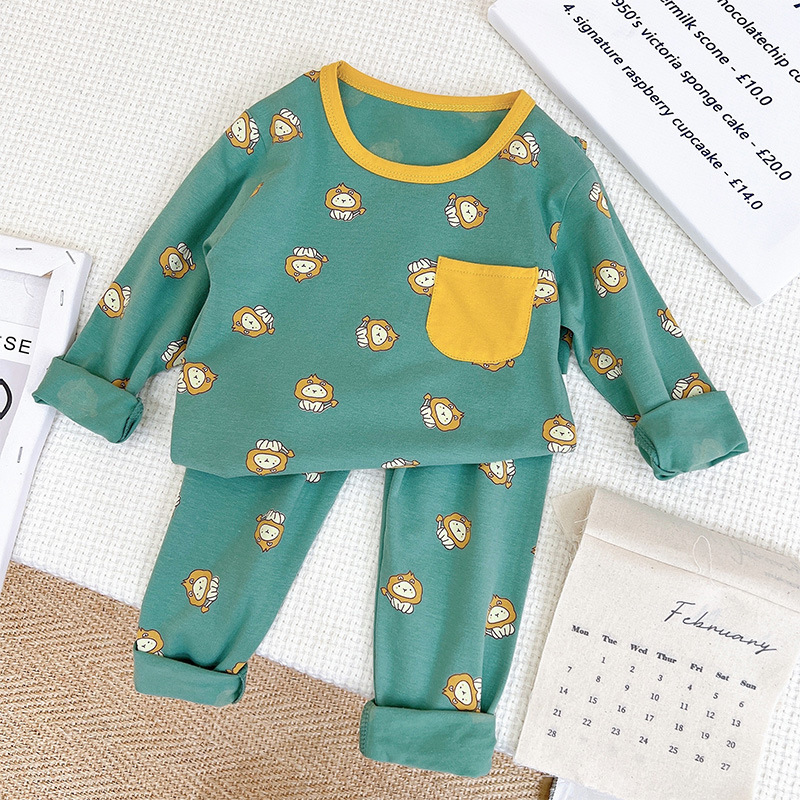 • 라운드넥 봄, 가을 포켓 스타일 - 녹색 바닥 작은 사자