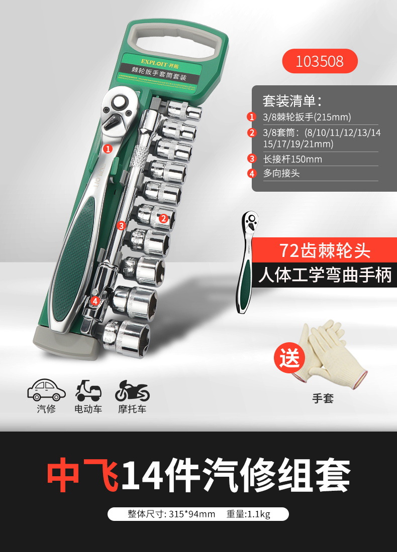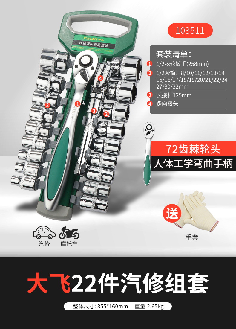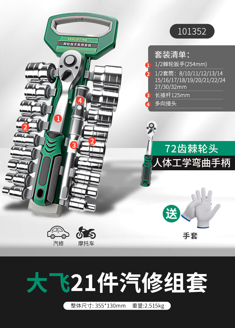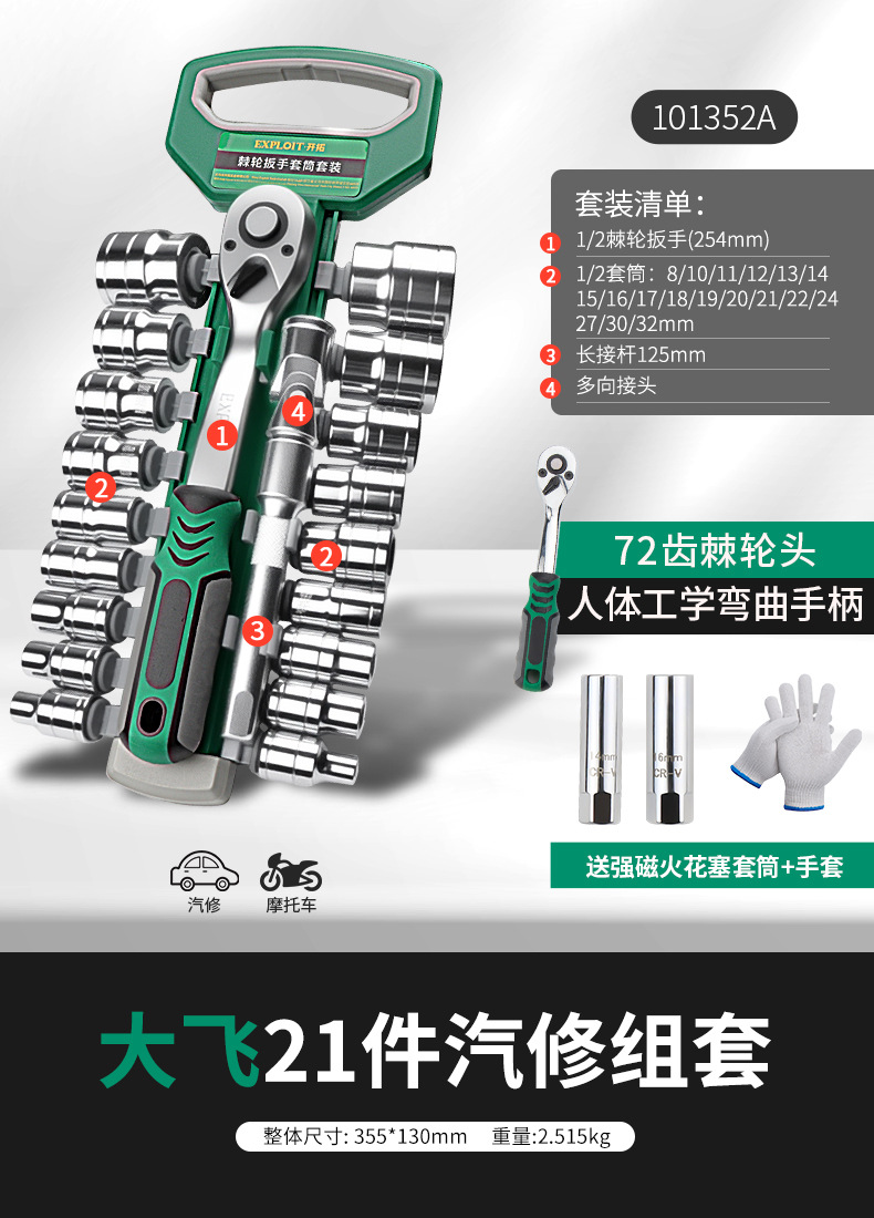 • [산업용 버전] 21PCS (1/2" Dafei) 72톱니 플라스틱 프레임 세트에는 장갑 + 점화 플러그 슬리브가 함께 제공됩니다.
