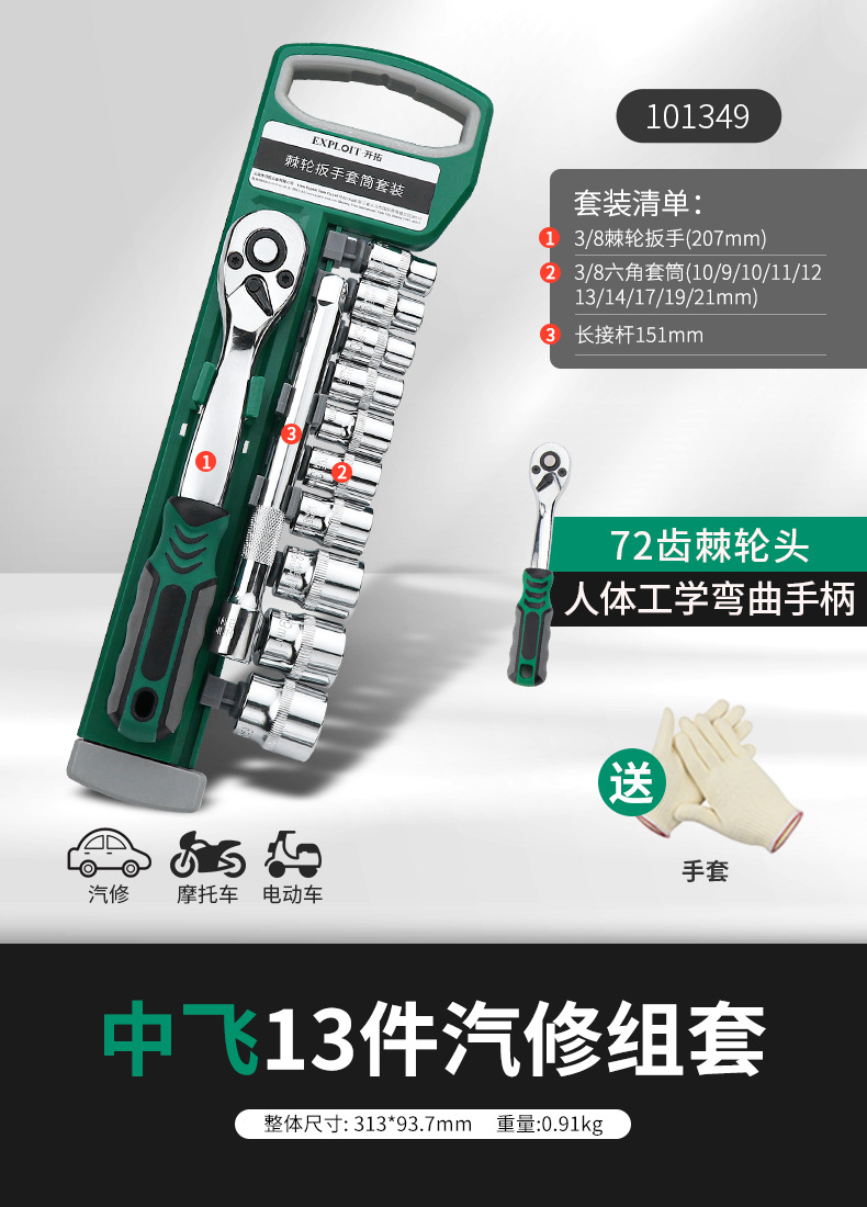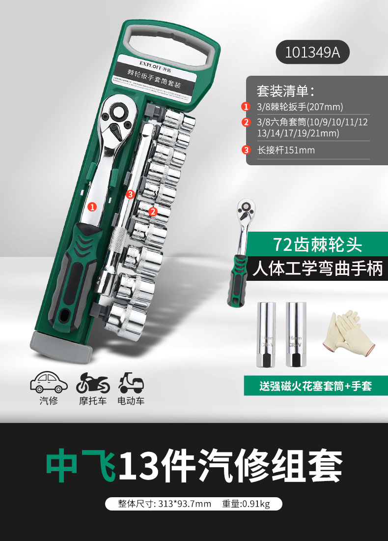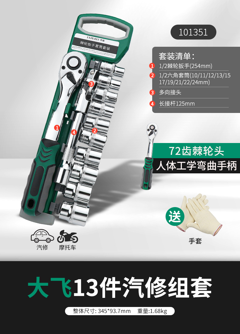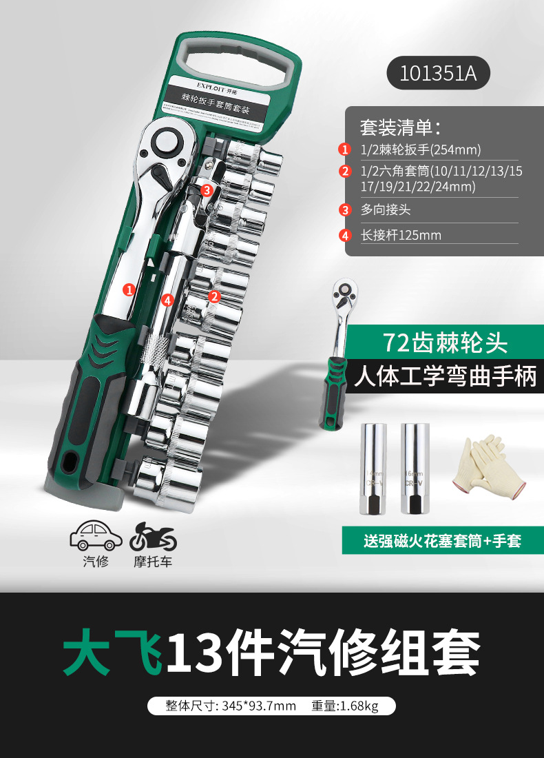 • [산업용 버전] 13PCS(1/2" Dafei) 72톱니 플라스틱 프레임 세트에는 장갑 + 점화 플러그 슬리브가 함께 제공됩니다.