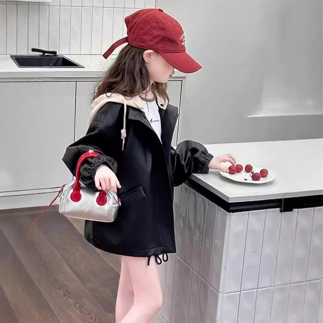 소녀 가죽 자켓 봄과 가을 2024 새로운 어린이 세련 된 빈티지 분리형 캡 탑 유행 재킷