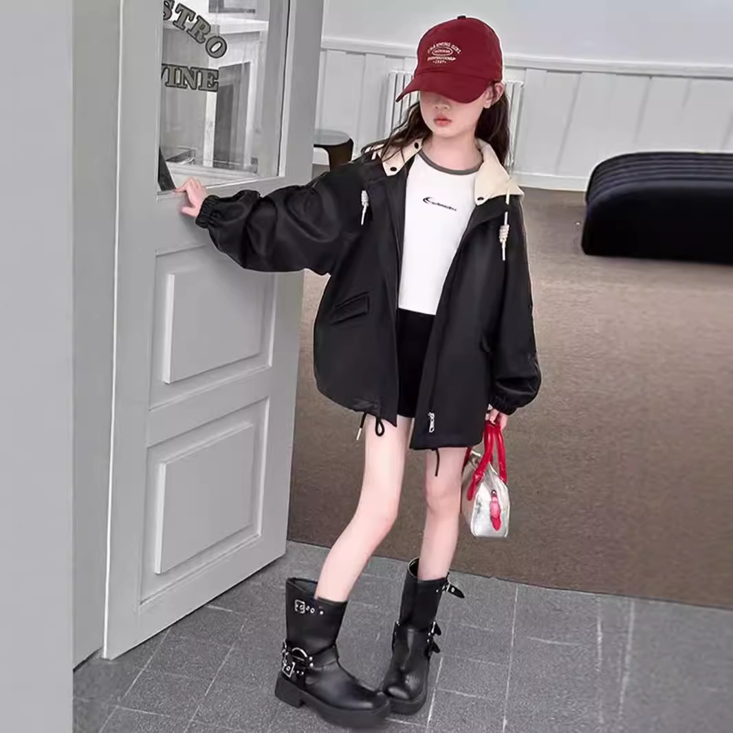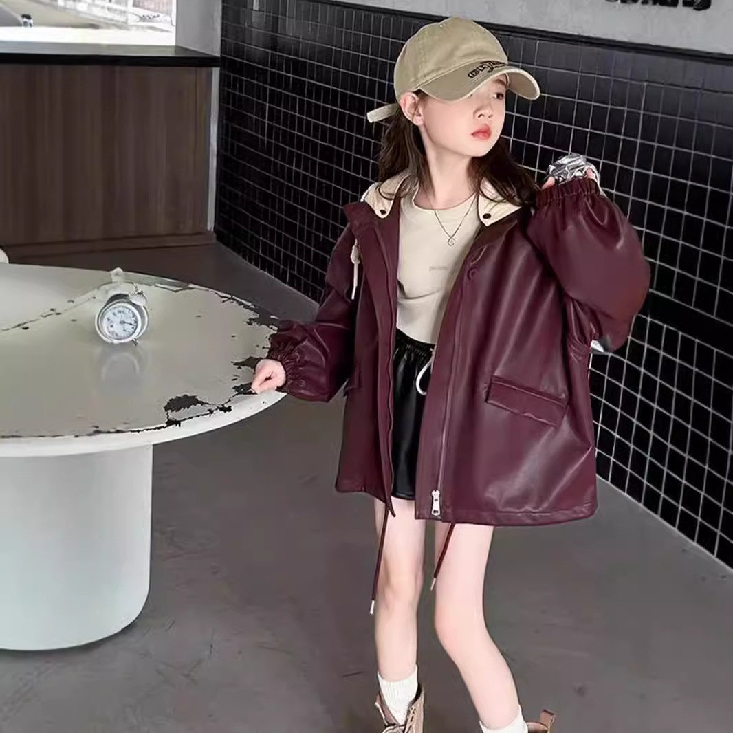 소녀 가죽 자켓 봄과 가을 2024 새로운 어린이 세련 된 빈티지 분리형 캡 탑 유행 재킷스토어 가기