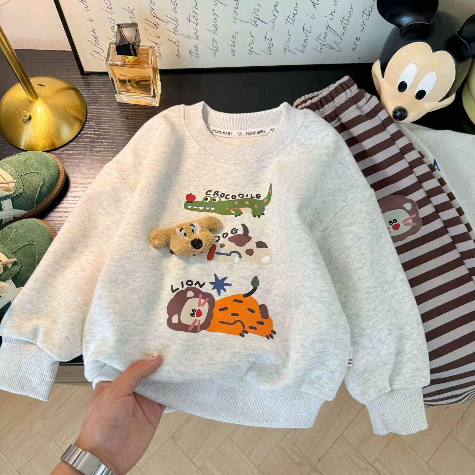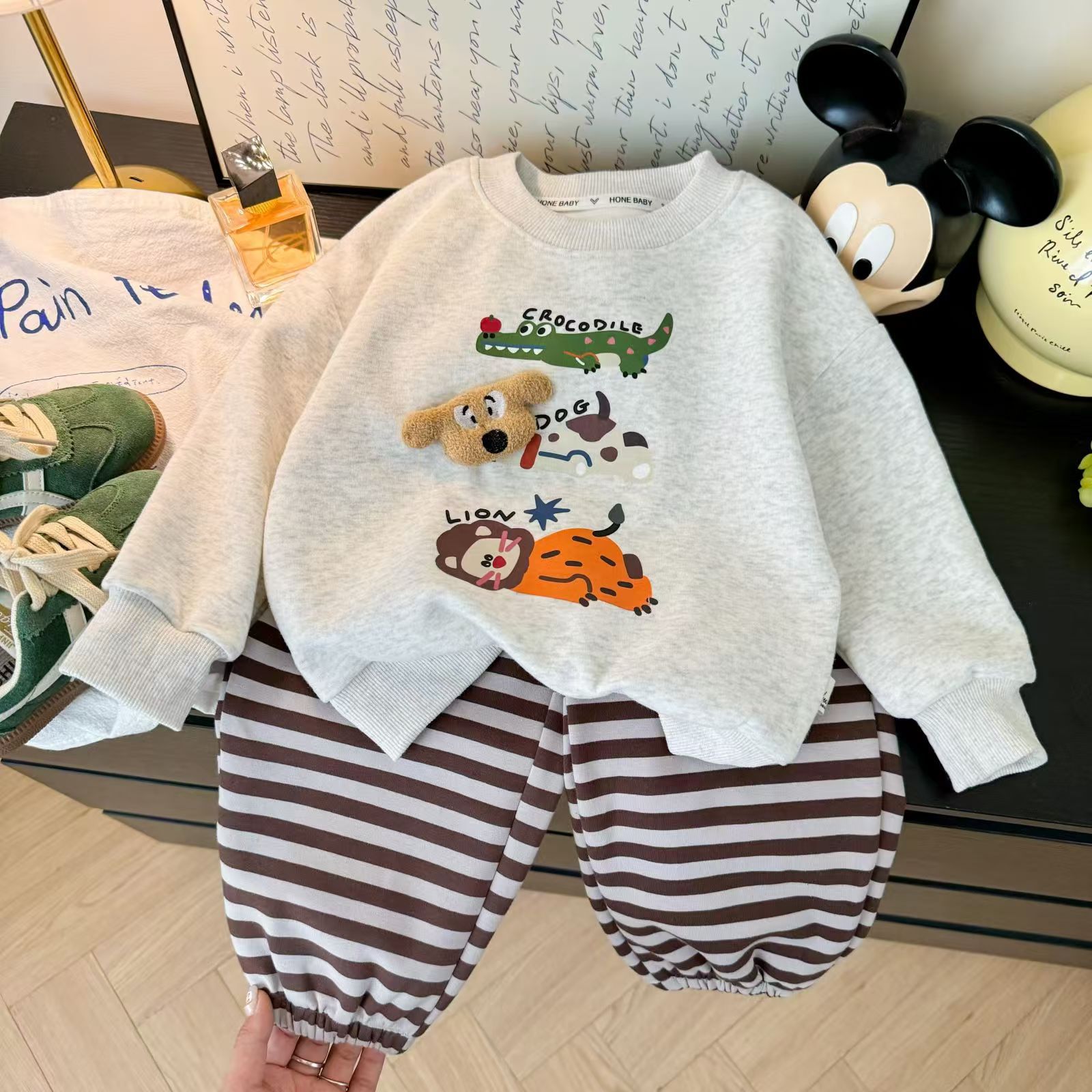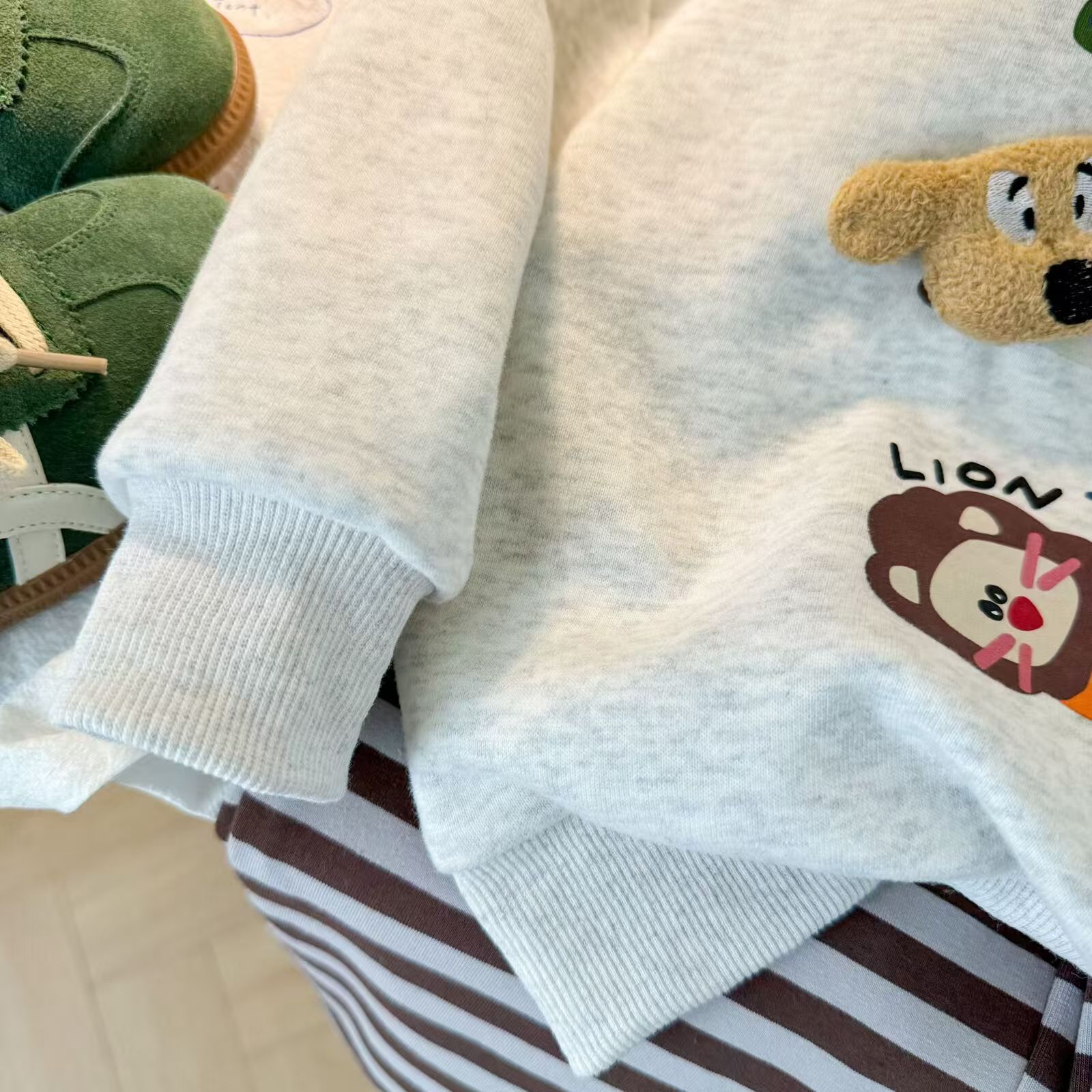 2025 입체 인형 라운드넥 스트라이프 바지 어린이 봄 가을 세트 남녀 아동 만화 스웨트셔츠 아동복 중국풍