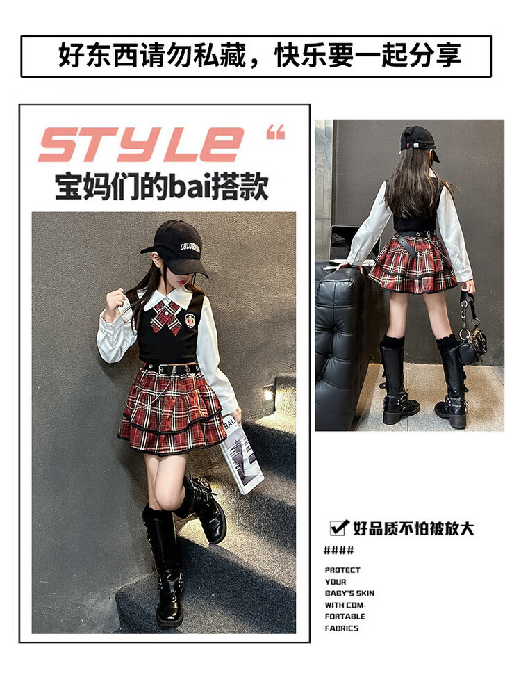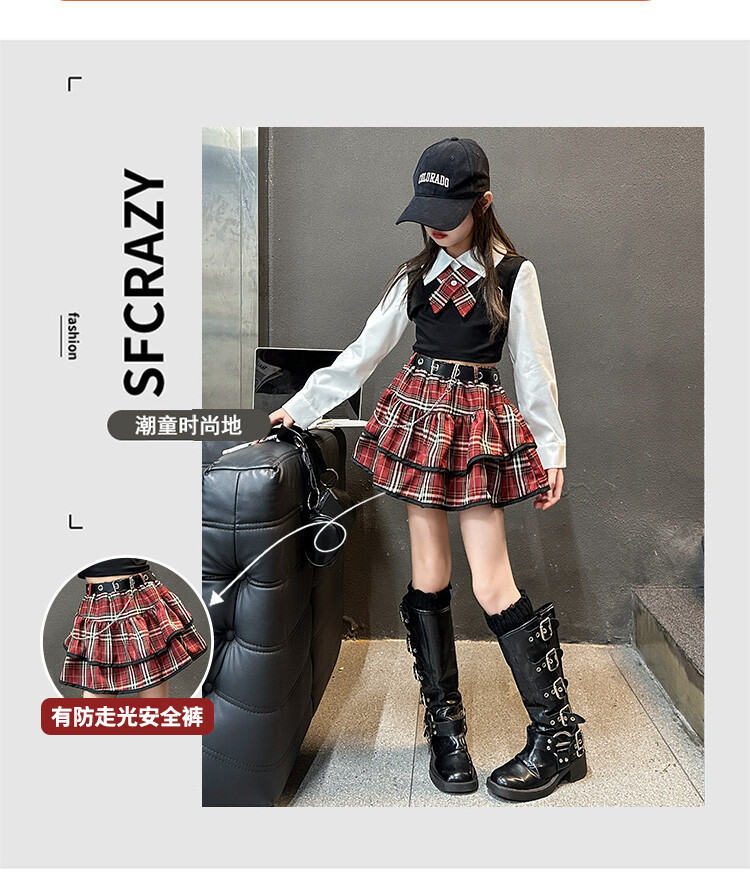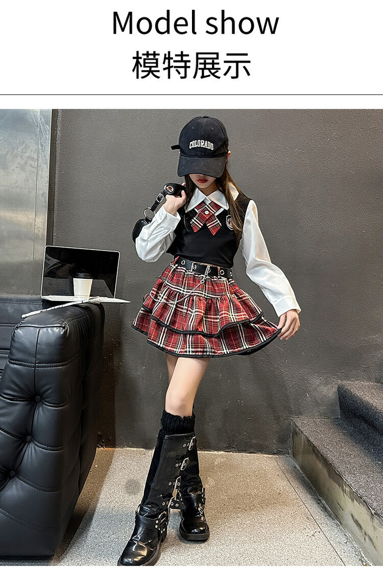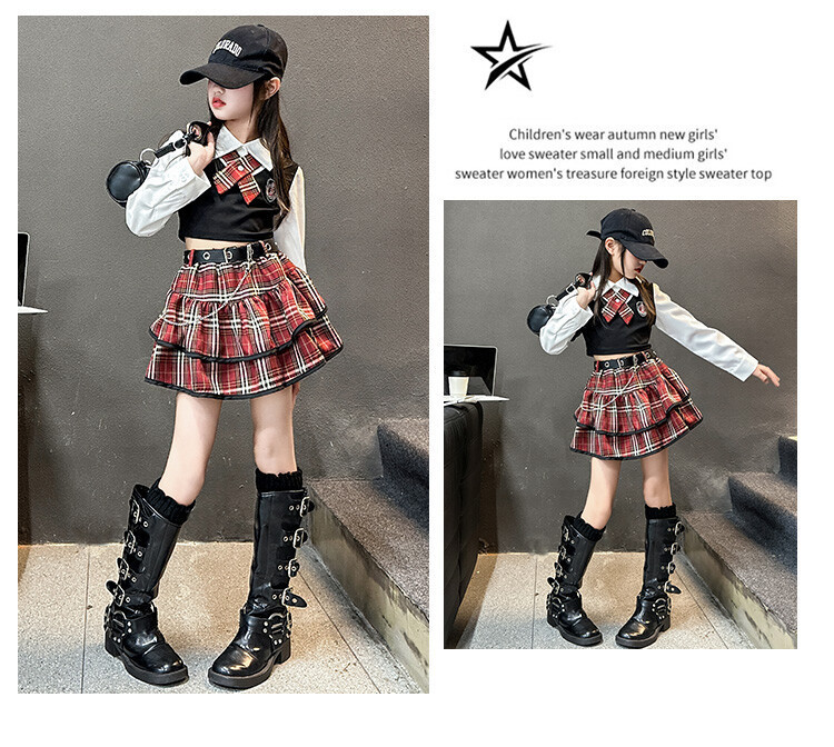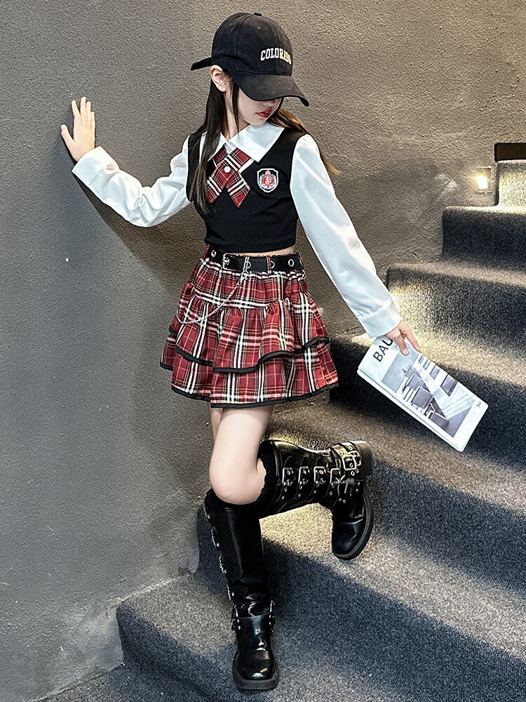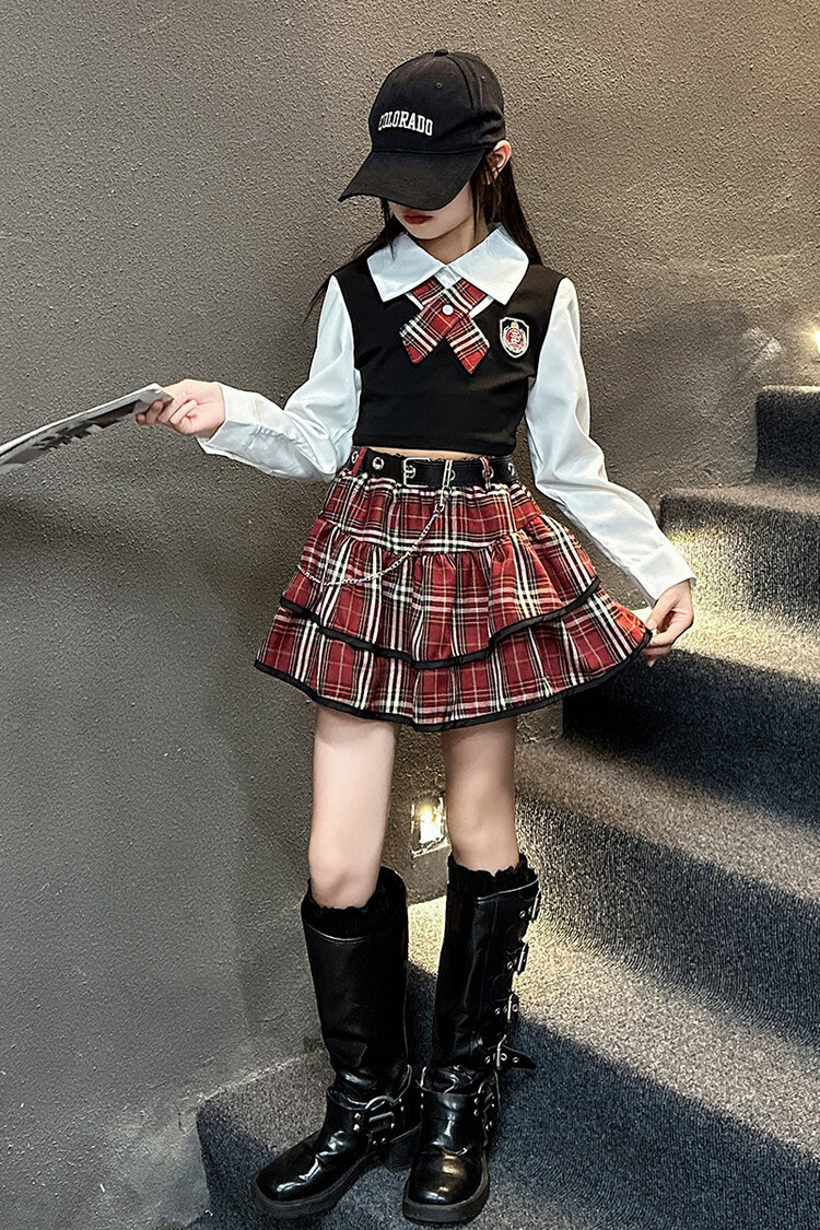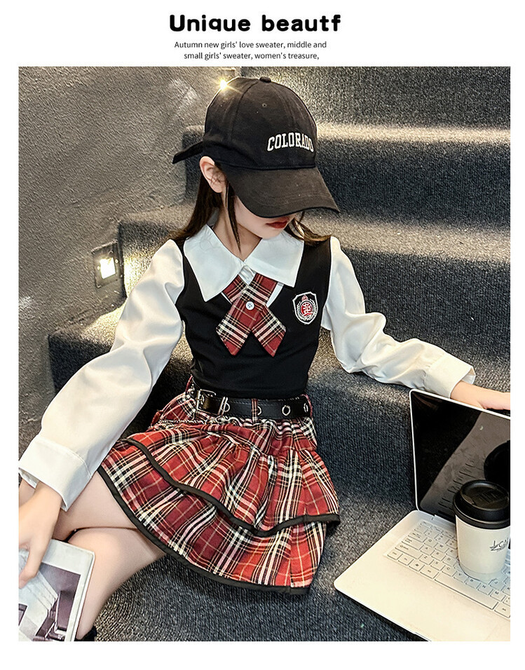 여자 대학 스타일 JK 세트 어린이 격자 무늬 스커트 긴 소매 가짜 2 피스 셔츠 달콤한 쿨 투피스 세트 소녀 JK스토어 가기