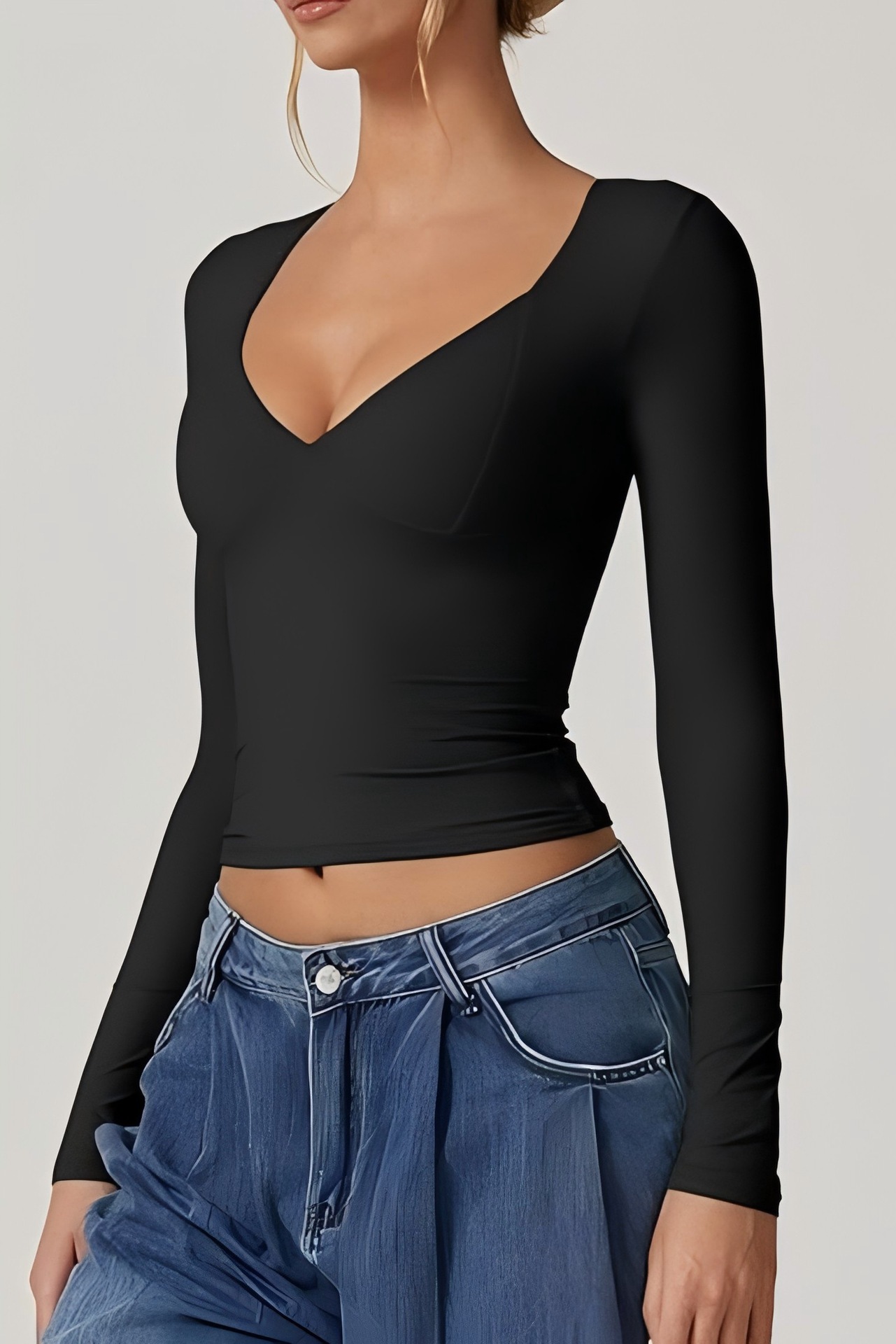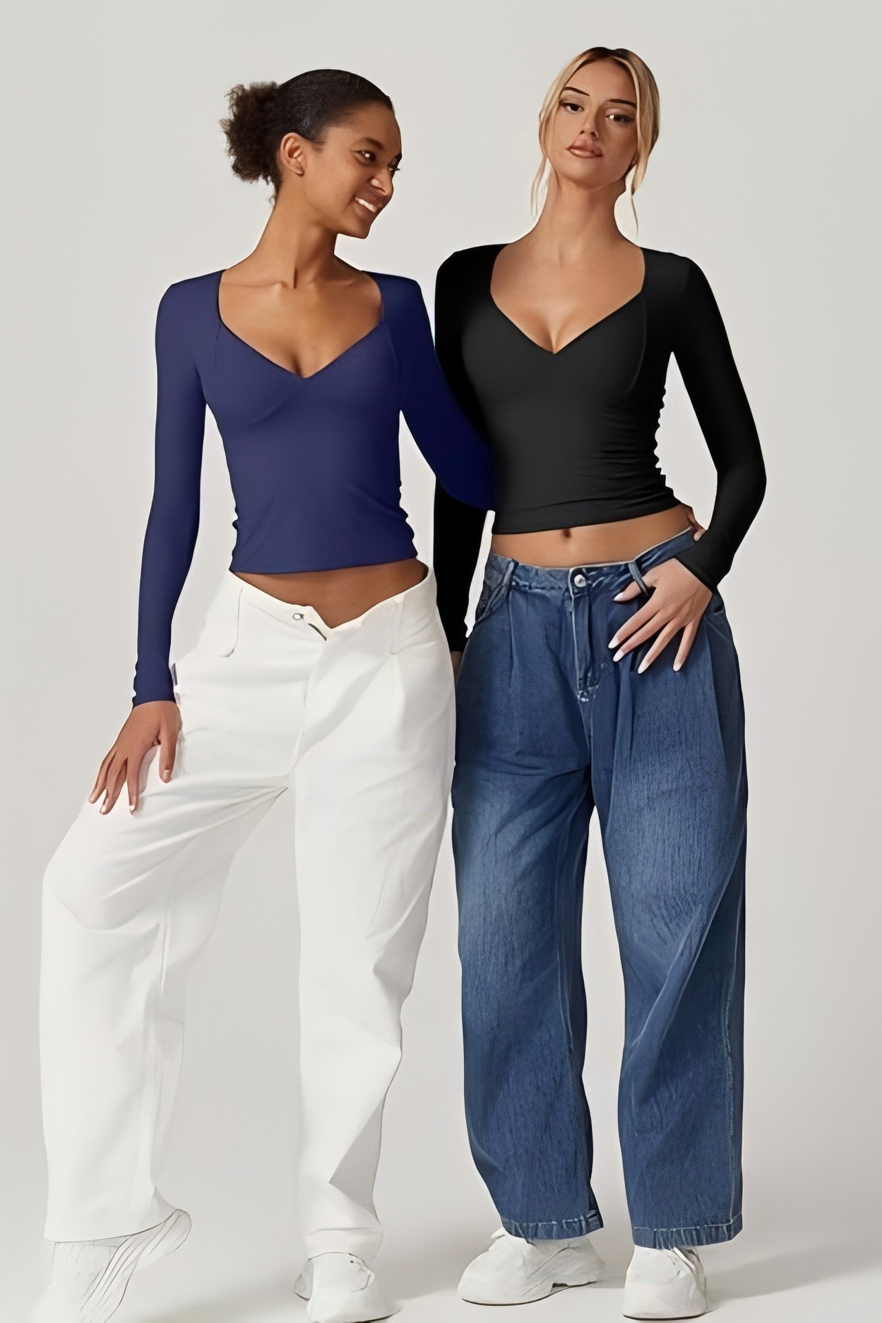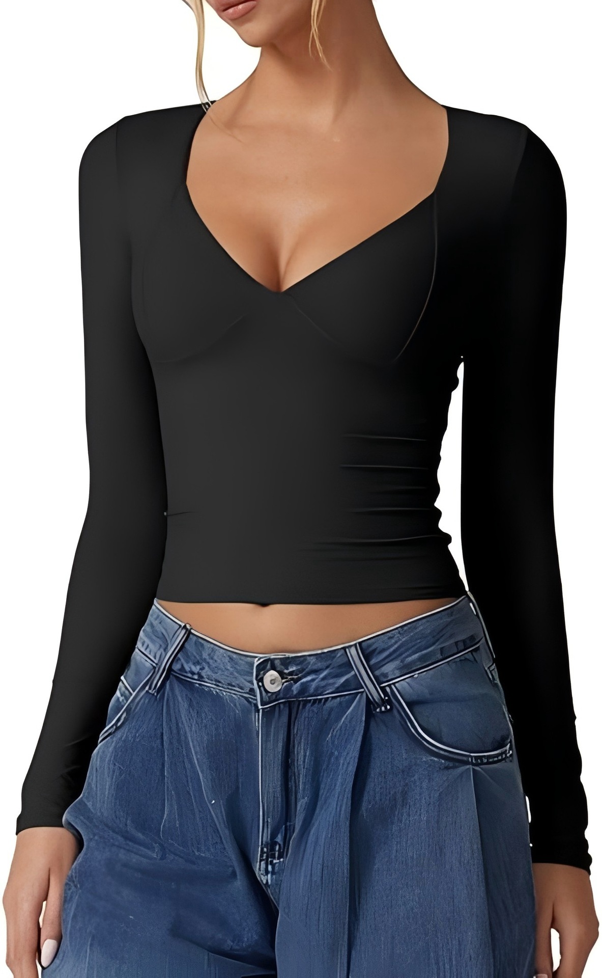 아마존 알리 익스프레스 부티크 재고 여자 긴 소매 V-Neck 티셔츠 더블 라인드 크롭 탑 솔컵 탑