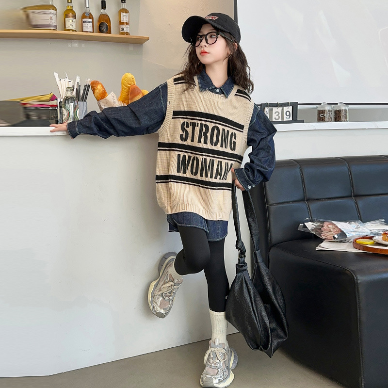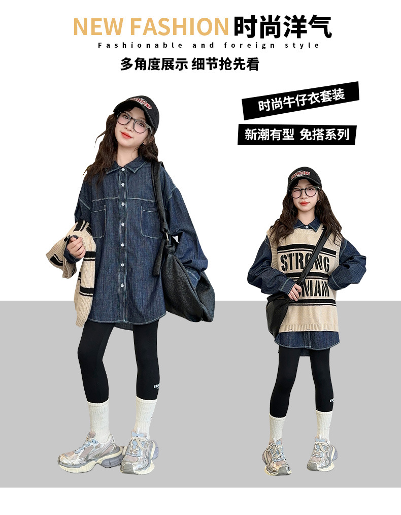 소녀 니트 조끼 세트 가을 2024 새로운 한국 스타일 유행 데님 셔츠 투피스 세트