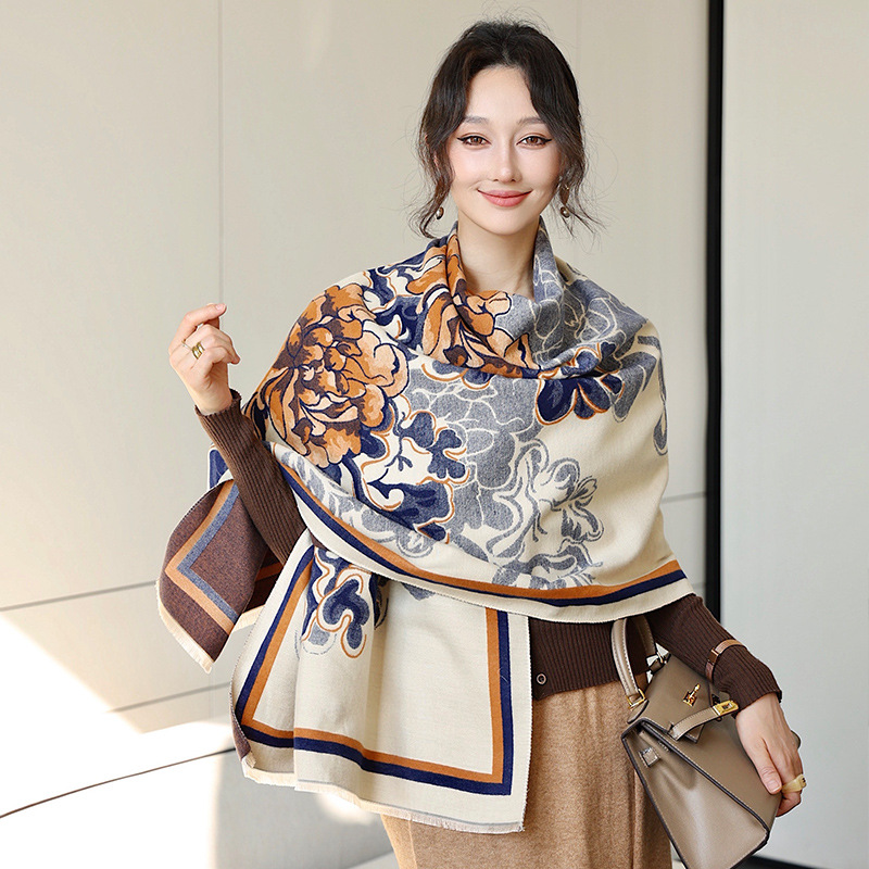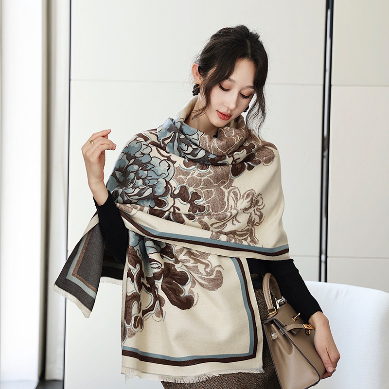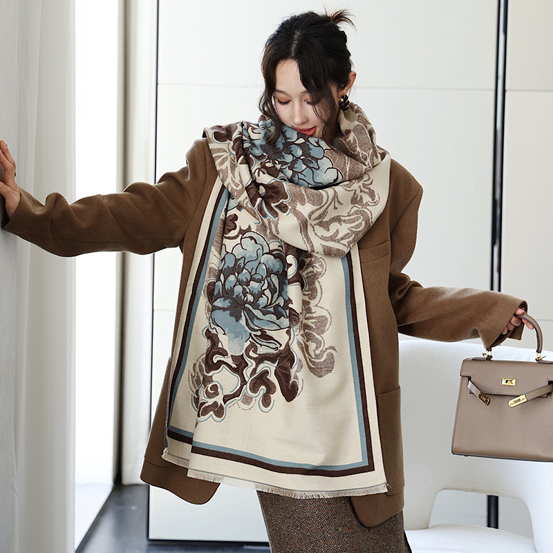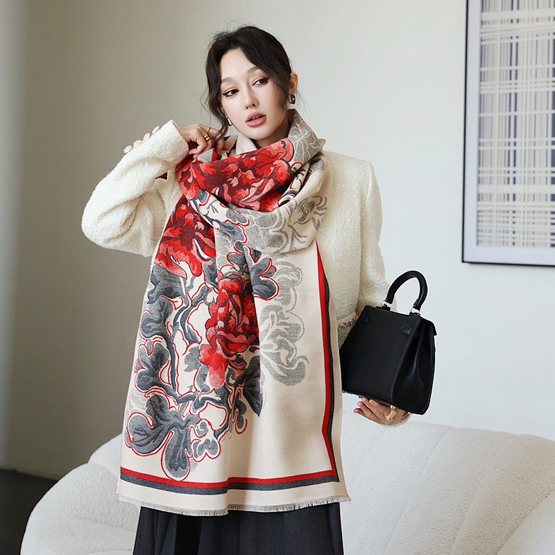 우아한 나이를 줄이는 화이트 로즈 프린트 우아한 두꺼운 캐시미어 올 매치 스카프 따뜻한 추위와 방풍스토어 가기