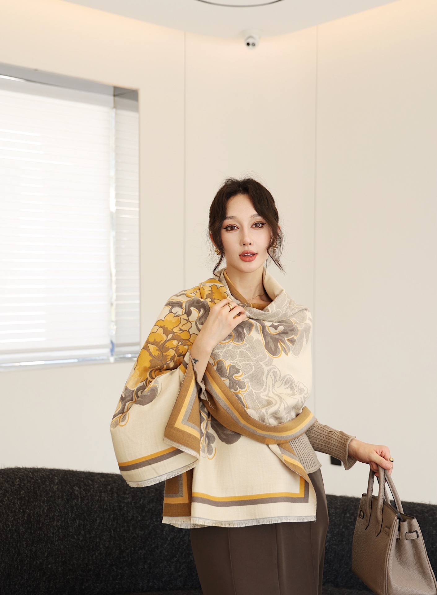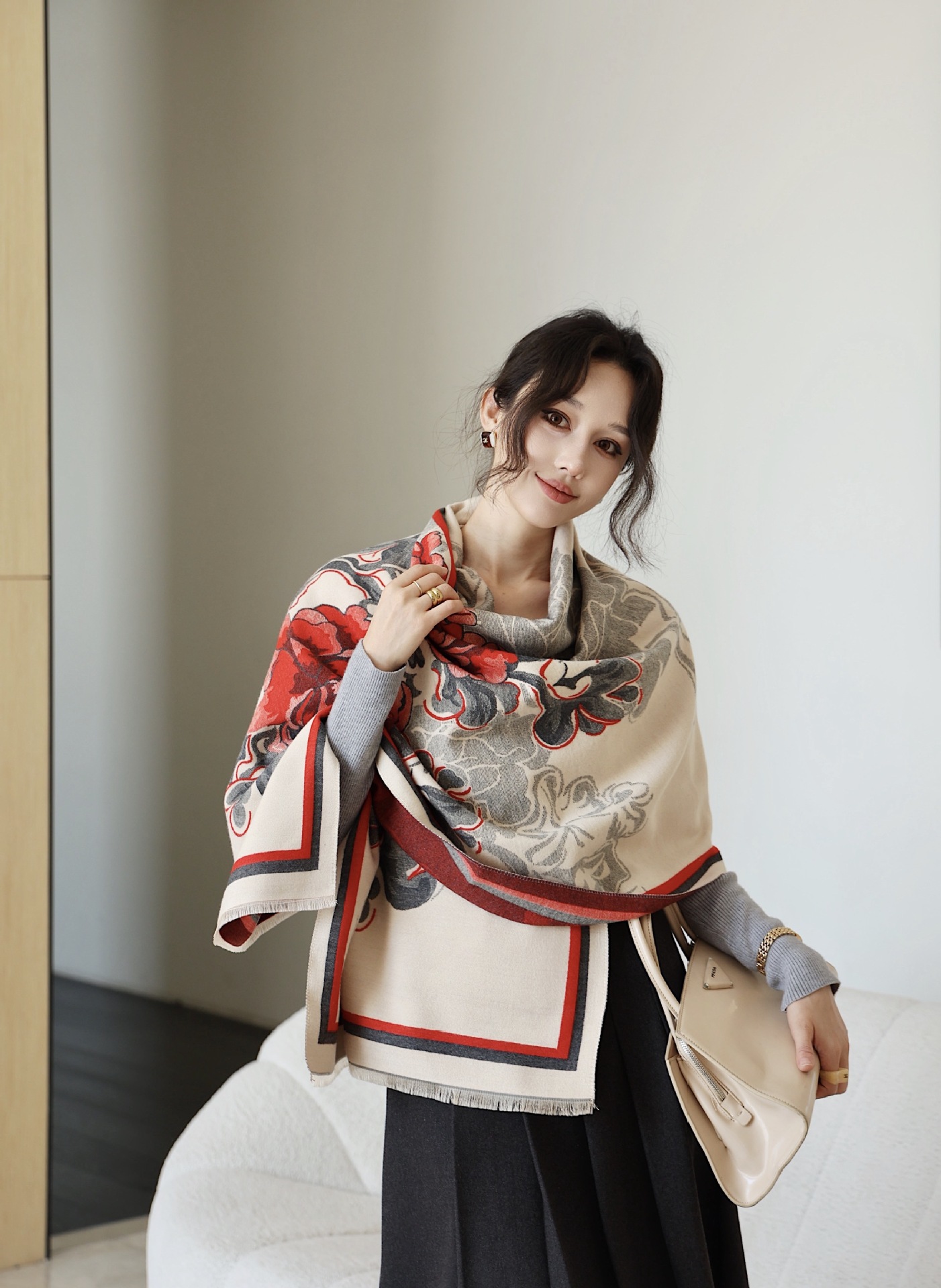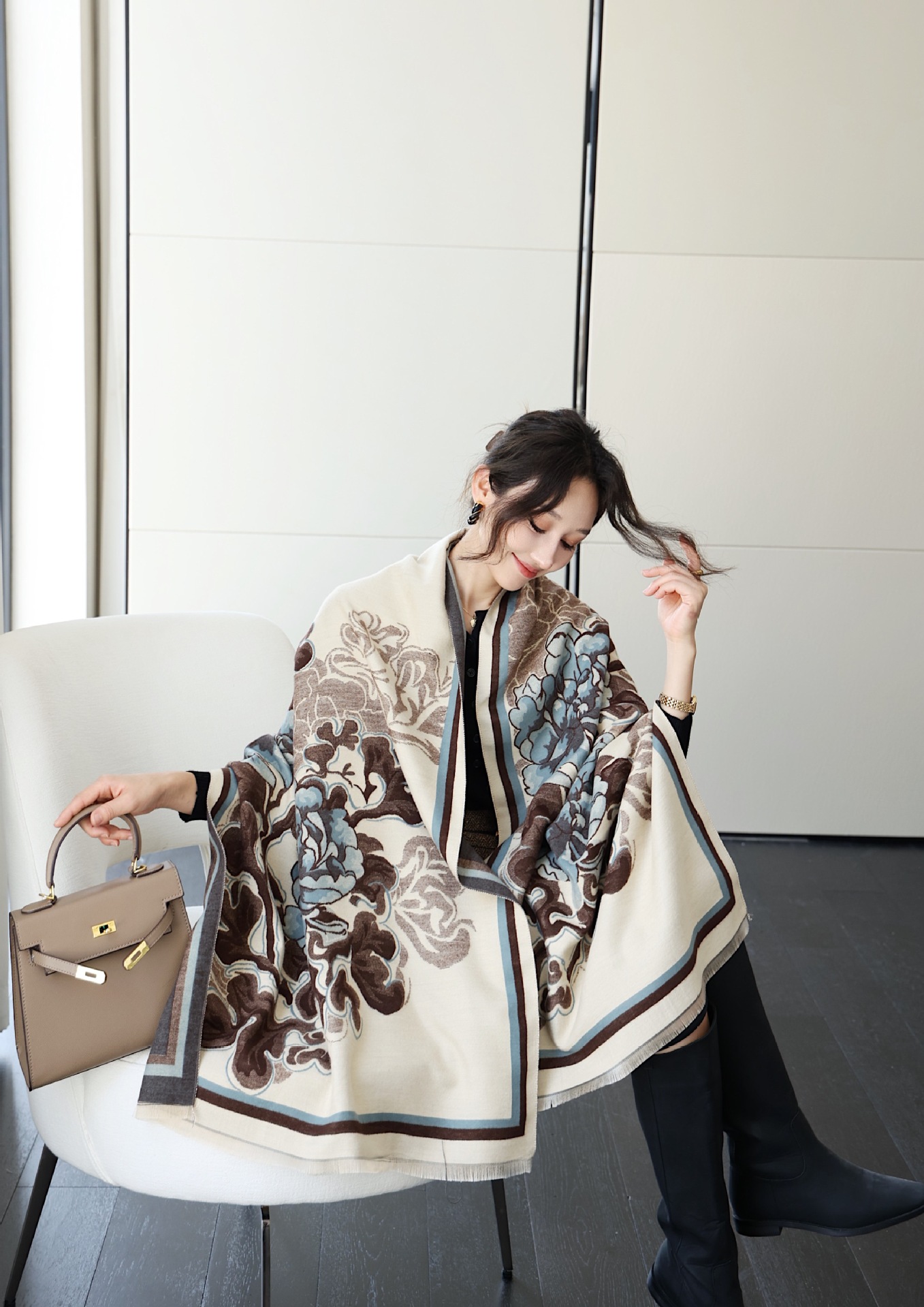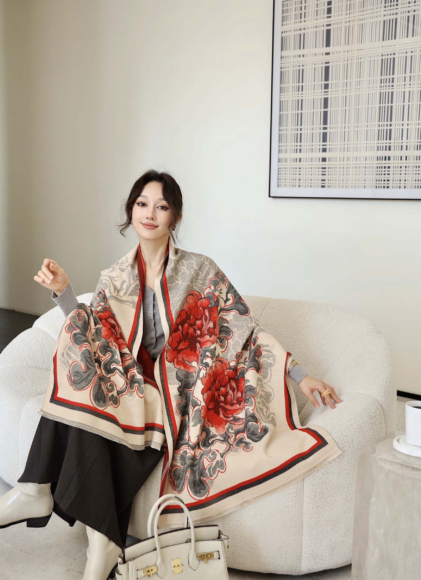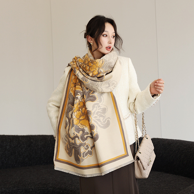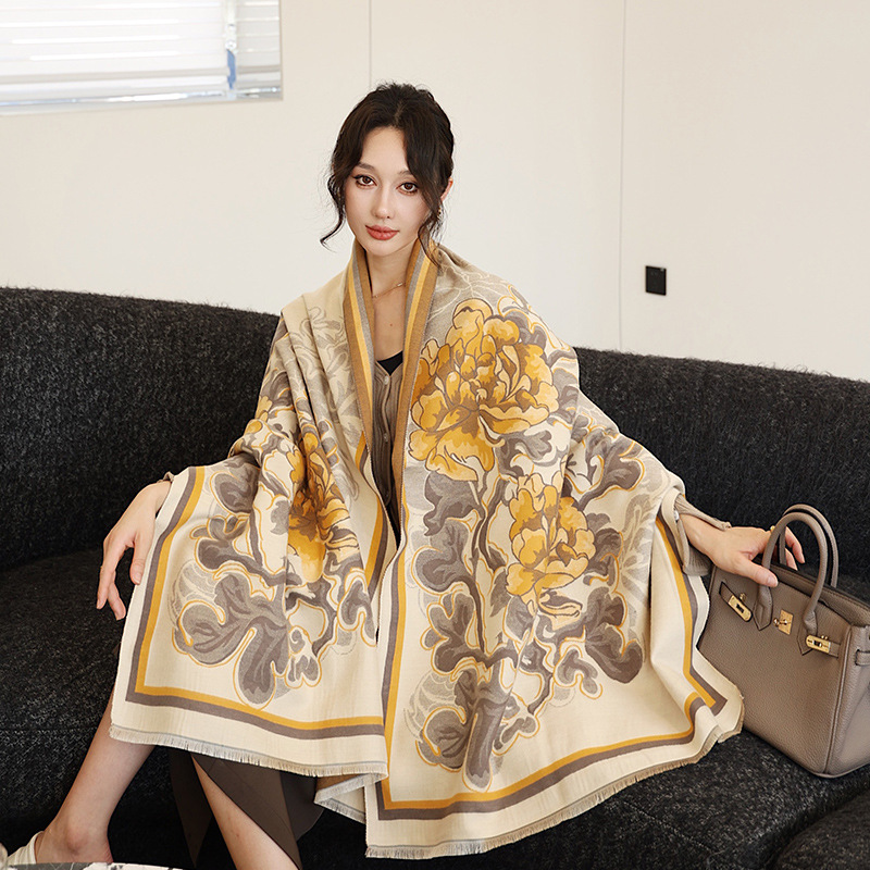우아한 나이를 줄이는 화이트 로즈 프린트 우아한 두꺼운 캐시미어 올 매치 스카프 따뜻한 추위와 방풍