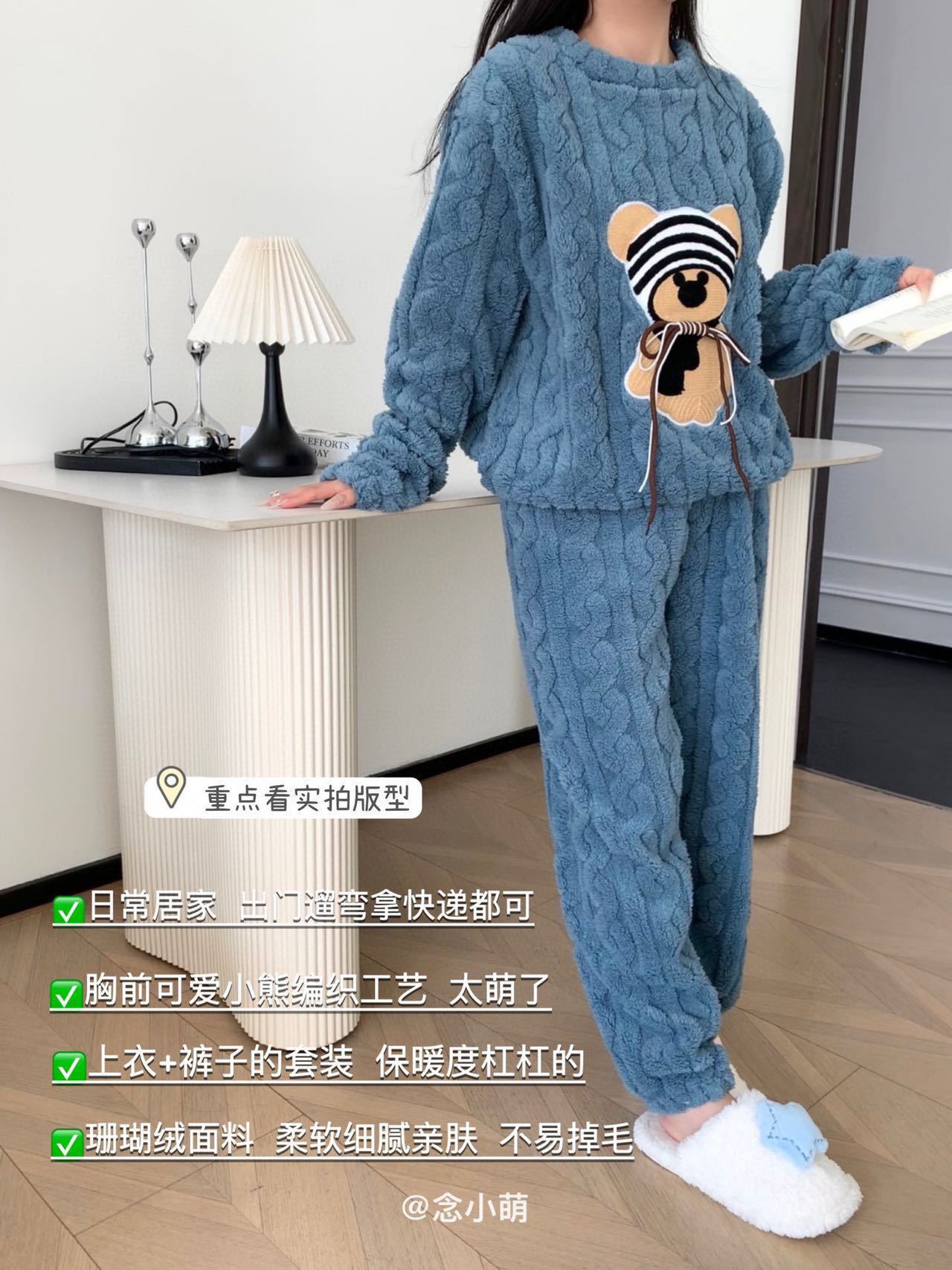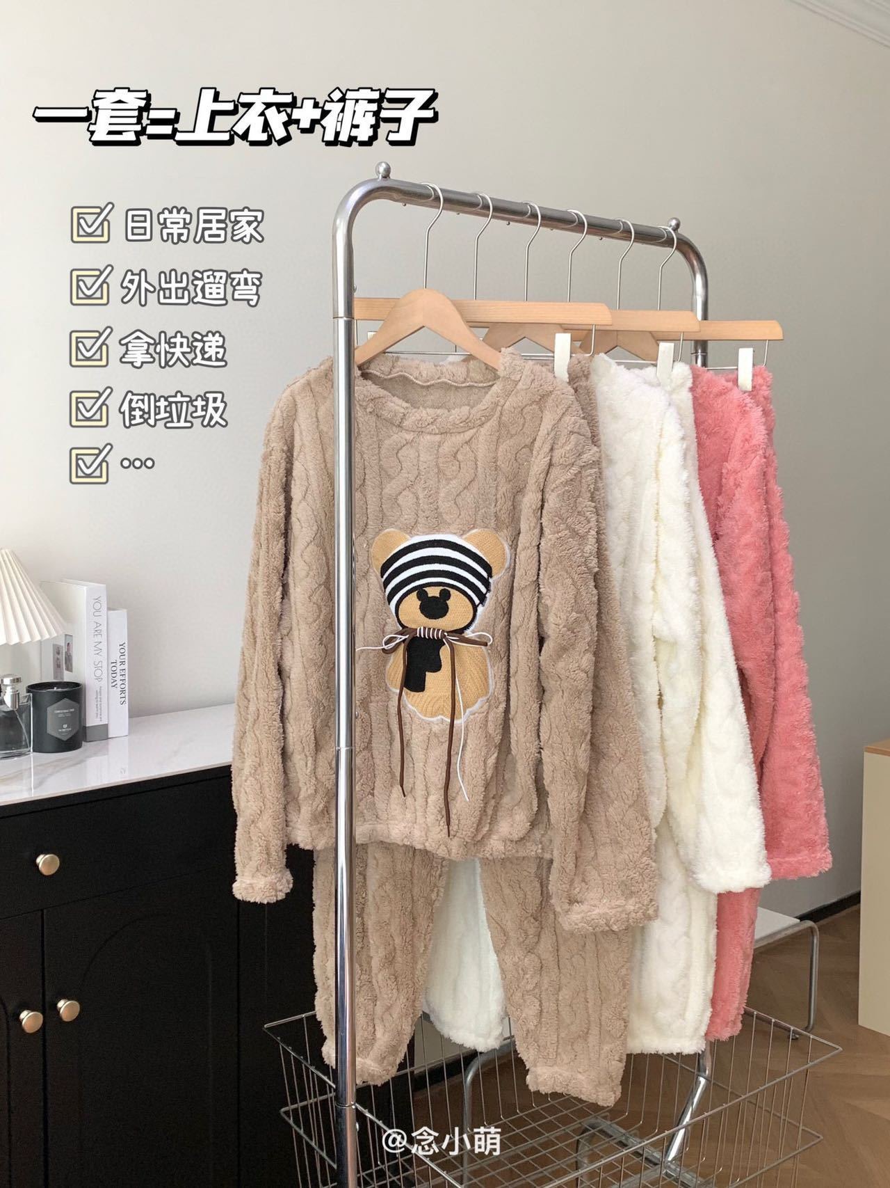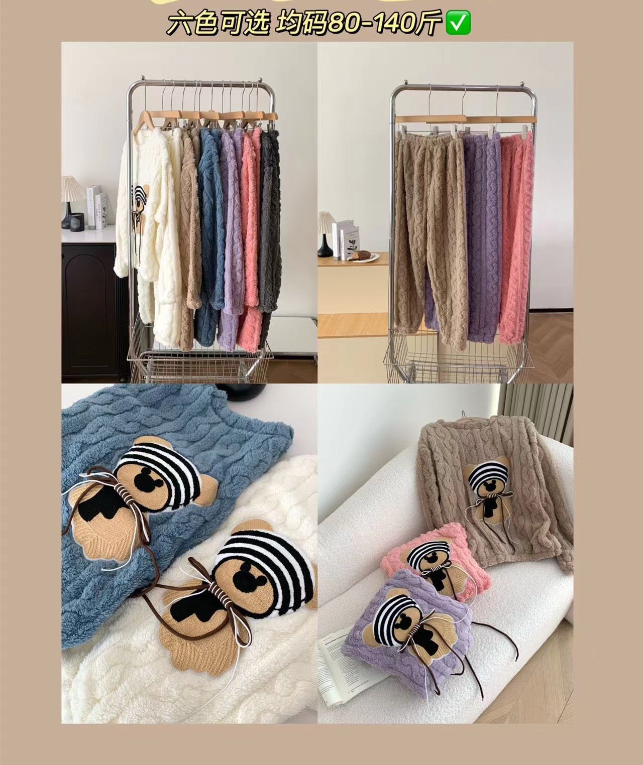 헬로 키티 베어 산호 양털 파자마 겨울 플란넬 두꺼운 바지 달콤한 만화 귀여운 홈 의류 세트스토어 가기