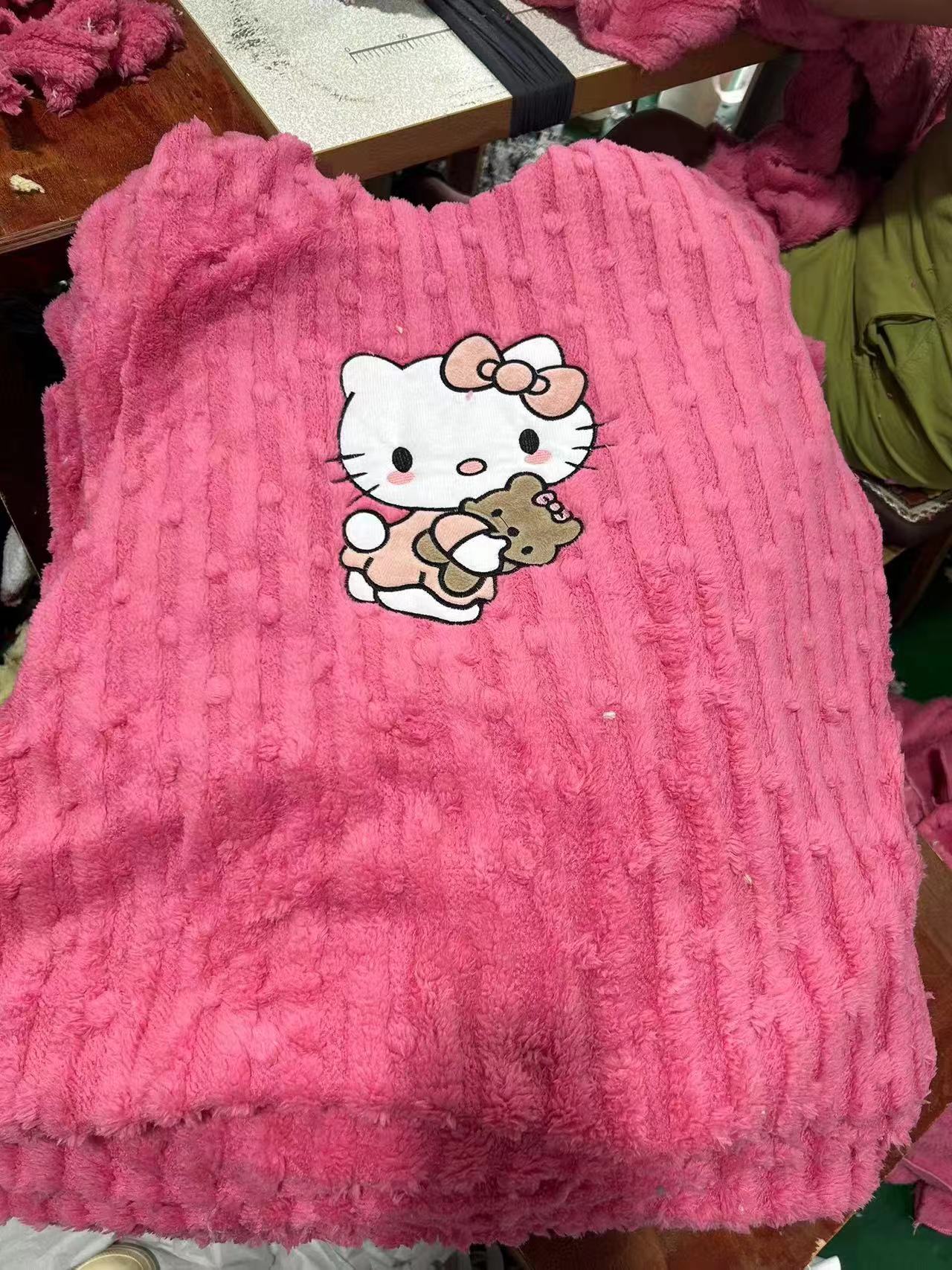 헬로 키티 베어 산호 양털 파자마 겨울 플란넬 두꺼운 바지 달콤한 만화 귀여운 홈 의류 세트