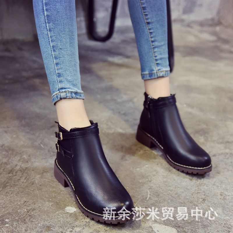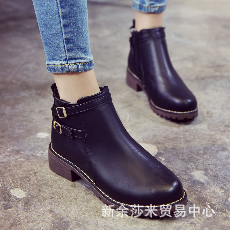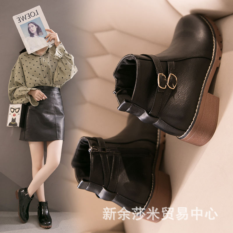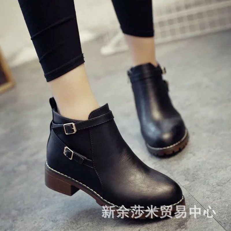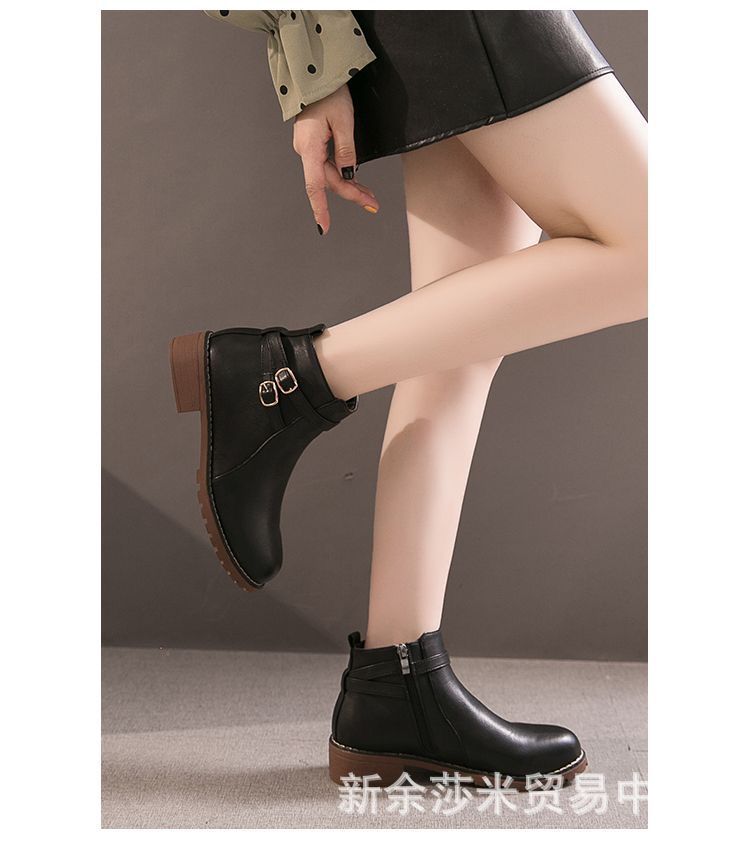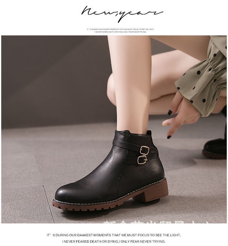 국경 간 마틴 부츠 가을 2024 유럽과 미국 스타일의 새로운 라운드 헤드 중간 두꺼운 힐 패션 벨트 버클 단색 낮은 부츠스토어 가기
