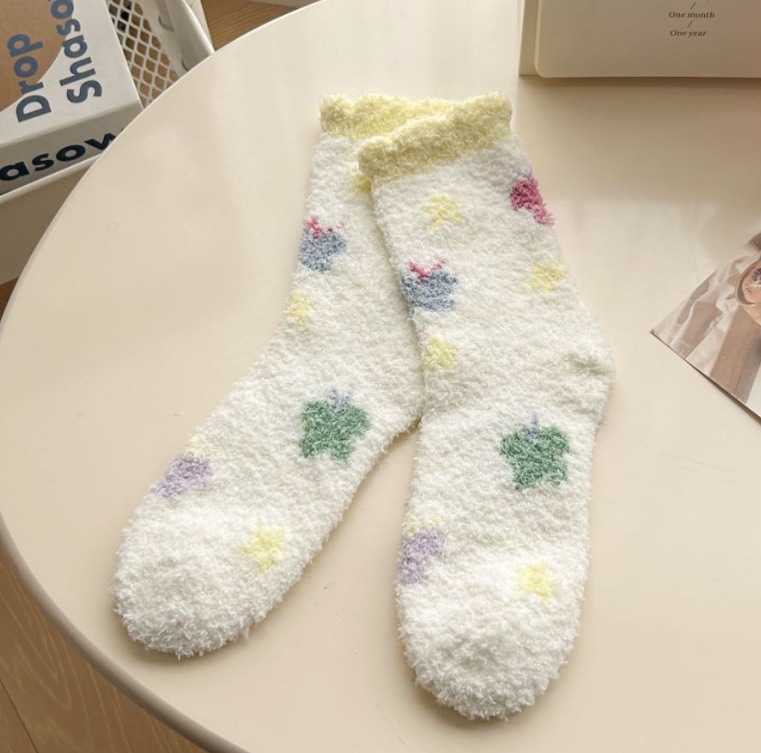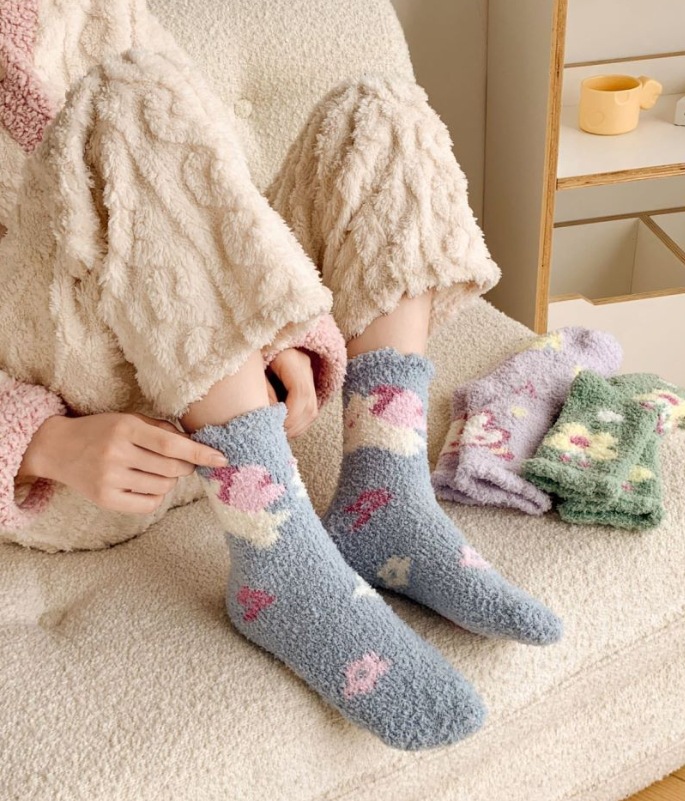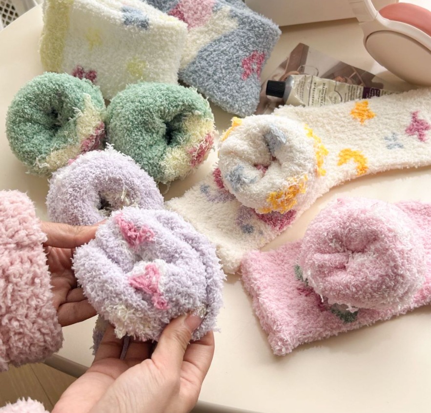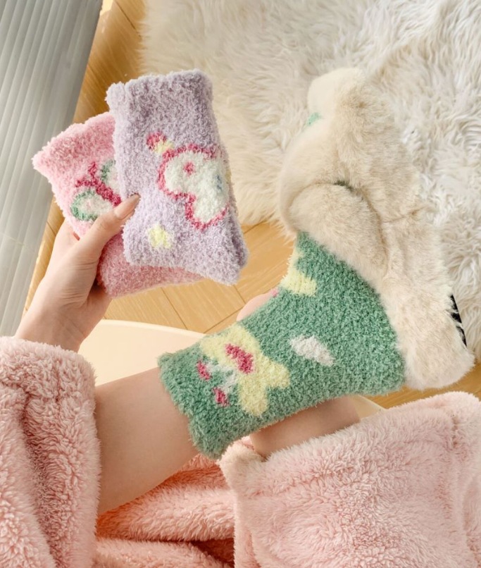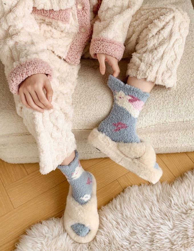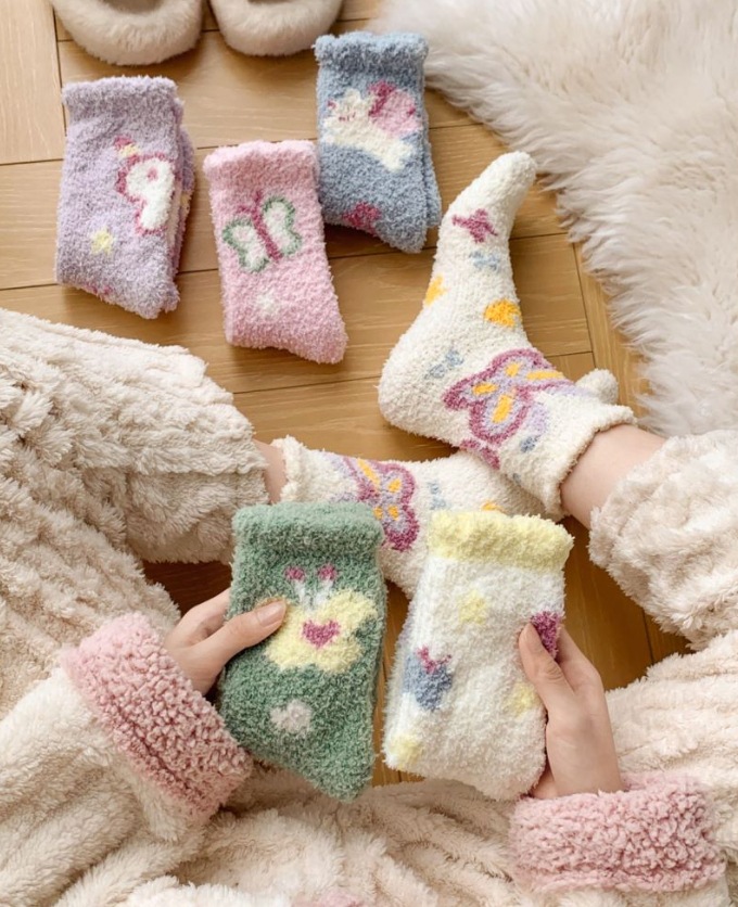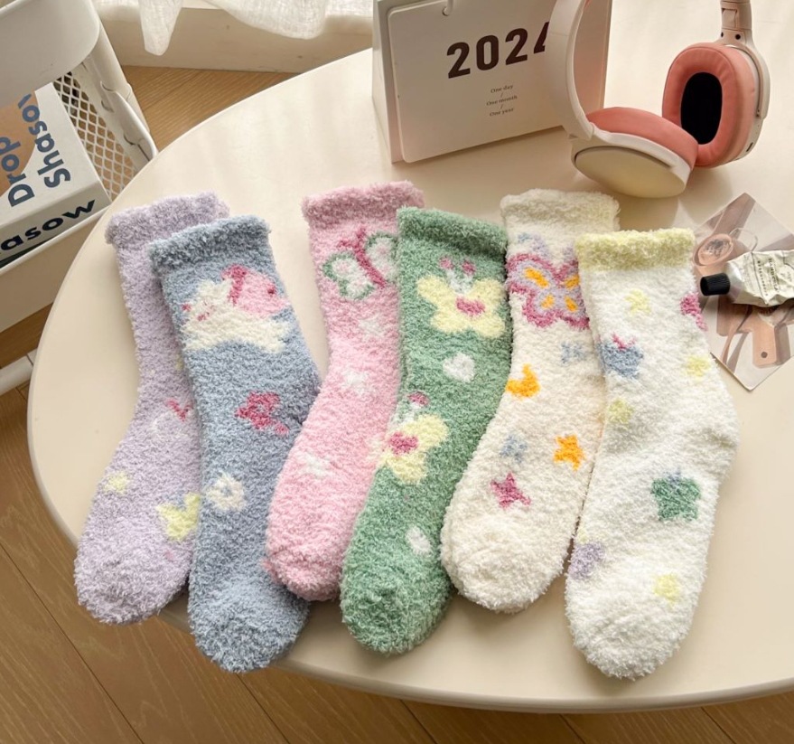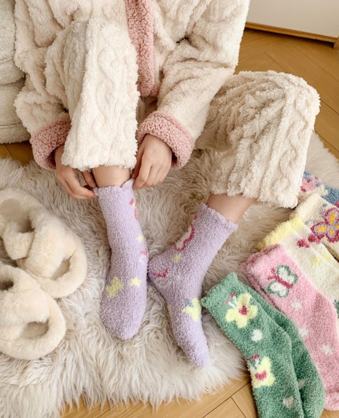 가을과 겨울 새로운 산호 양털 여성용 양말 두꺼운 따뜻한 가정 수면 양말 만화 나비 여성용 양말 바닥 양말스토어 가기