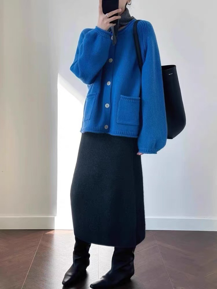 克莱因蓝针织开衫毛衣外套女早春宽松慵懒风设计感小众灯笼袖上衣
