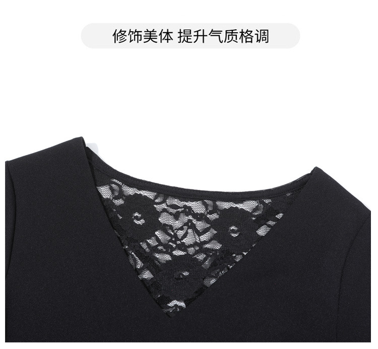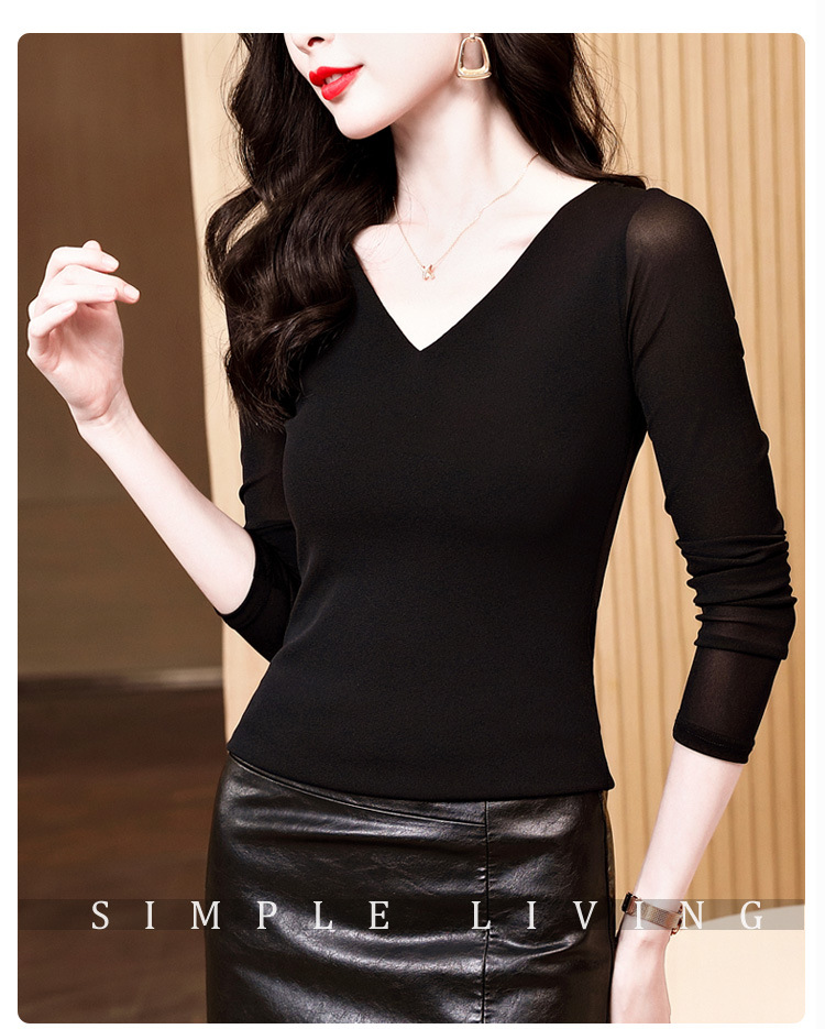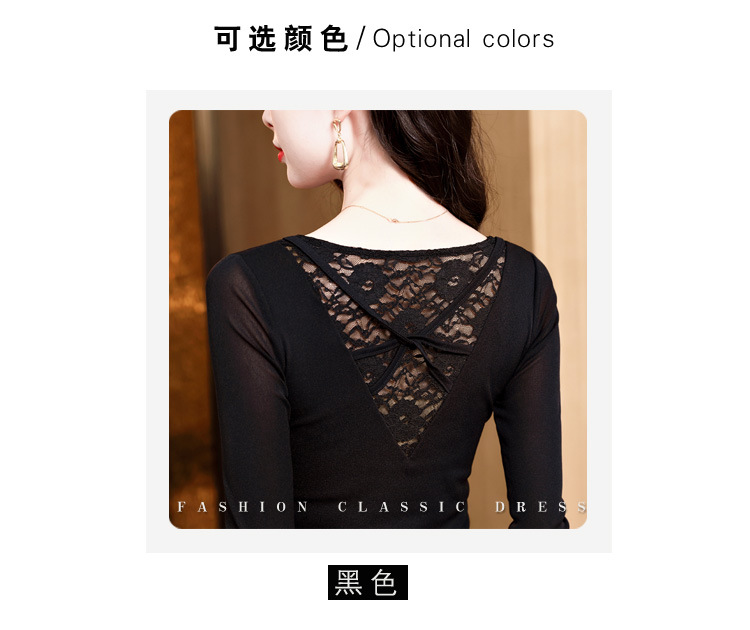 2024 가을 새로운 기질 조커 플러스 사이즈 V-넥 블랙 레이스 스티칭 메쉬 긴 소매 바닥 티셔츠 여성 도매