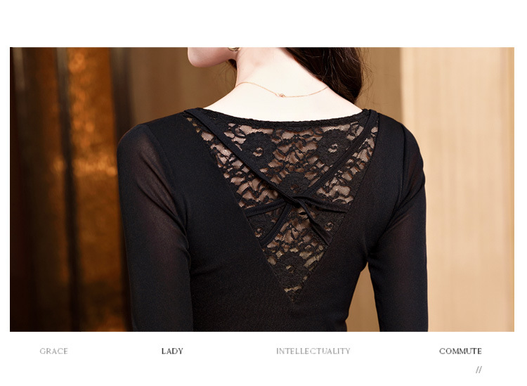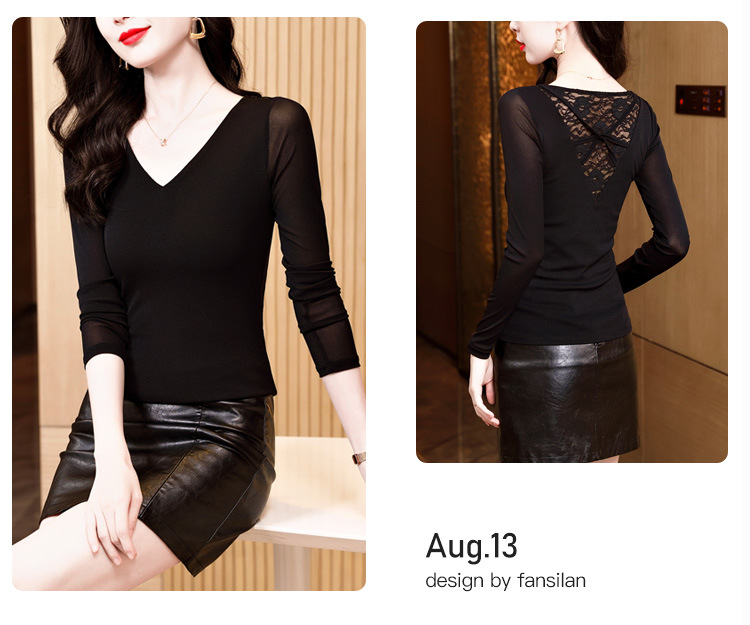 2024 가을 새로운 기질 조커 플러스 사이즈 V-넥 블랙 레이스 스티칭 메쉬 긴 소매 바닥 티셔츠 여성 도매스토어 가기