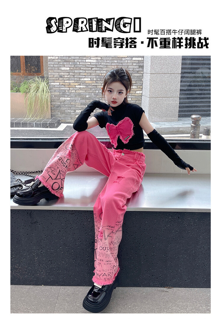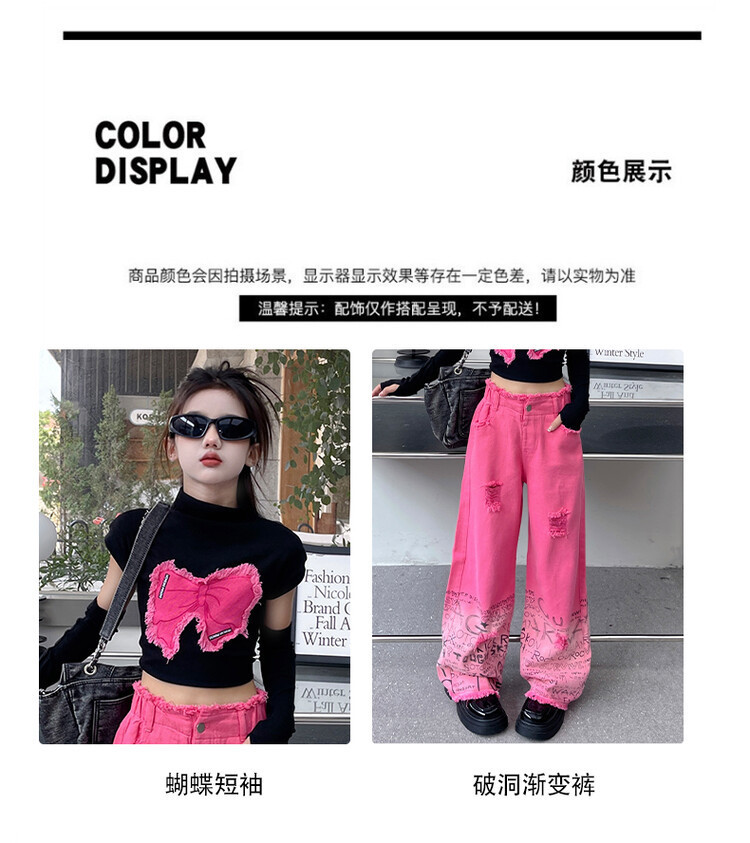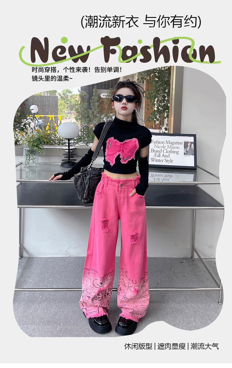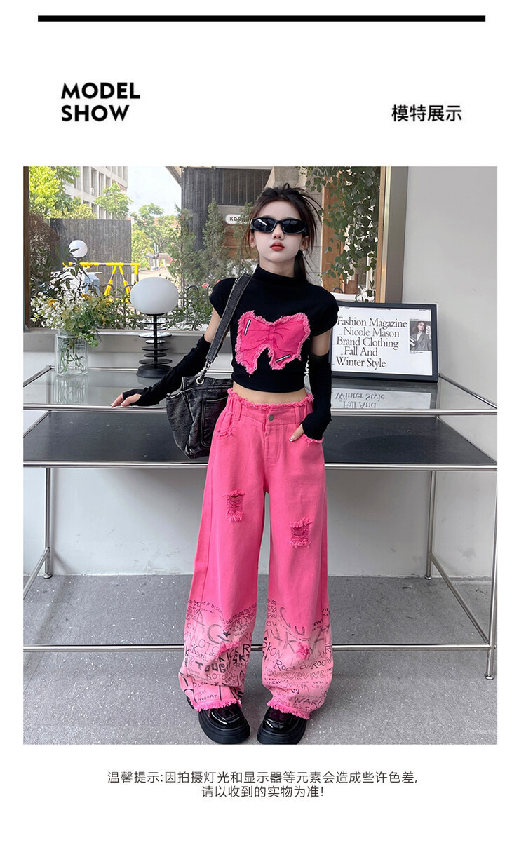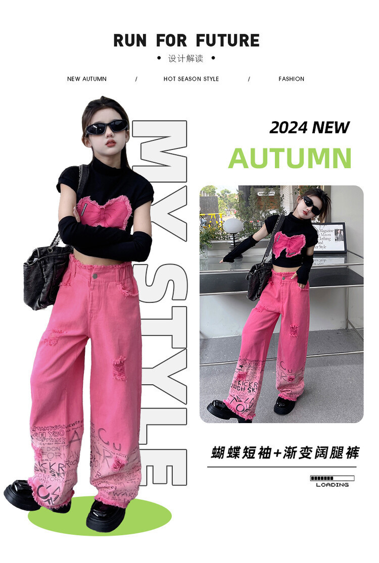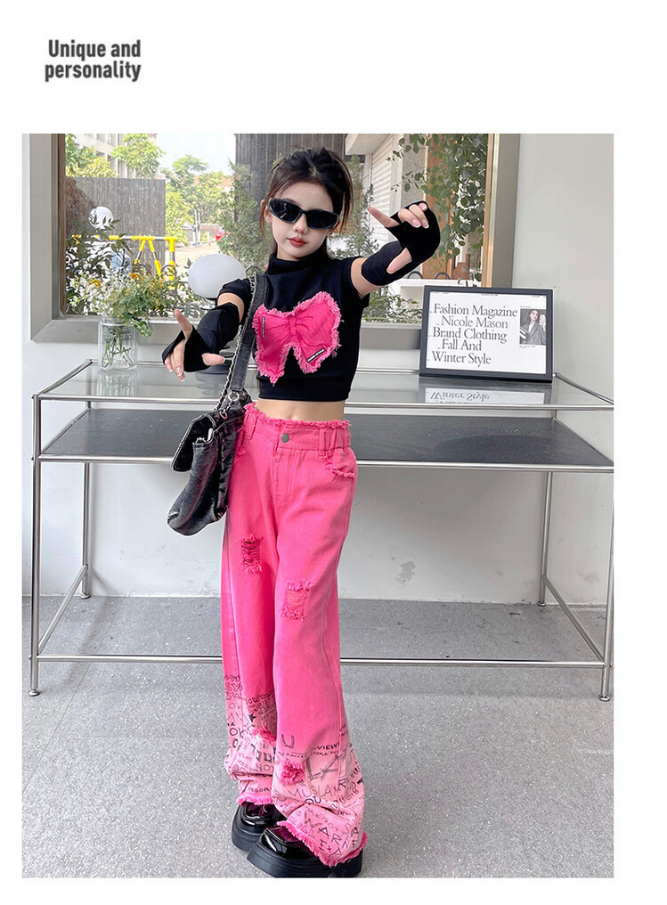 대외 무역 타이드 퀴어 아동복 소녀 점진적 변화 세트 한 팬 Zhong Da 어린이 유행 깨진 소매 티셔츠 와이드 레그 바지 투피스 세트스토어 가기